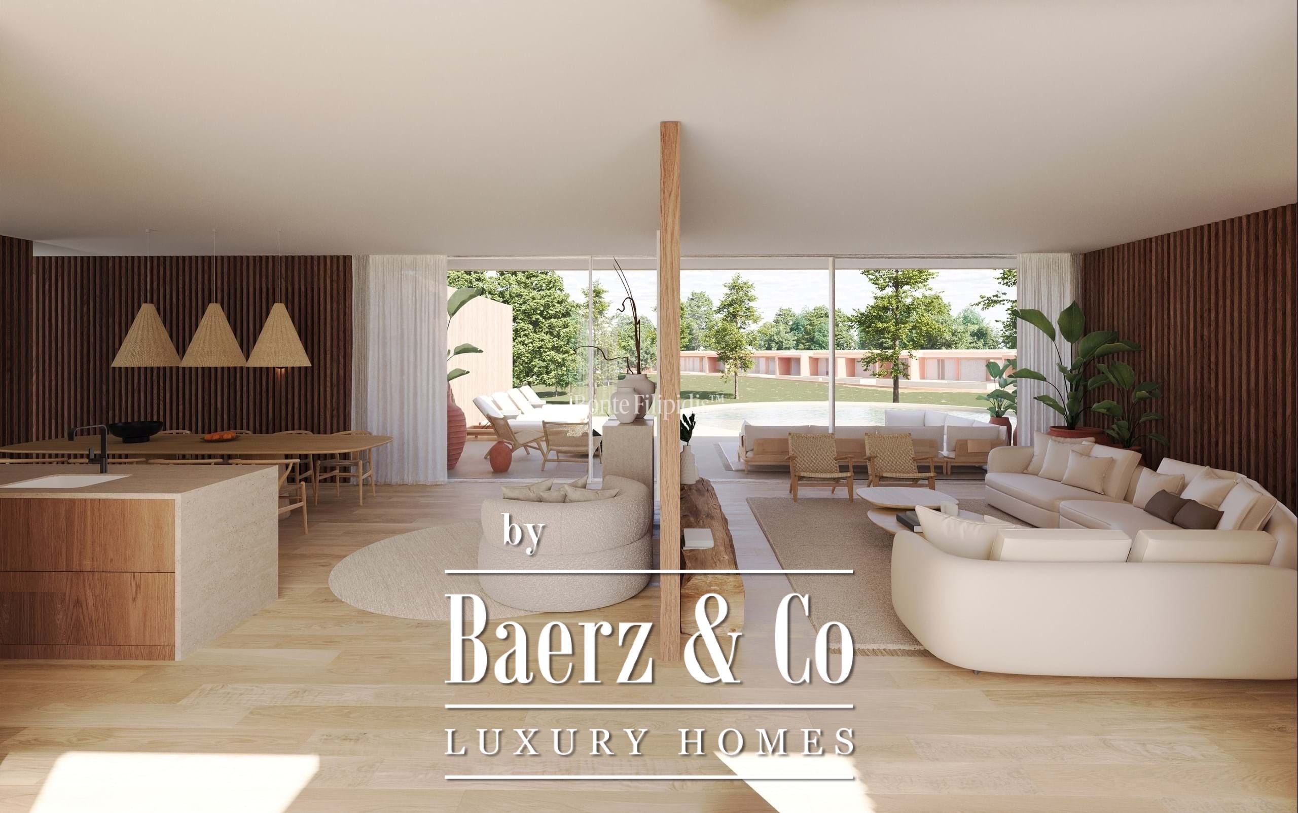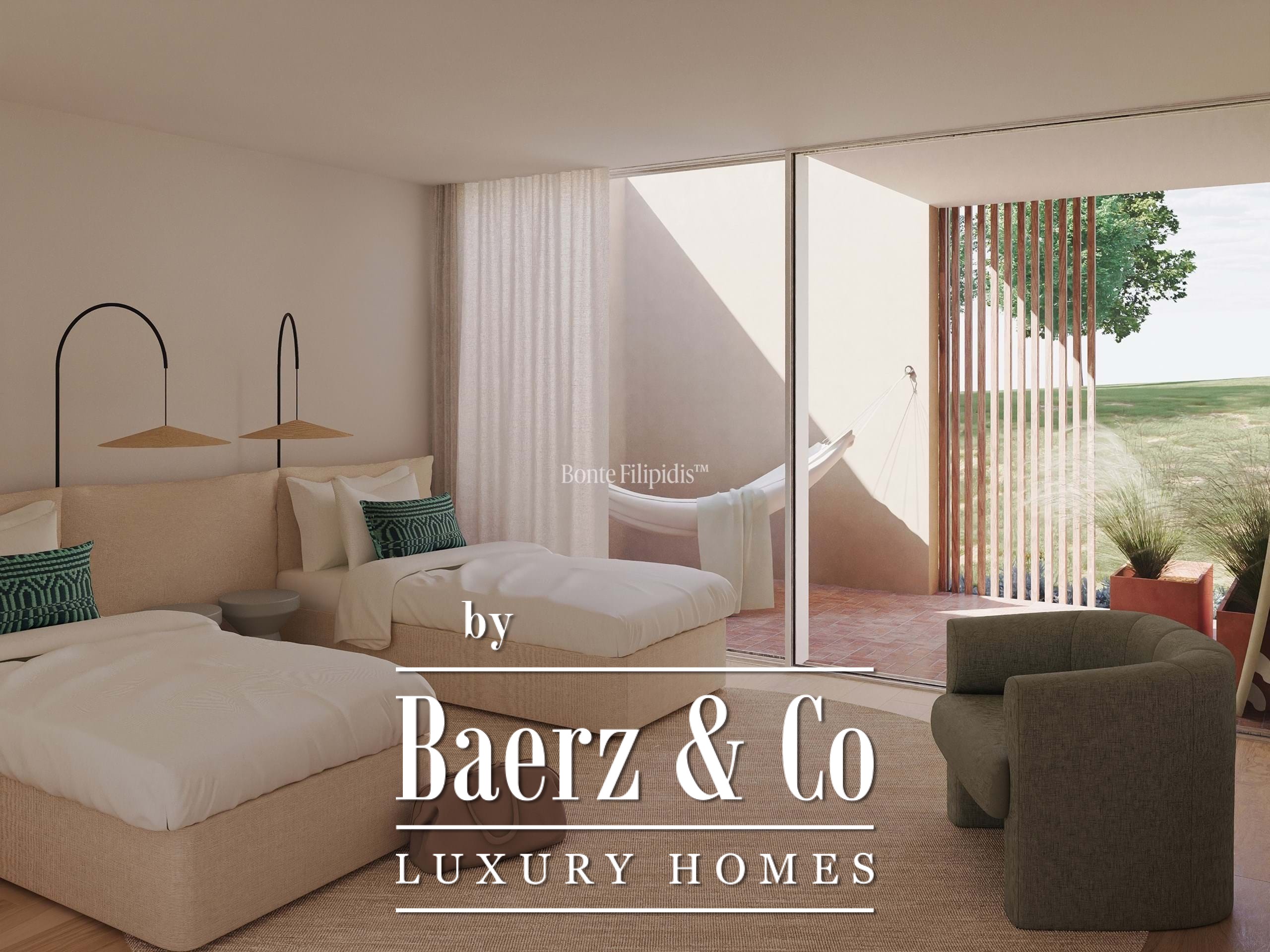 Large outdoor areas encompass 112 m², anchored by a private pool of 83 m², inviting extended afternoons in the sun or quiet mornings beside the water. Each residence is curated with considered materials, wood and stone lending a sense of authenticity and warmth, while architecture by WEWOOD balances functionality and refined style. Expansive terraces look out toward rural vistas, creating a retreat for contemplative breakfasts or evening gatherings in complete privacy.