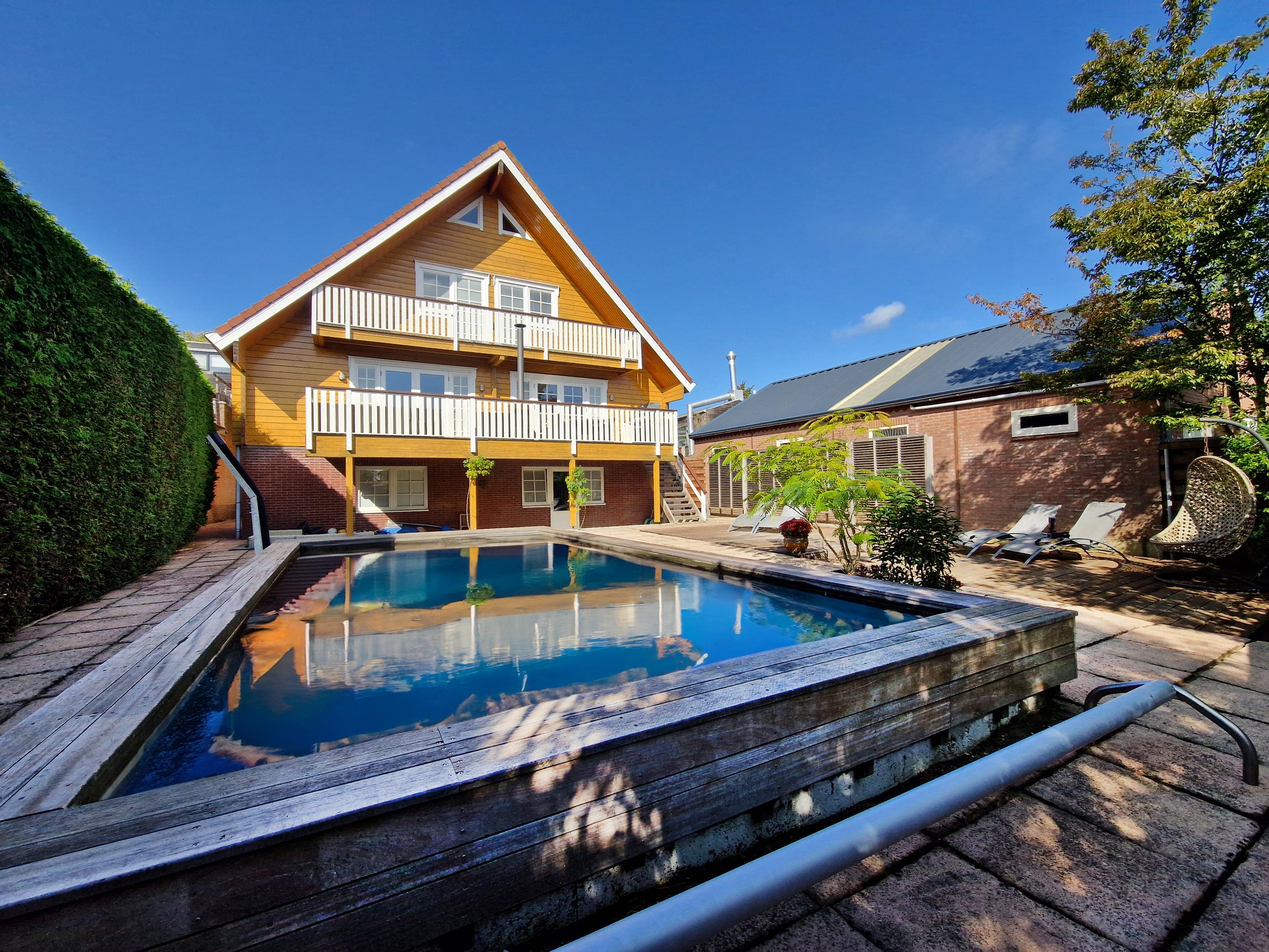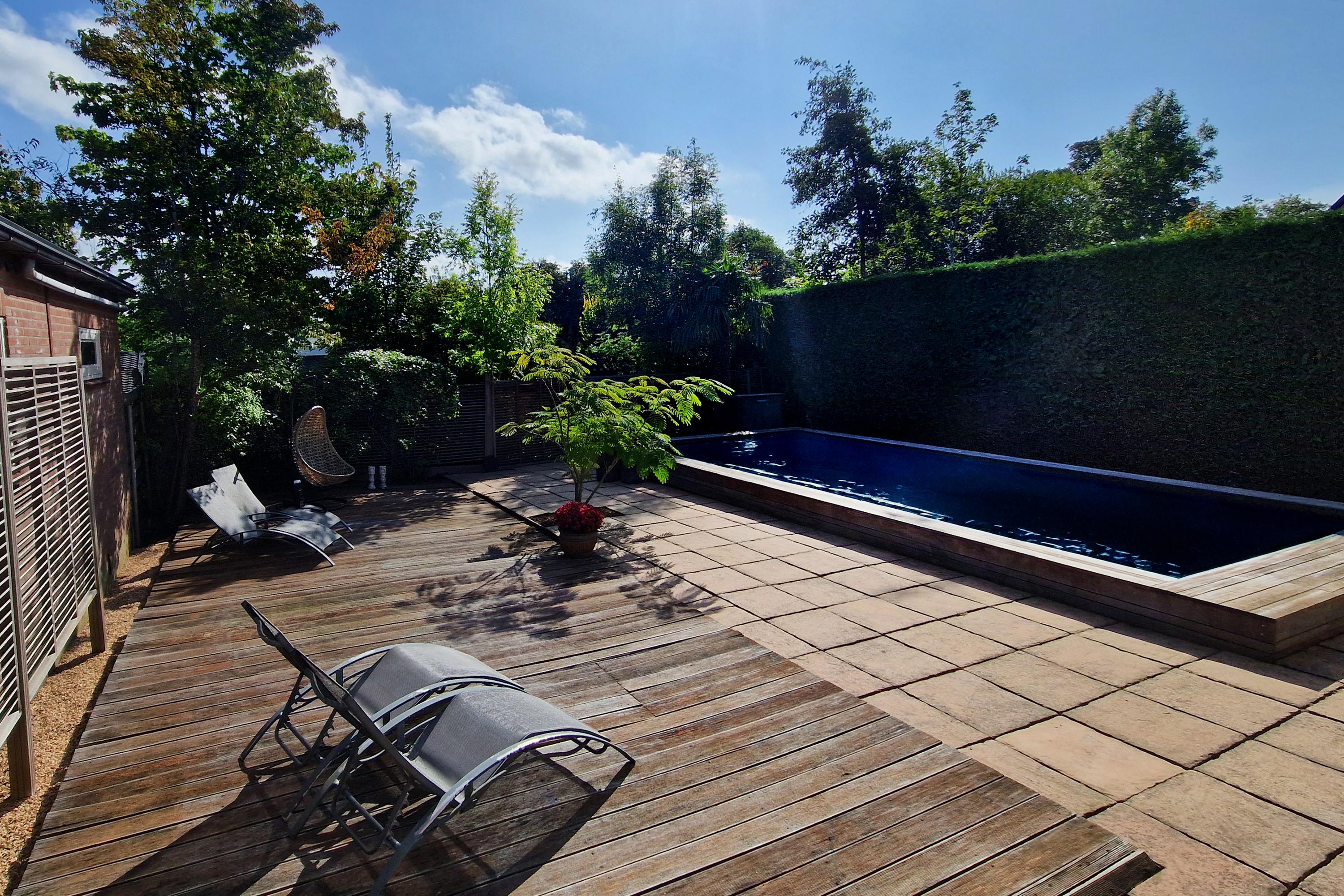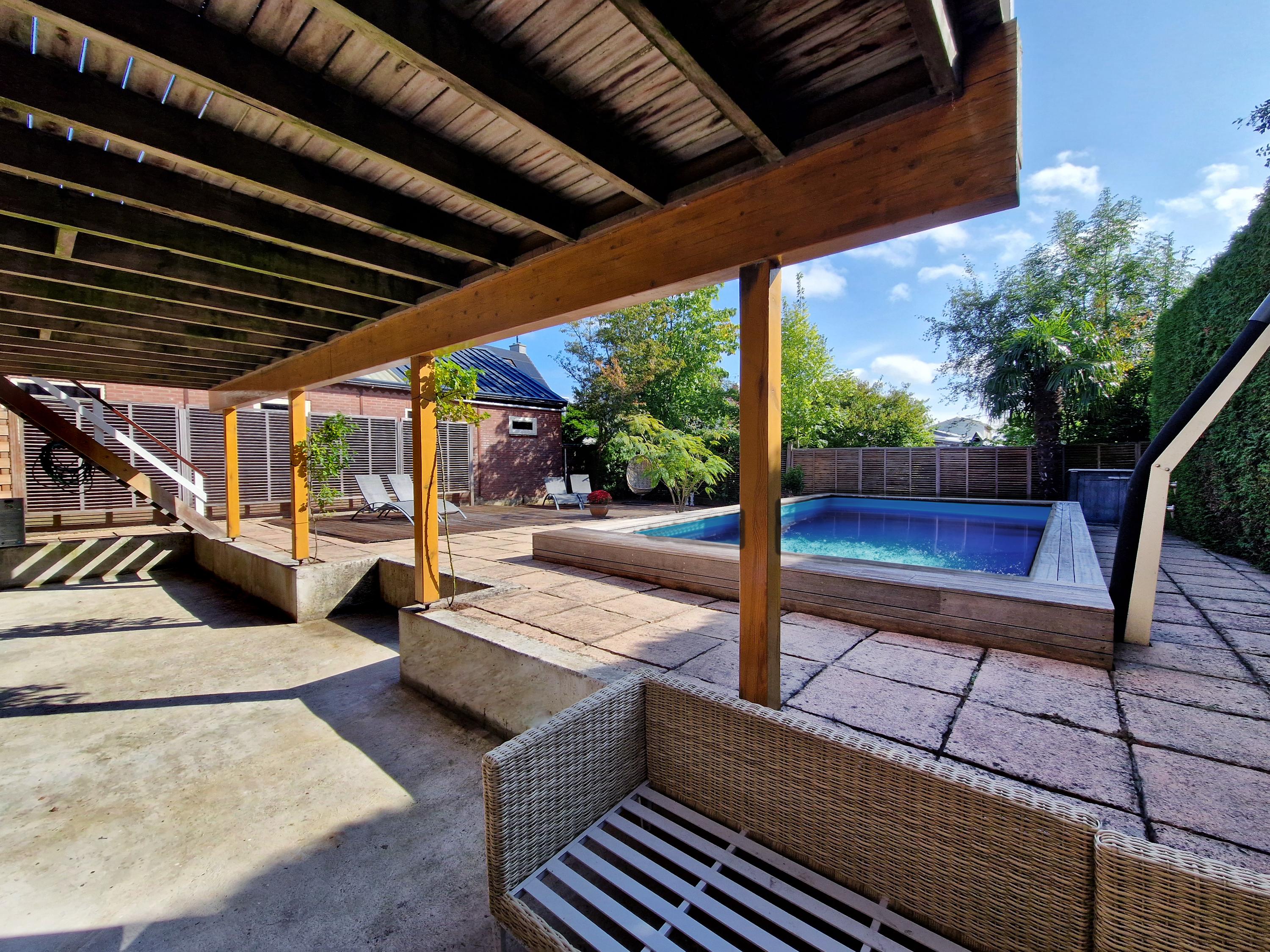 The backyard, facing east, offers the perfect combination of relaxation and luxury. Start your day with the first rays of sunshine on the spacious terrace, perfect for a cozy breakfast or long summer evenings. The large swimming pool invites you for a refreshing dip and provides endless fun on sunny days. Here, you experience ultimate living comfort, enjoying many hours of sunshine in your own private paradise with complete privacy!