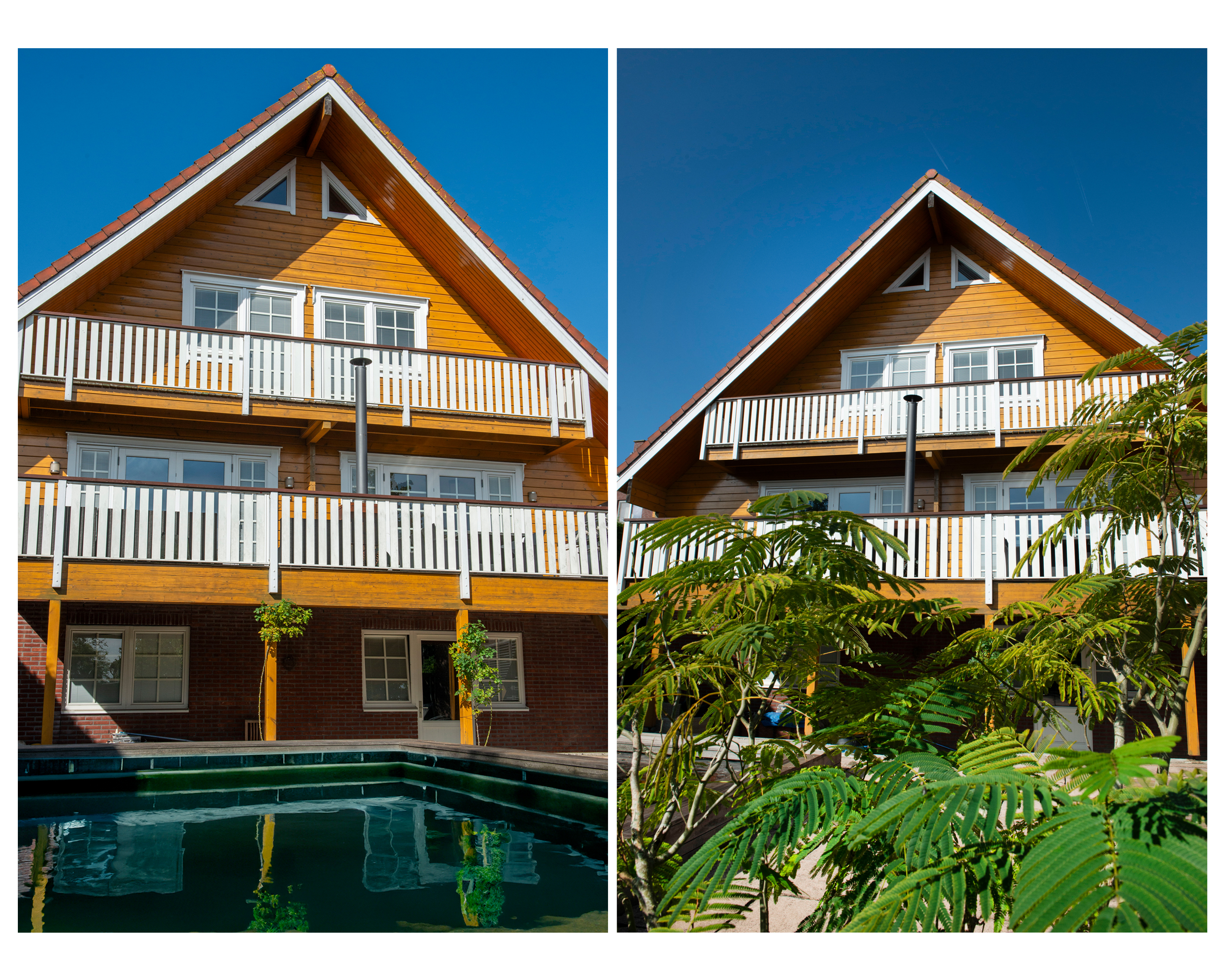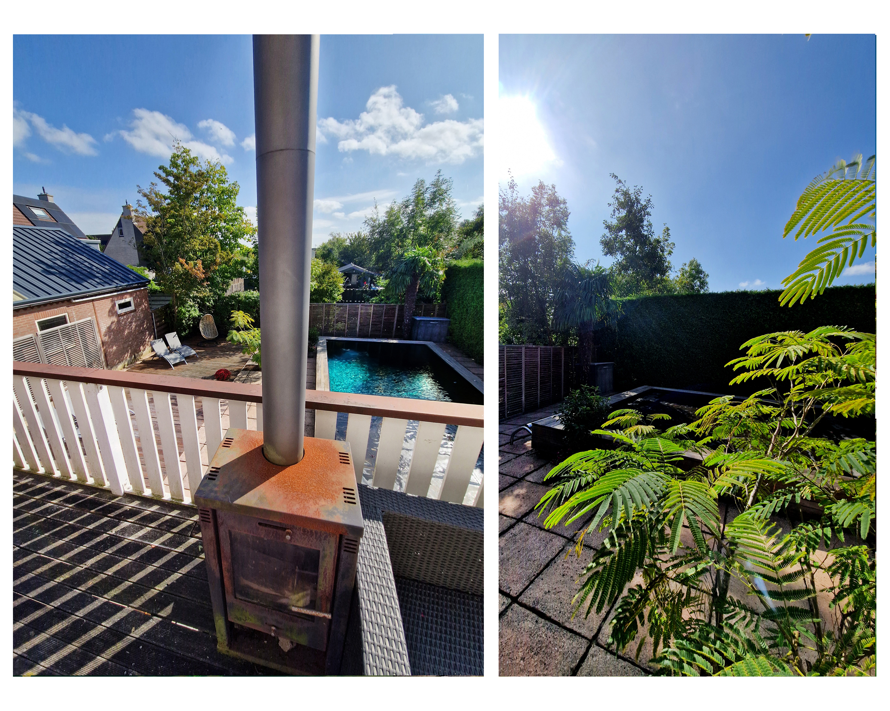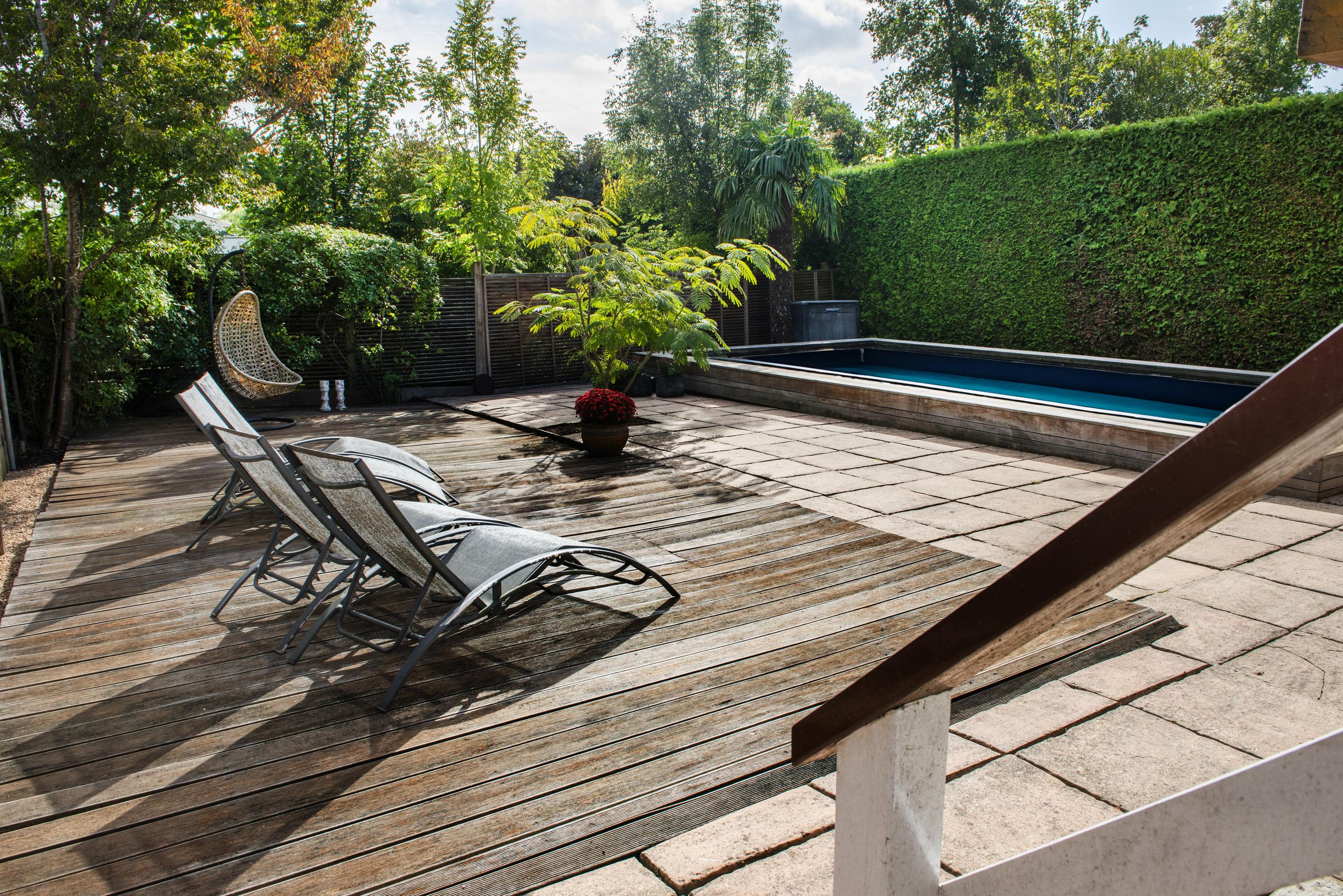 The backyard, facing east, offers the perfect combination of relaxation and luxury. Start your day with the first rays of sunshine on the spacious terrace, perfect for a cozy breakfast or long summer evenings. The large swimming pool invites you for a refreshing dip and provides endless fun on sunny days. Here, you experience ultimate living comfort, enjoying many hours of sunshine in your own private paradise with complete privacy!