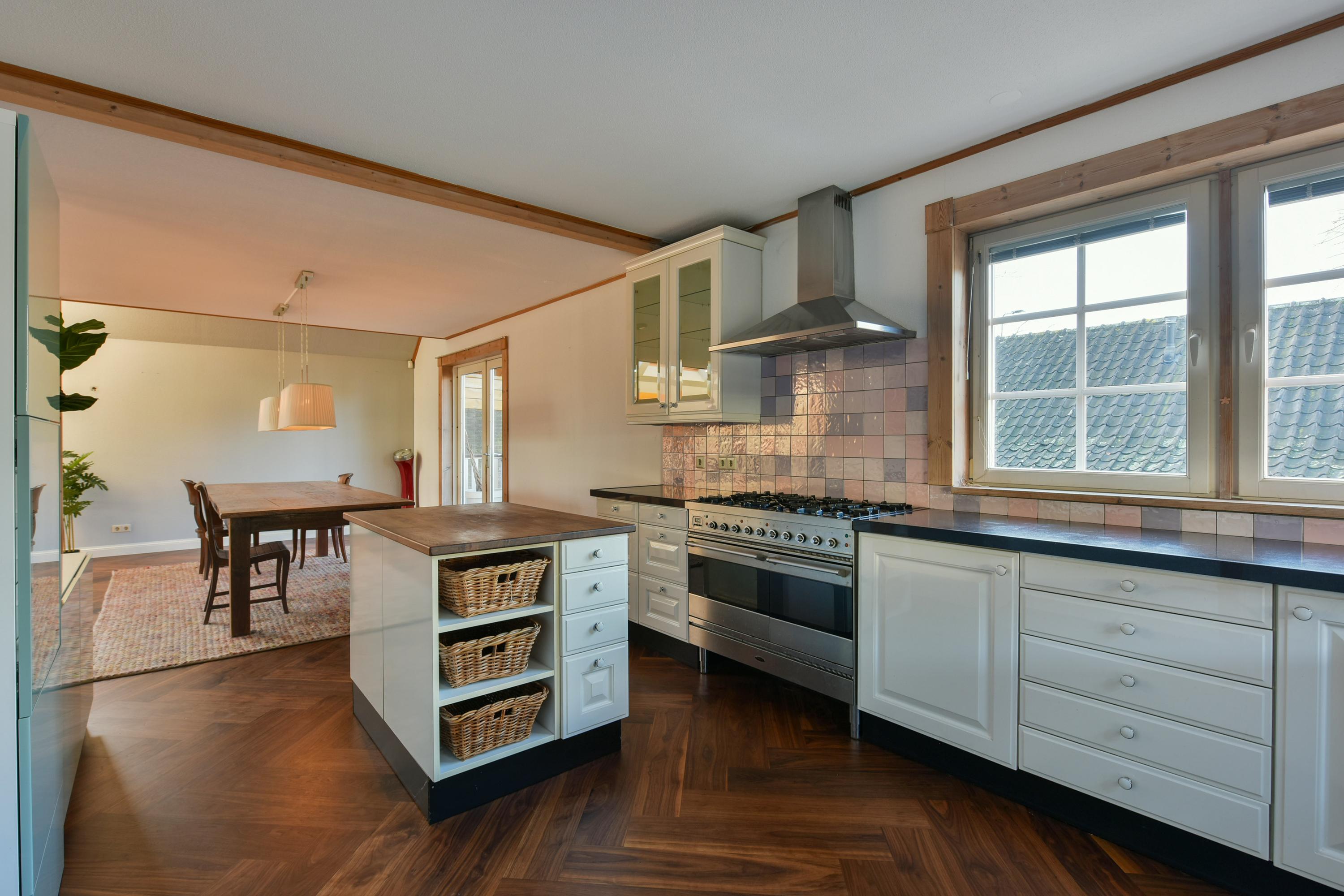 From the spacious, open dining area, with French doors to the veranda at the front of the house, you enter the large, open kitchen. This kitchen is a dream for any cooking enthusiast, equipped with a luxury Boretti gas stove with double oven, a cooking island, a Whirlpool dishwasher, a large countertop with double sinks and a vegetable prep sink, and plenty of cupboard and work space. Cooking here is a true joy! The kitchen features two large windows offering a beautiful view of the veranda and the courtyard. The veranda faces west, providing a delightful space to unwind after a long workday with a glass of wine, enjoying the evening sun.