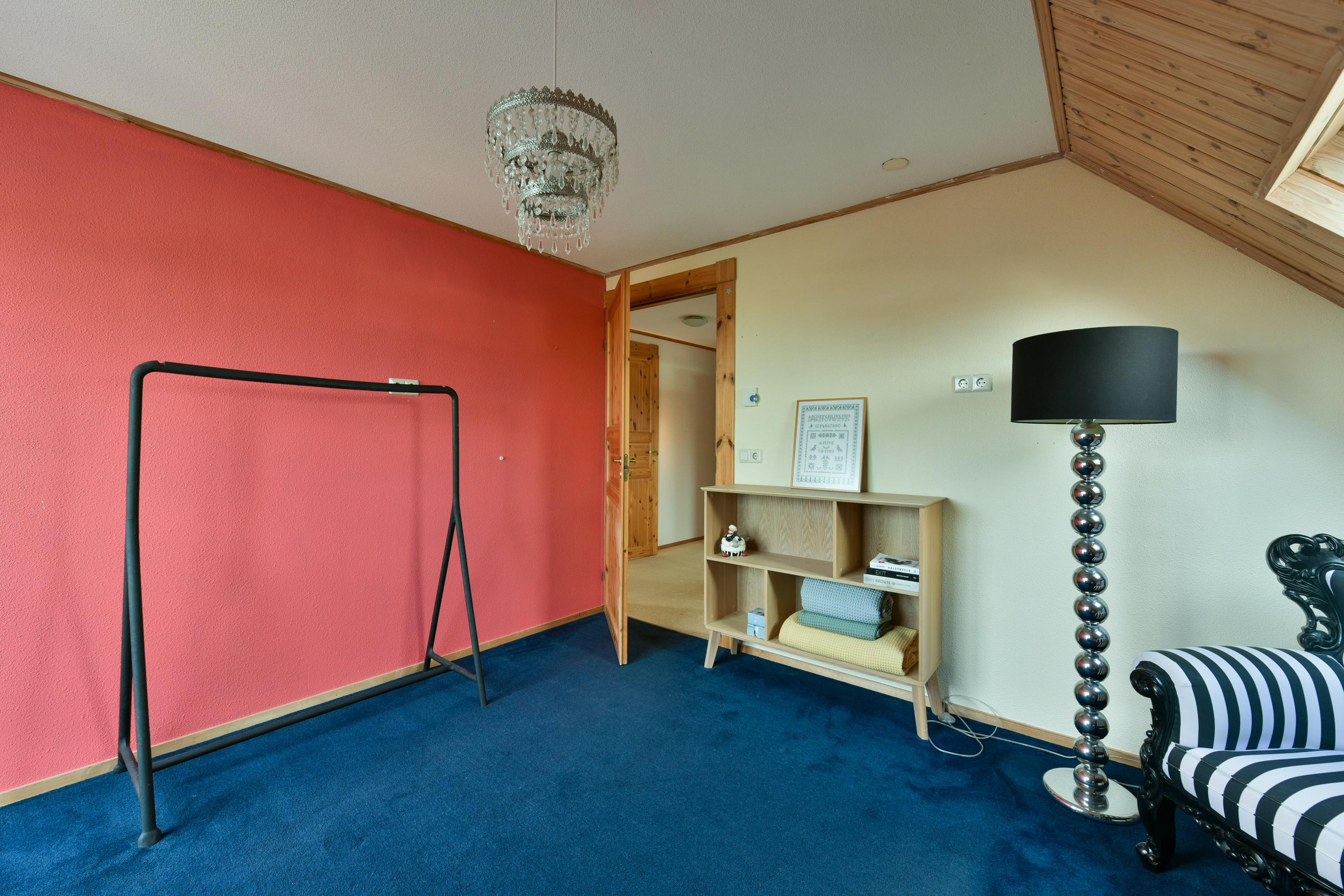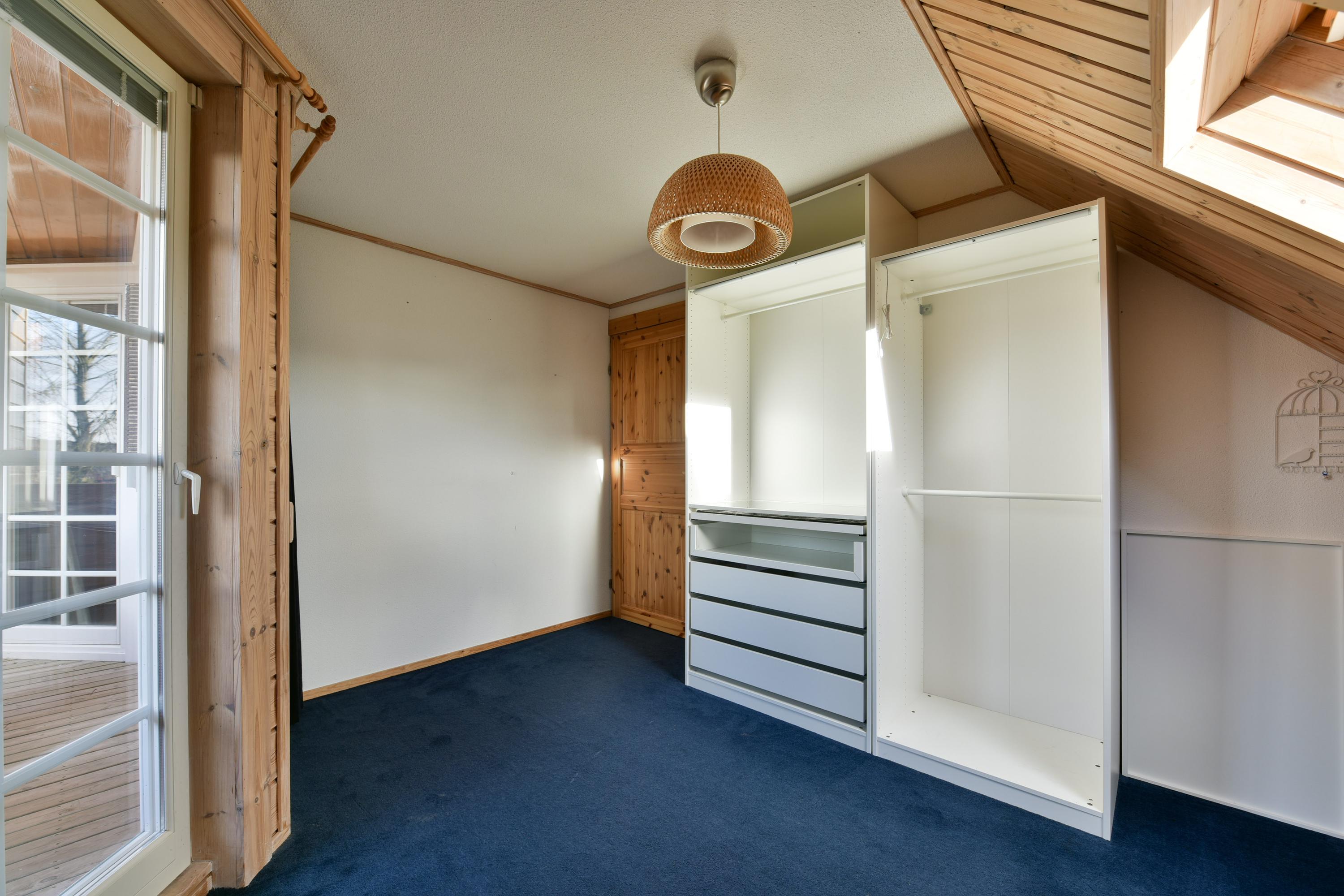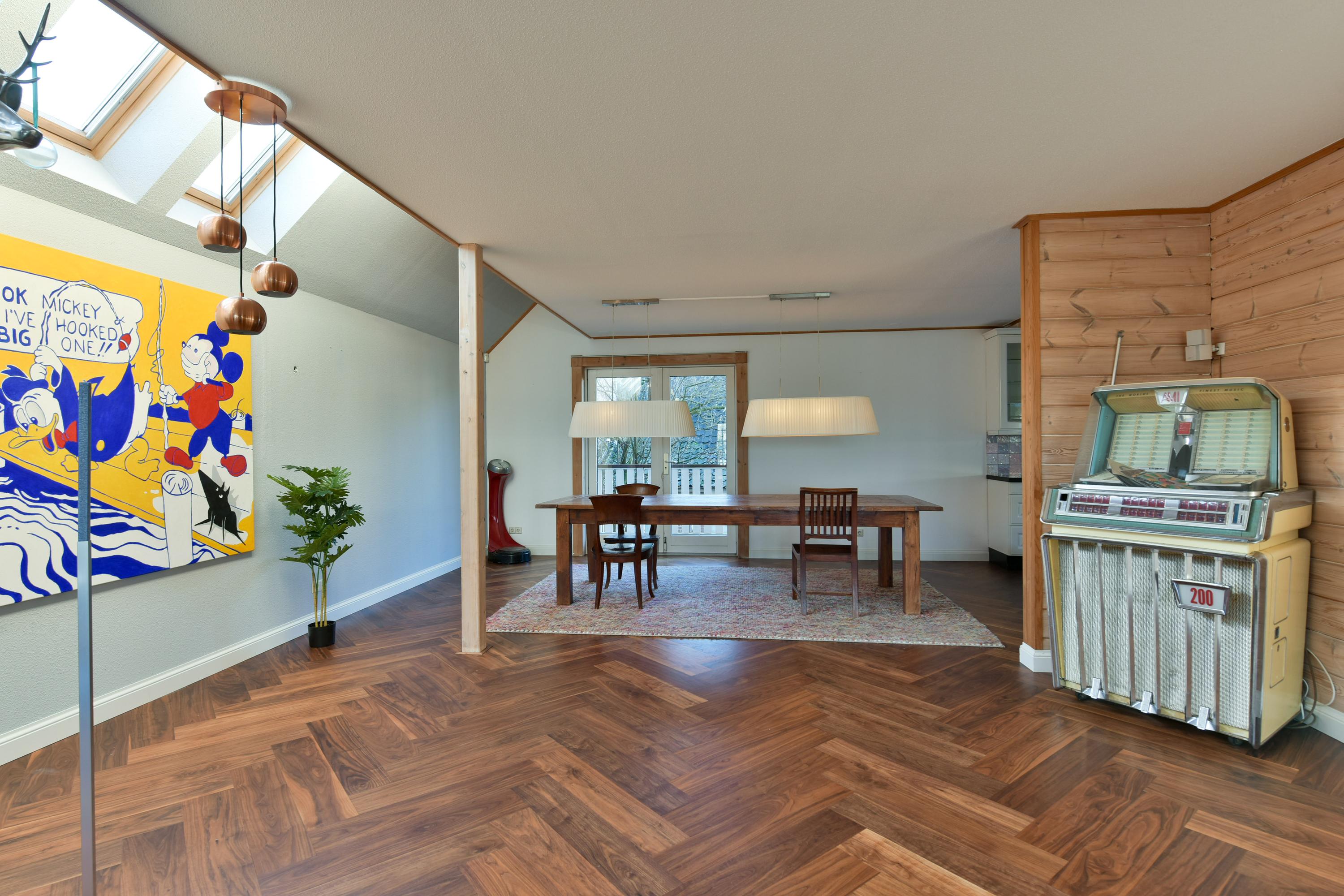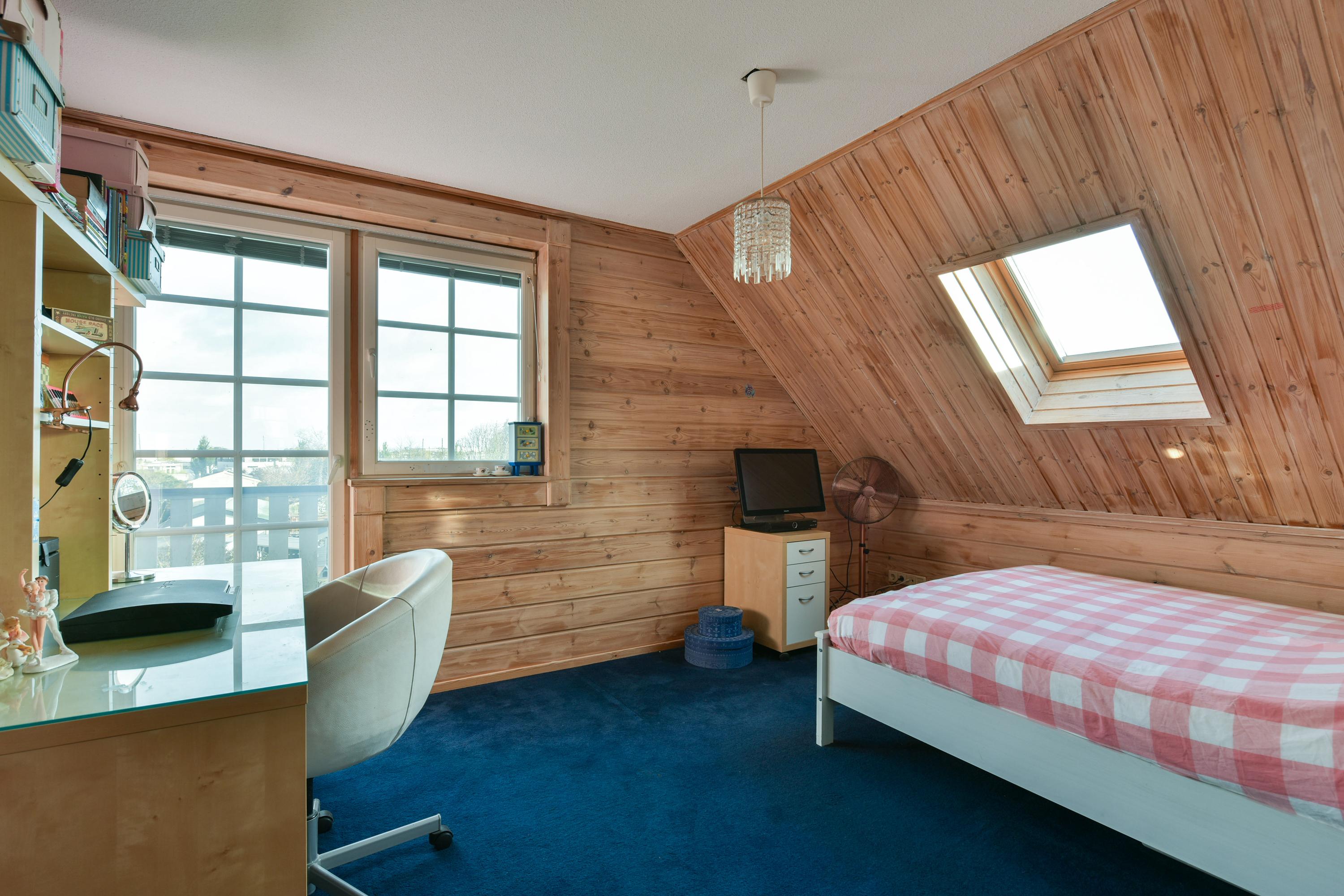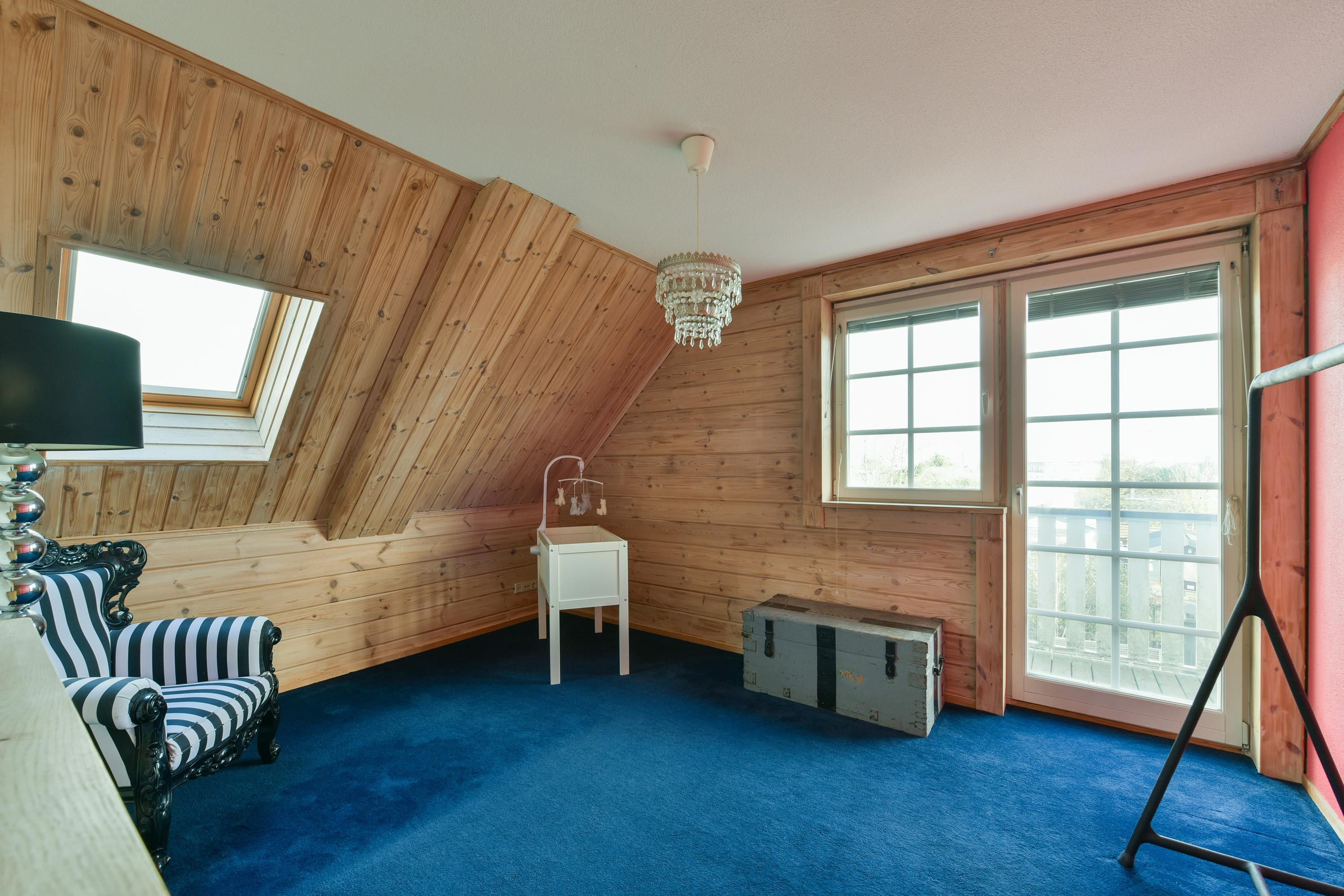 The attic floor is accessible via a fixed staircase and offers a large, multifunctional space, ideal as a hobby or fitness room, with plenty of daylight. This floor also houses the central heating system, heat pump, and control system for the solar panels.