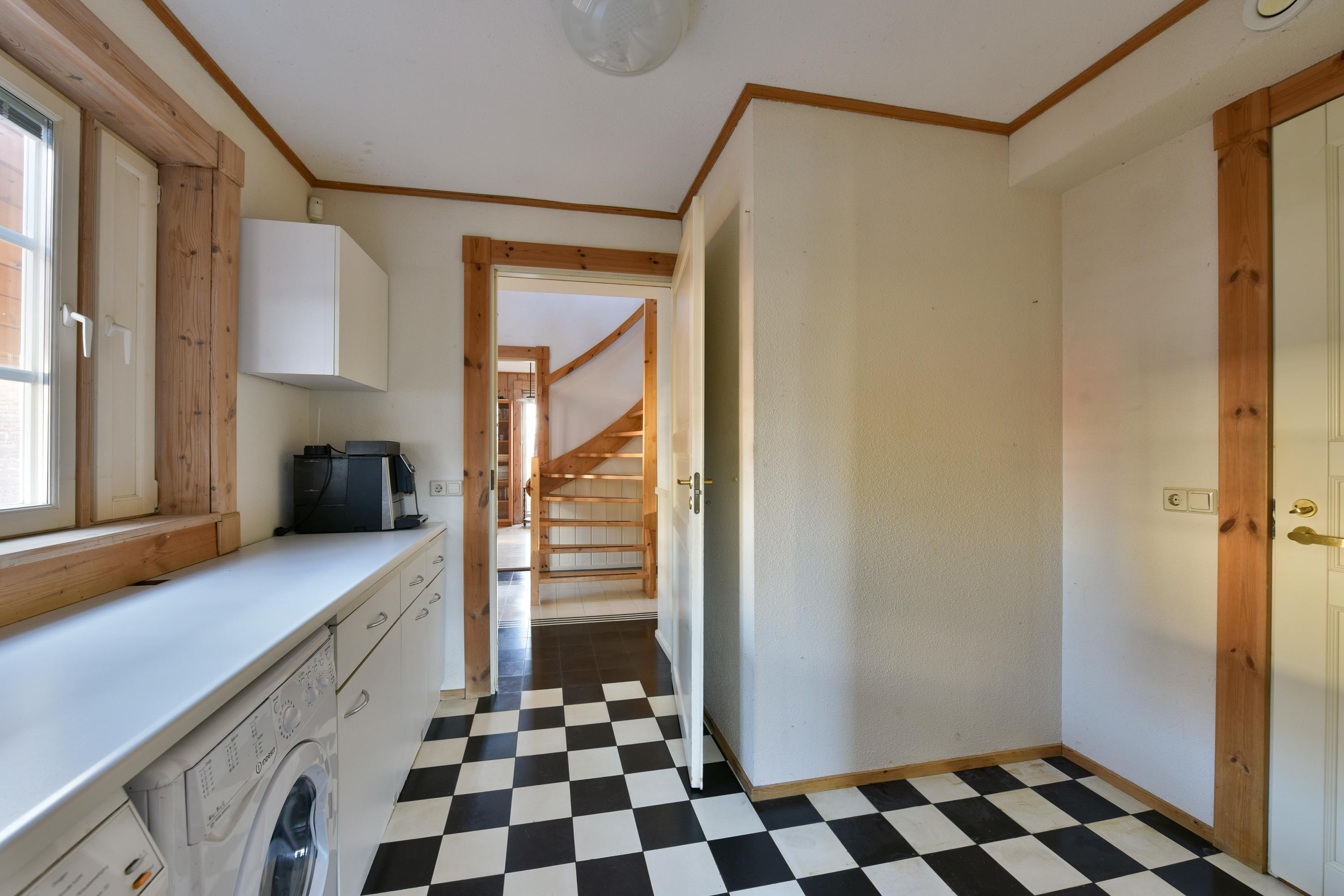 From the kitchen, you enter the practical, spacious utility room with a black-and-white tiled floor. Here, you’ll find connections for a washing machine and dryer under a stylish work table with cabinets for extra storage. The utility room gives access to the central hallway and a staircase leading to the basement.