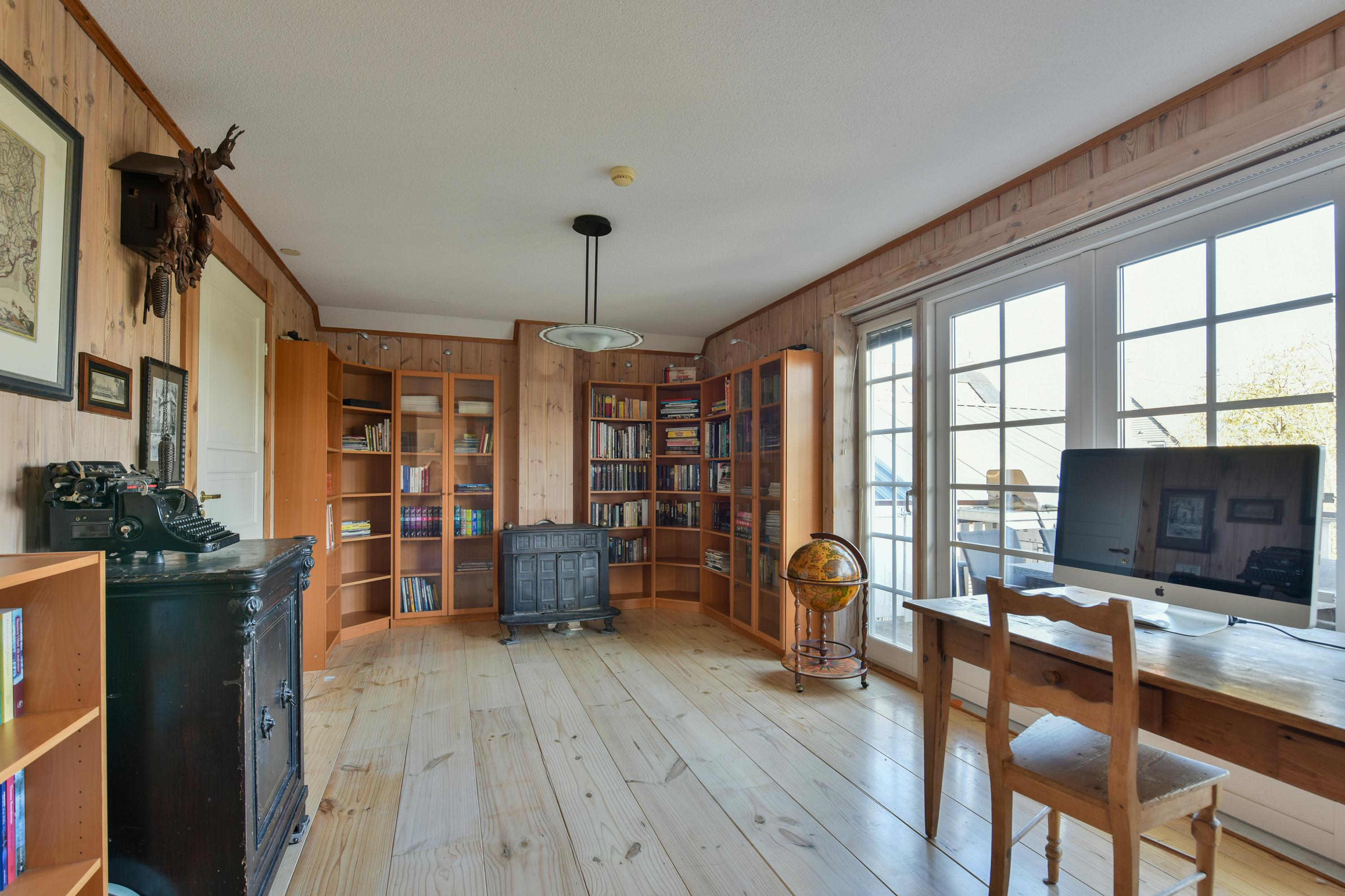 The library can be used for many purposes, such as a home office, a children's playroom, or a TV room, and also has French doors leading to the veranda. The cozy wood stove and built-in bookshelves further enhance the ambiance.