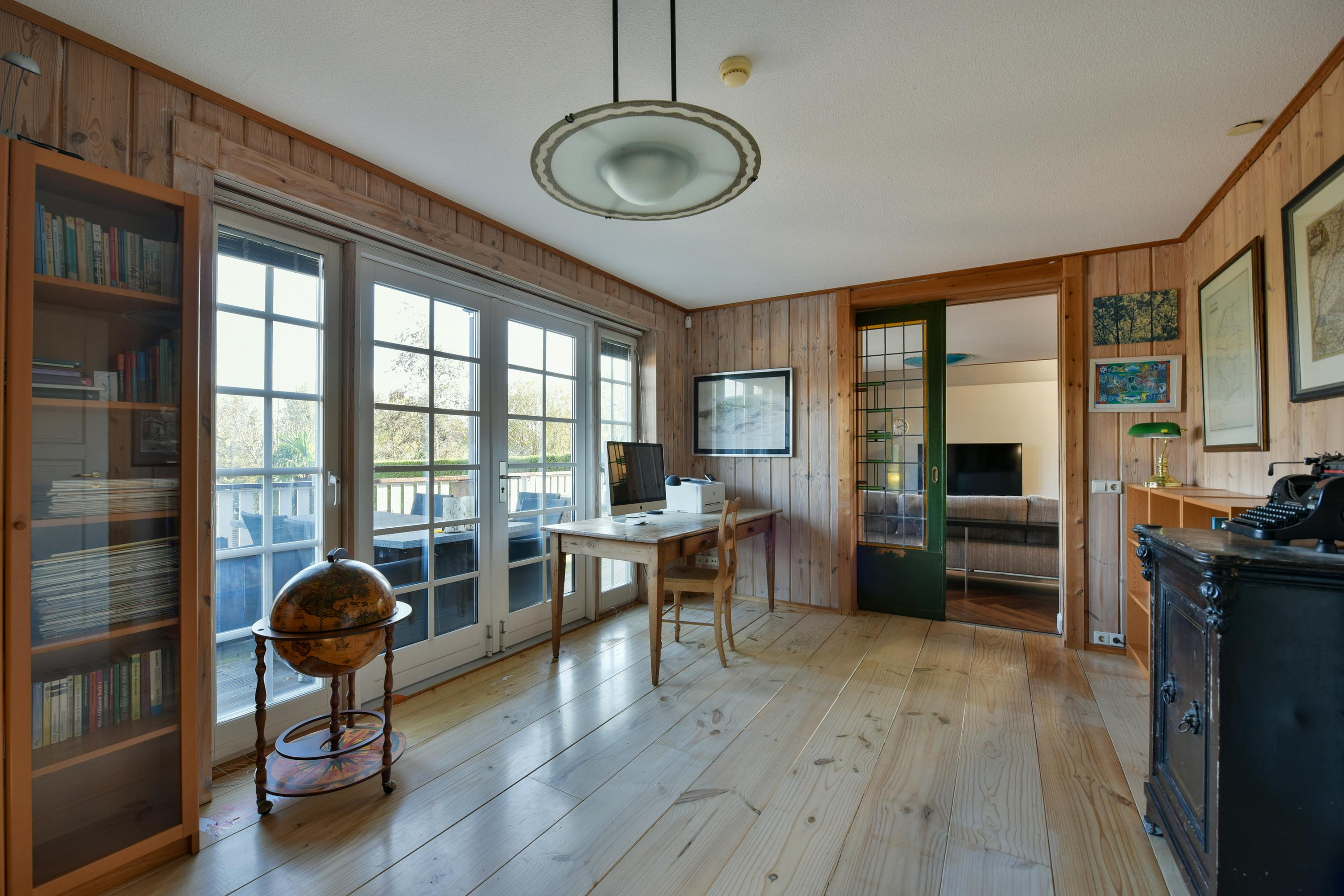 A charming, sheltered courtyard leads to a wooden staircase that takes you to the veranda surrounding the house. Upon entering, you step into the spacious hallway, which features a toilet with a sink and gives access to the living room, library, and utility room. The bright and spacious living room is a true oasis of atmosphere, thanks to the walnut herringbone floor, the stained-glass sliding doors leading to the library, and the French doors opening onto both the veranda and the garden. The many skylights positioned southward allow ample natural daylight into the living room.
