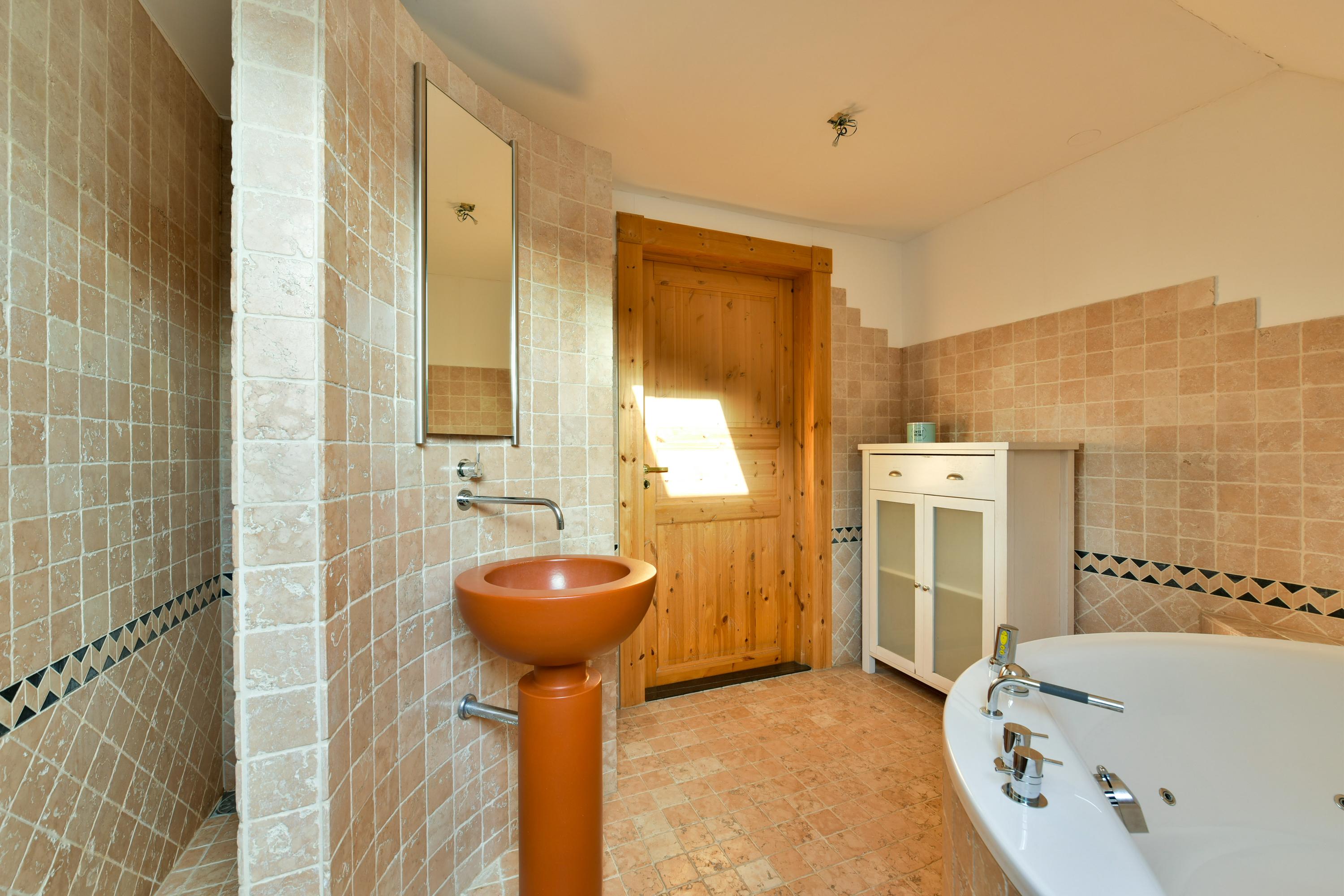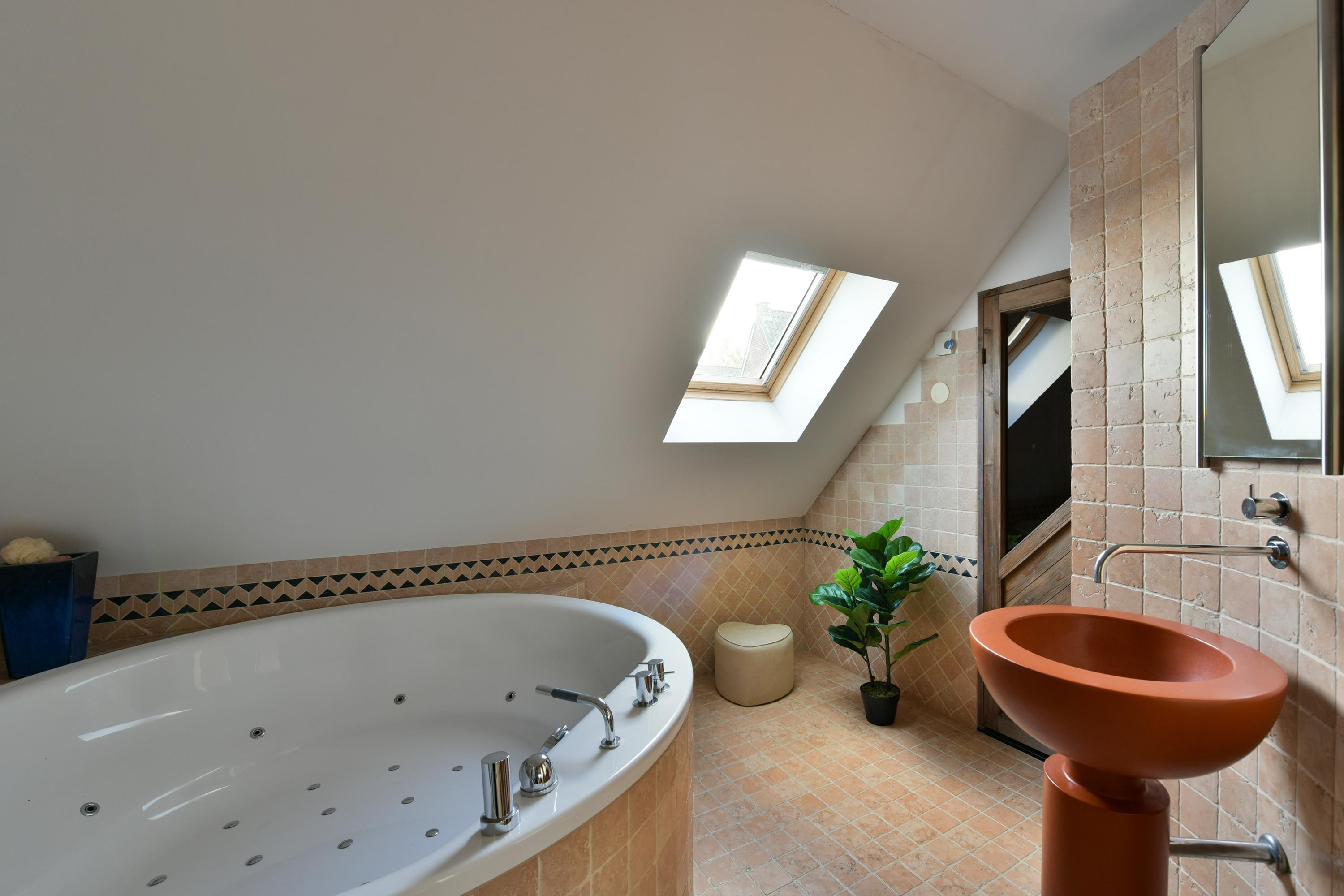 The open wooden staircase in the central hallway takes you to the first floor. The spacious landing, with skylights, makes this floor wonderfully bright. Here, you'll find four truly large bedrooms, all with access to outdoor spaces. At the front is a playful loggia, and the rear bedrooms open onto a wide balcony. The light-filled bathroom, with a skylight, is equipped with a luxurious round whirlpool bathtub, a large walk-in shower, and space for a sauna. A separate toilet with a sink and a storage closet are accessible from the landing.