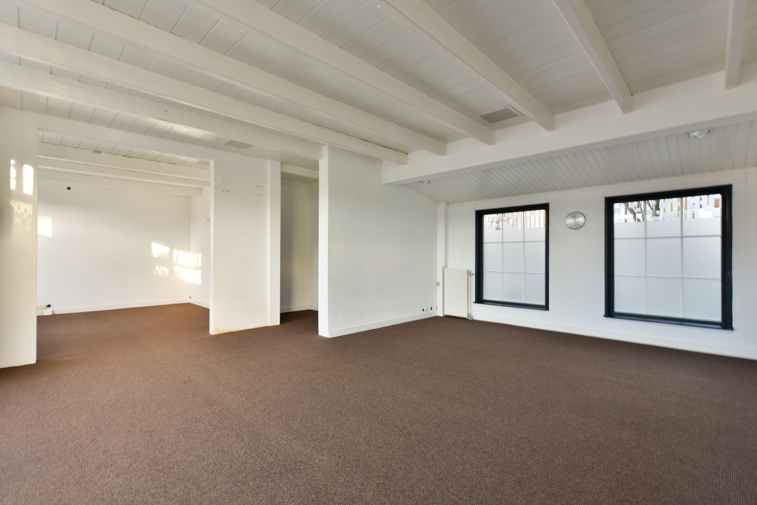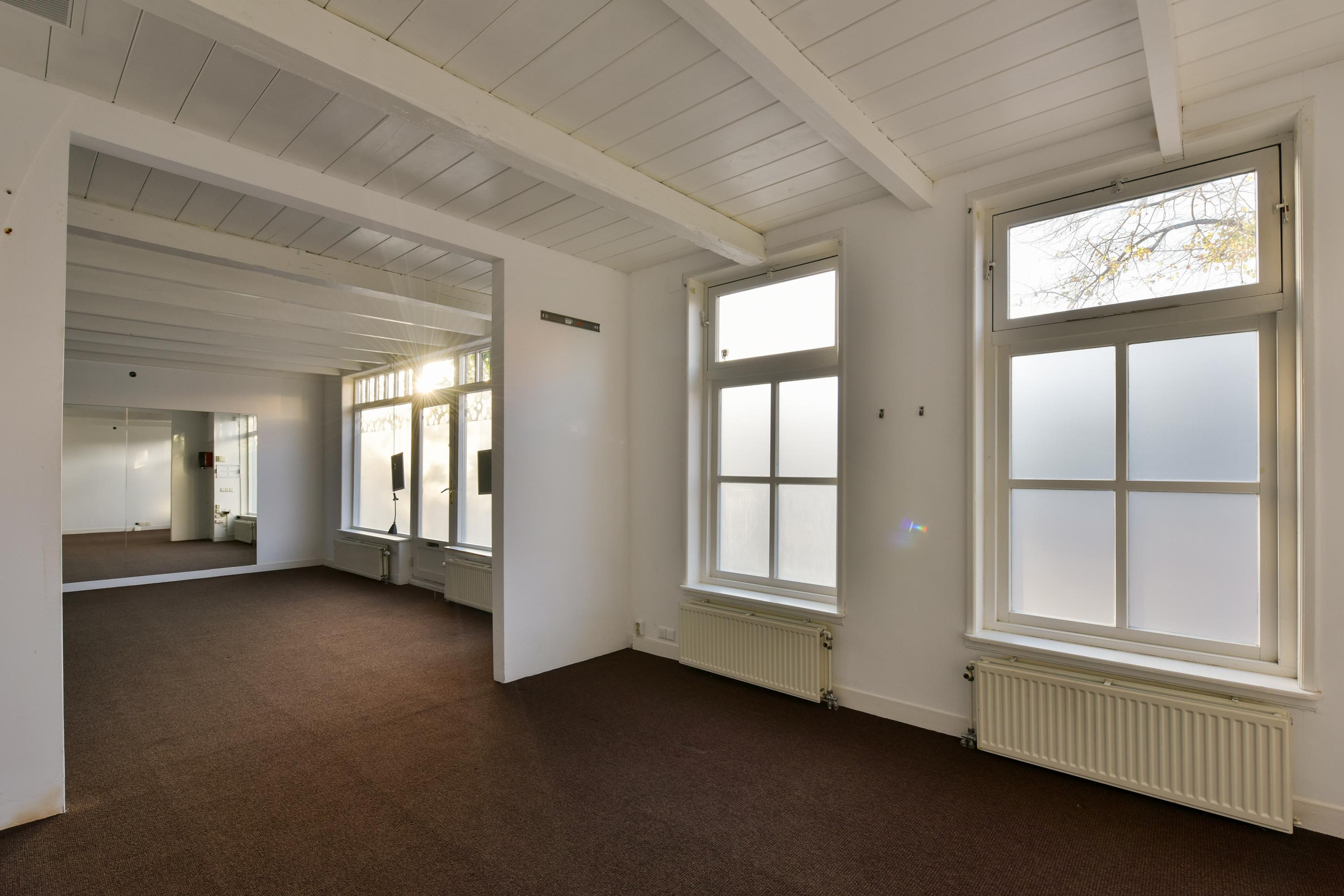 A unique feature is the separate building in front. The ground floor has an entrance at the front, leading to an open space with a semi-open work area. A corridor at the rear has a back door and access to a small hall with stairs leading to the upper floor, a toilet, and a kitchen. The first floor is an open attic with space for its own central heating system. The gross floor area is 146 m², with a usable area of 96 m² (according to NEN2580 standards). This practice space is air-conditioned and can be adapted to suit many different uses according to your needs.