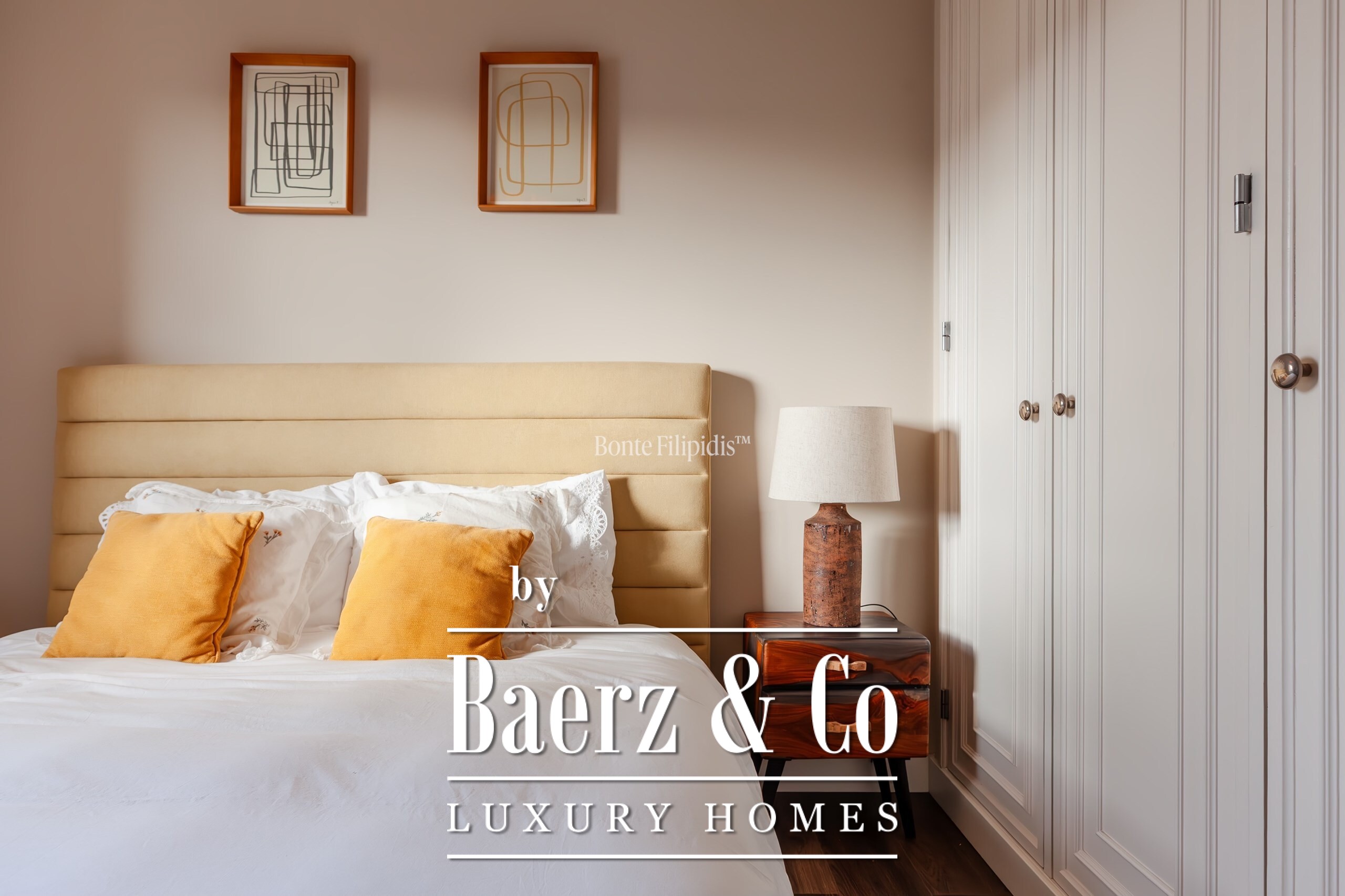 Wide windows in the living and dining room invite serene river views and lead to a spacious balcony, creating a seamless connection between interior and exterior space. A fireplace anchors the room, offering warmth and a gathering point during Lisbon’s cooler evenings. The kitchen is fully equipped with contemporary appliances and an integrated laundry, delivering both function and discretion.