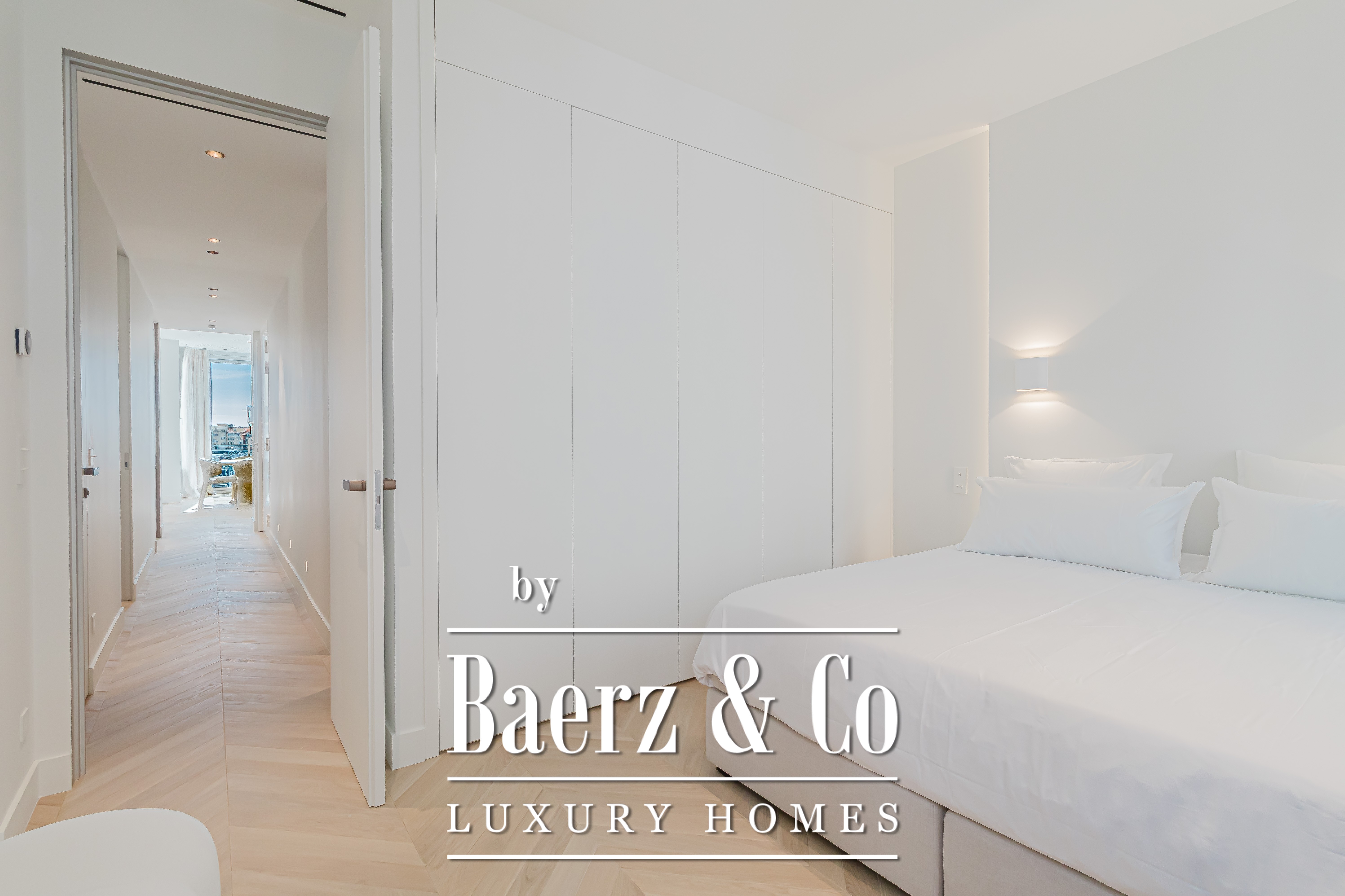 The property has been thoughtfully renovated and currently features two bedrooms and two bathrooms. The generous double living room opens to a private balcony, while a separate kitchen provides both privacy and functionality. Throughout the apartment, contemporary interiors are complemented by luxurious finishes such as a Corian bathtub, fitted wardrobes, new aluminium window frames, and dimmable LED lighting.