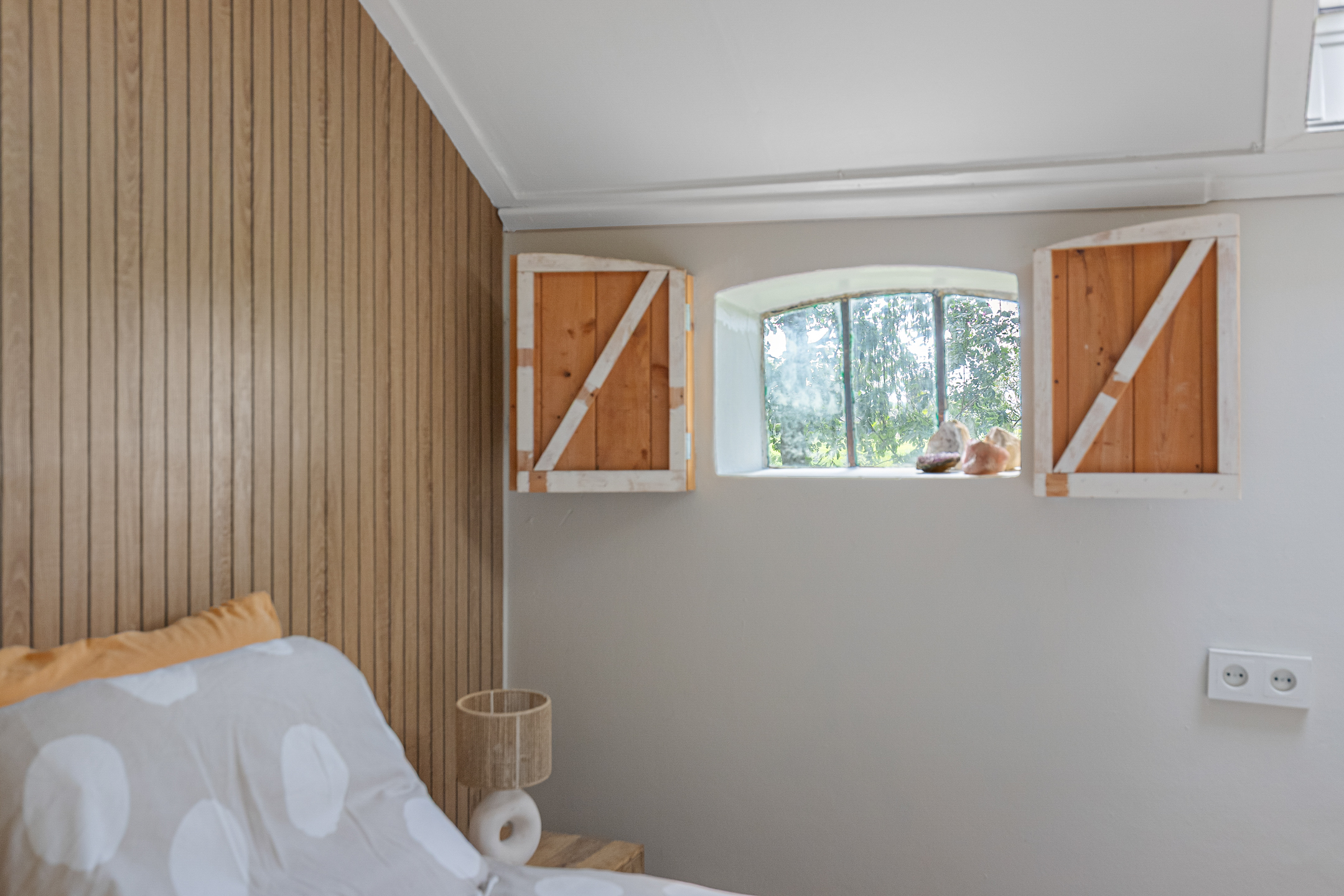Beyond the dining room, a hall leads to the bathroom with shower, toilet and washbasin. The ground-floor master bedroom features characteristic stable windows, a private washbasin and a snug seating area – an intimate, romantic retreat. The ground floor is finished with sturdy whitewashed wooden floors and heated by radiators.
