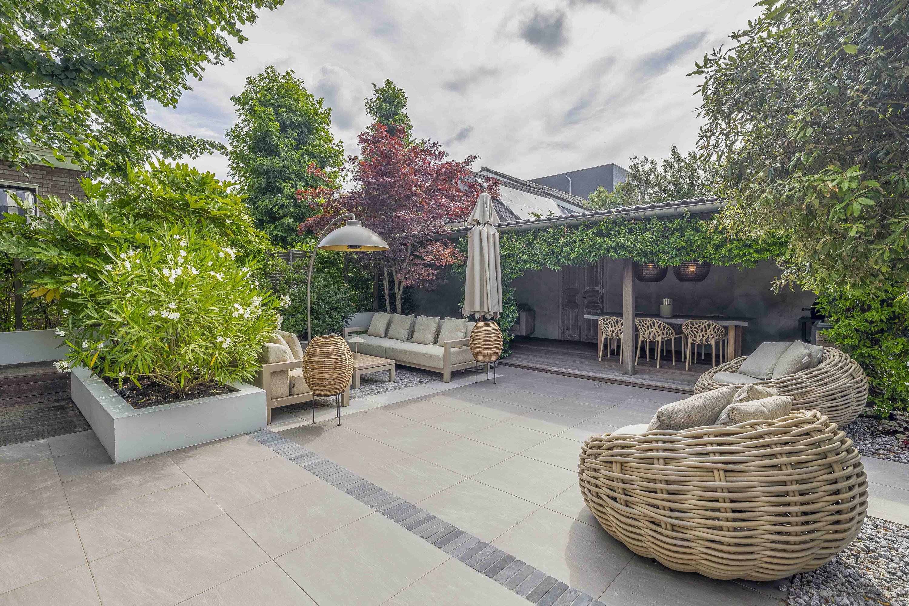 - Fraai aangelegde zonnige tuin met diverse terrassen en sfeervolle overkapping
