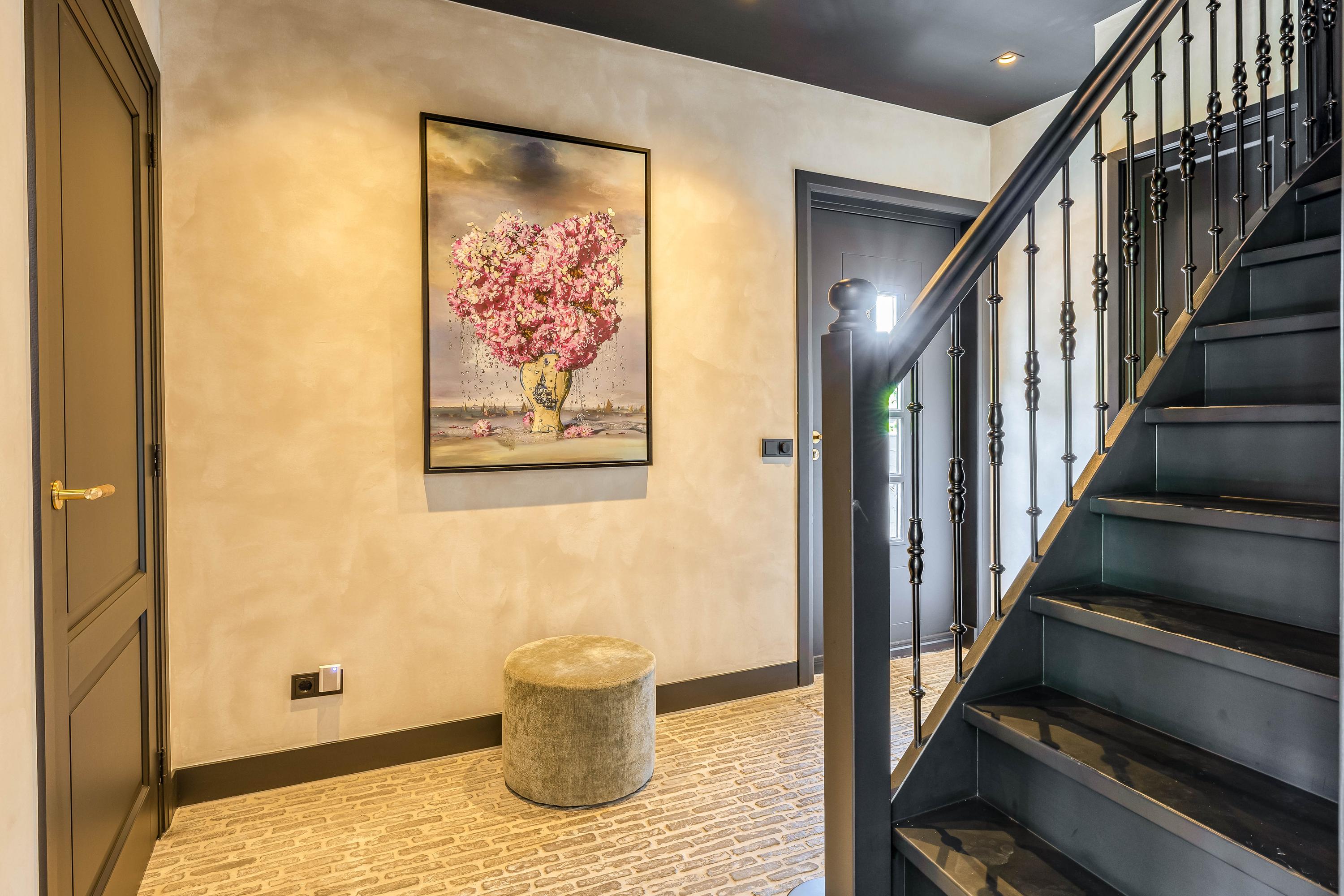 De riante woonkamer ademt rust en klasse dankzij een stijlvolle wandafwerking, een prachtige vloer in Hongaarse punt en openslaande deuren naar de tuin. De grote raampartijen zorgen voor een natuurlijke lichtinval, wat bijdraagt aan de warme, uitnodigende ambiance van het huis.