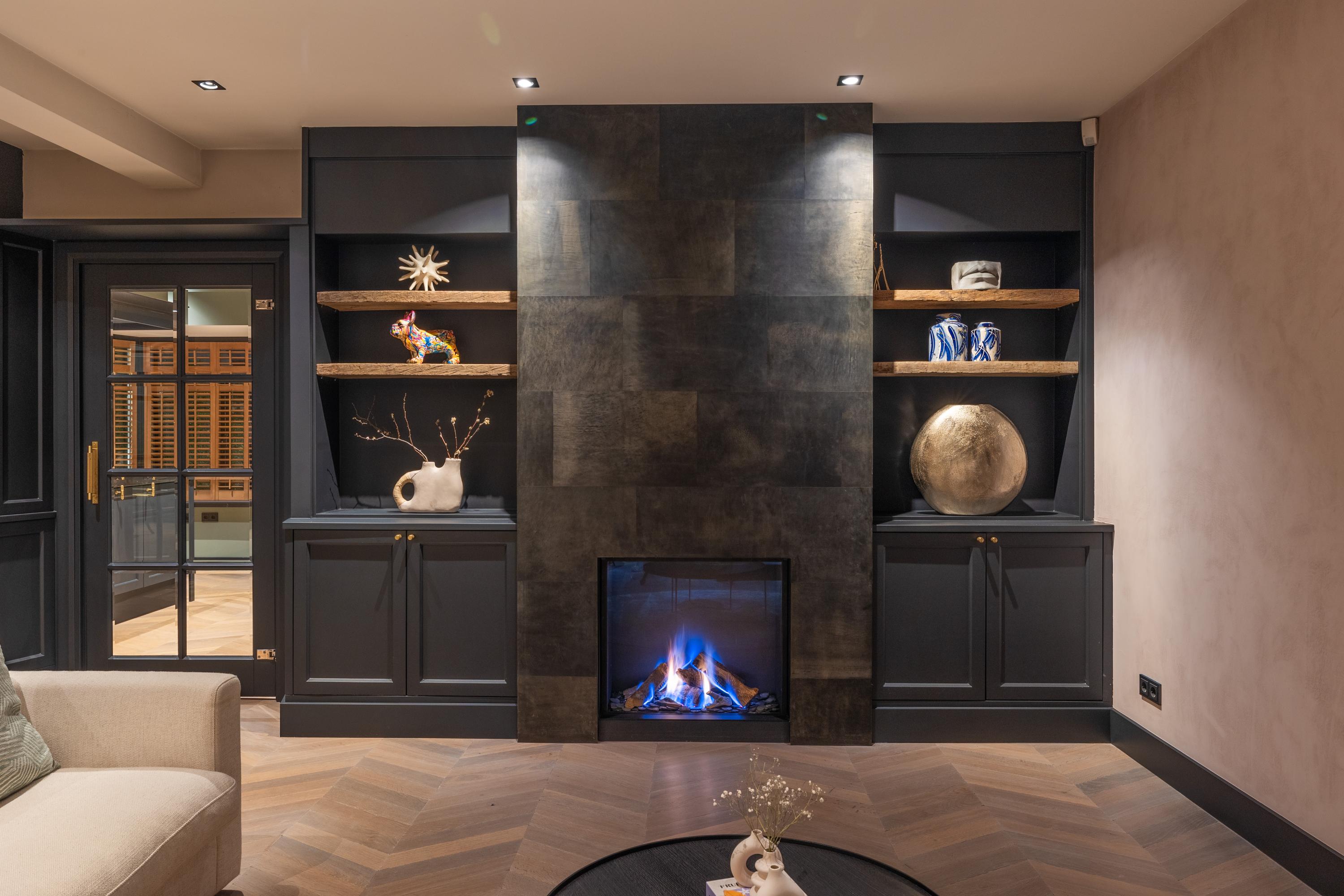 Uitgebouwde woonkamer met fraaie kastenwand, gashaard en openslaande deuren naar het onderheide terras. Toegang tot de wijnkelder