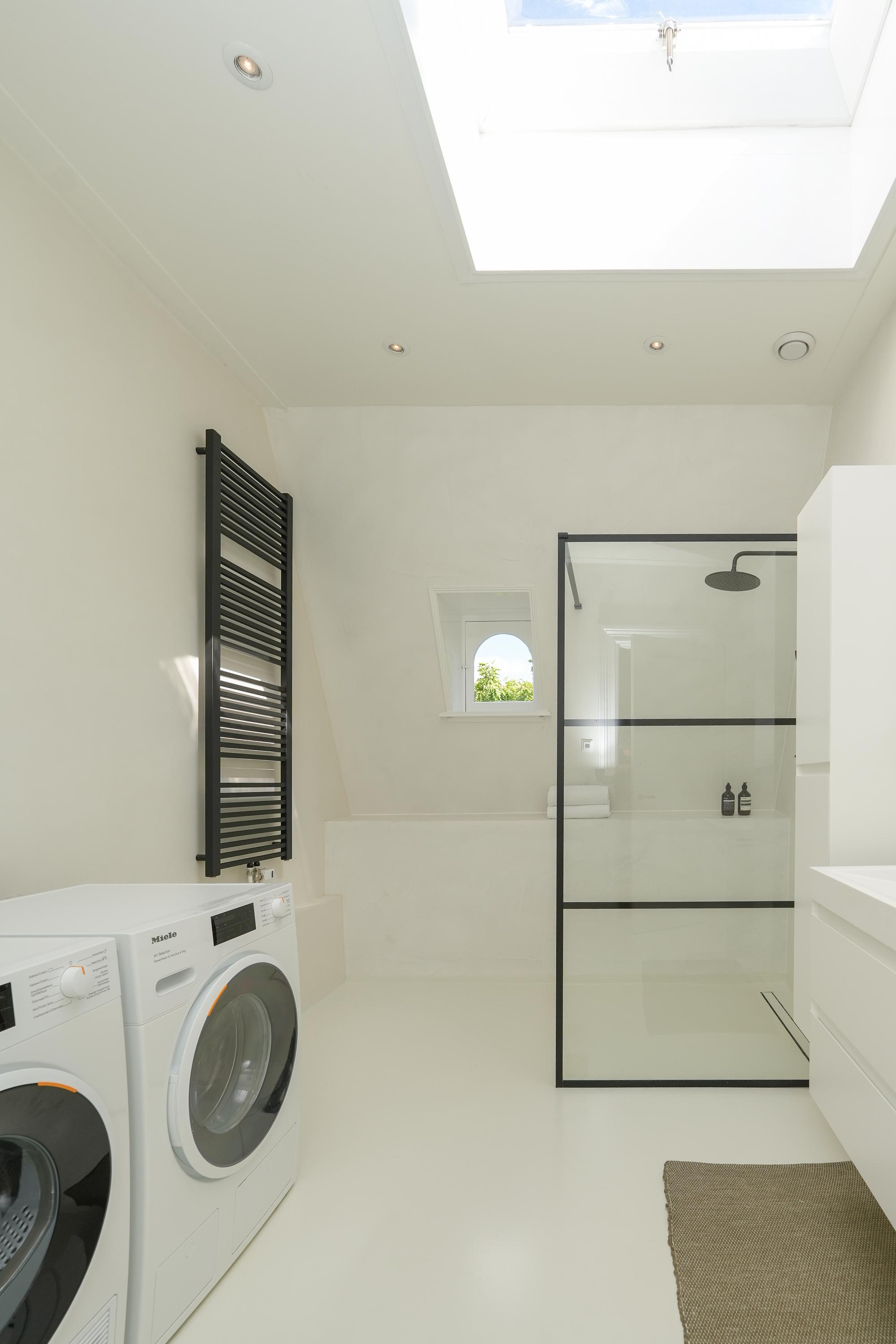 Bright landing with staircase to the top floor. The first floor has two bedrooms, a modern bathroom and a separate toilet with washbasin. The master bedroom has air conditioning and a spacious walk-in closet, accessible via two sliding doors next to the bed. At the front is a wide balcony next to the walk-in closet and at the rear is a spacious, sunny roof terrace next to the master bedroom. Originally, the master bedroom and walk-in closet were two separate bedrooms, and this layout can easily be restored. The second bedroom also has air conditioning. The luxurious, modern bathroom is accessible from both the master bedroom and the landing and features a freestanding bathtub, double walk-in shower, double sink in a vanity unit and underfloor heating. The toilet and bathroom are equipped with automatic mechanical ventilation.