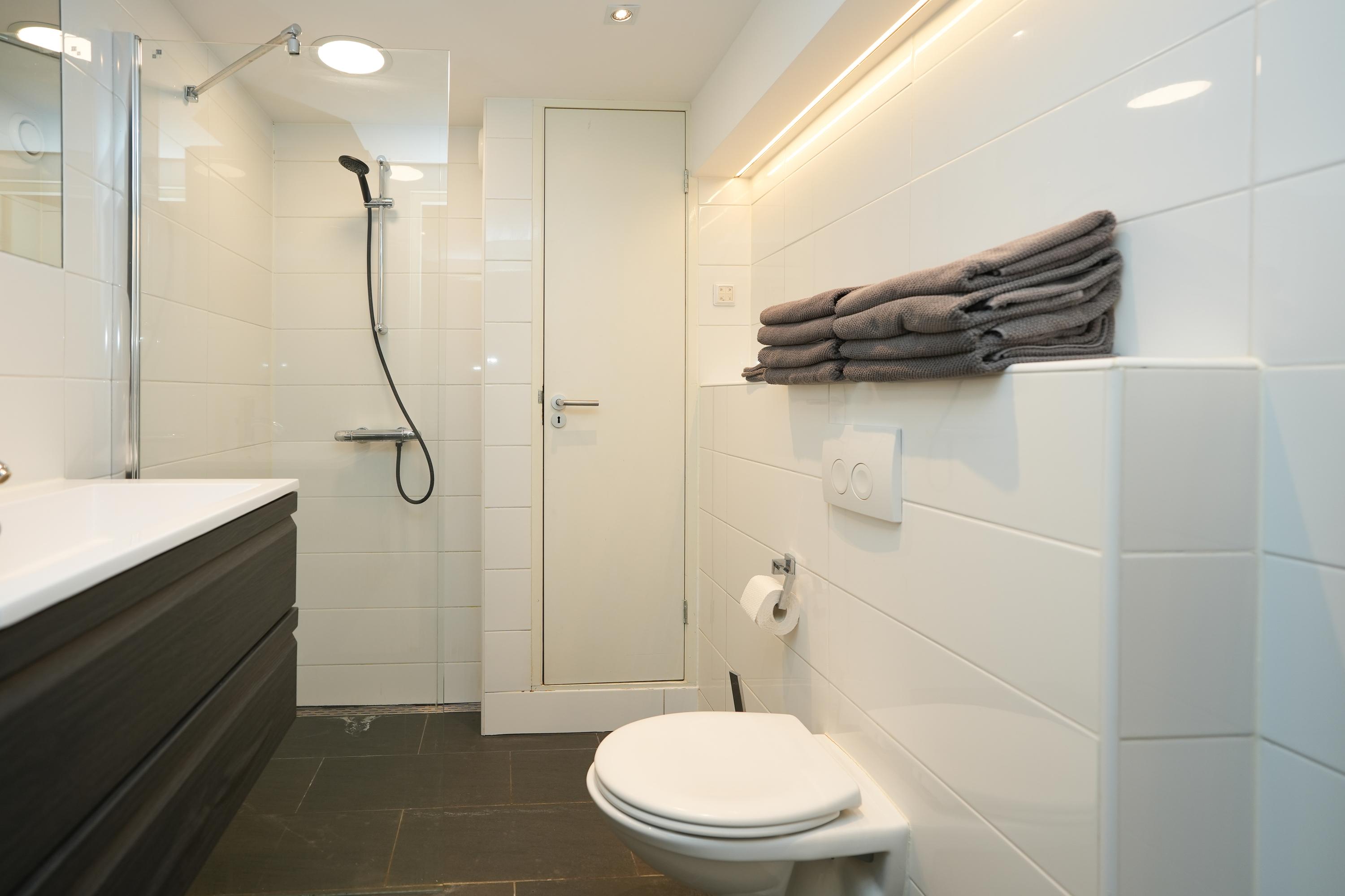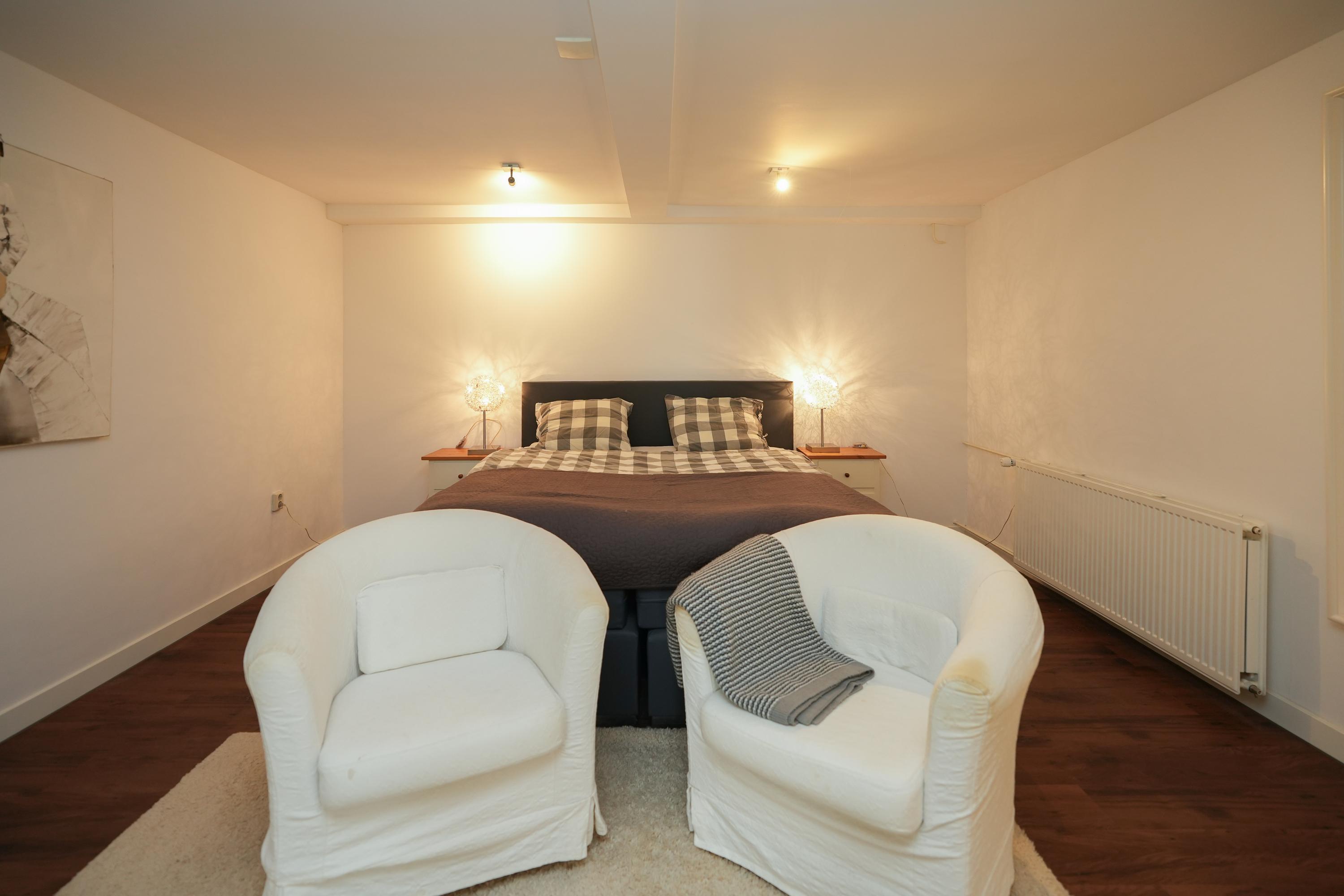 Middels een vaste trap is de bovenste verdieping bereikbaar, hier bevindt zich een ruime woonkamer met een bedstee. Tevens is er een moderne dichte keuken met witgoedaansluiting en er is een functionele badkamer met toilet en douche. Deze verdieping is sfeervol doordat de originele constructiebalken zichtbaar zijn gebleven en de ruimte is lekker licht door de dakramen. Bovendien is er veel bergruimte in vaste kasten.