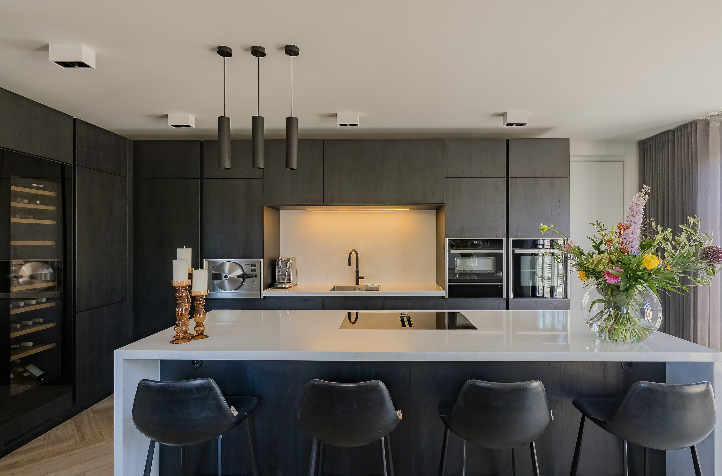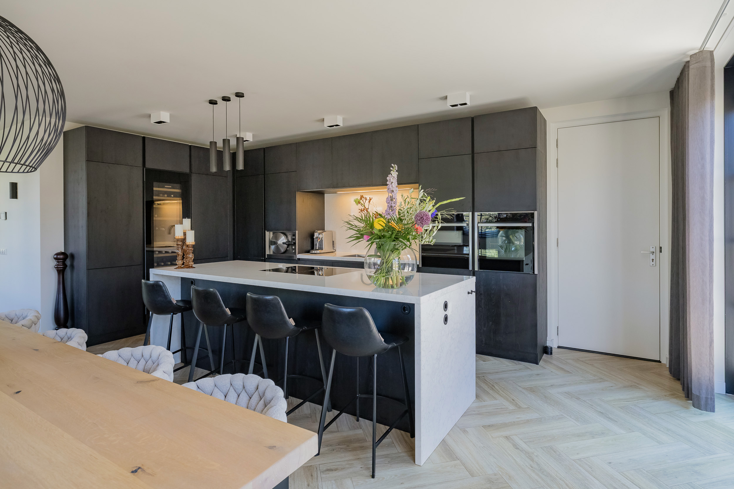 In the hall, with wardrobe and guest toilet, steel doors give access to the spacious, very bright living room with beautiful wall unit and a large bay window. At the rear of the house is the spacious kitchen with cooking island - perfect for getting together with family and friends. Two pairs of French doors to the garden allow the indoors and outdoors to flow effortlessly into one another. Thanks to the underfloor heating, you can enjoy a comfortable temperature here all year round.