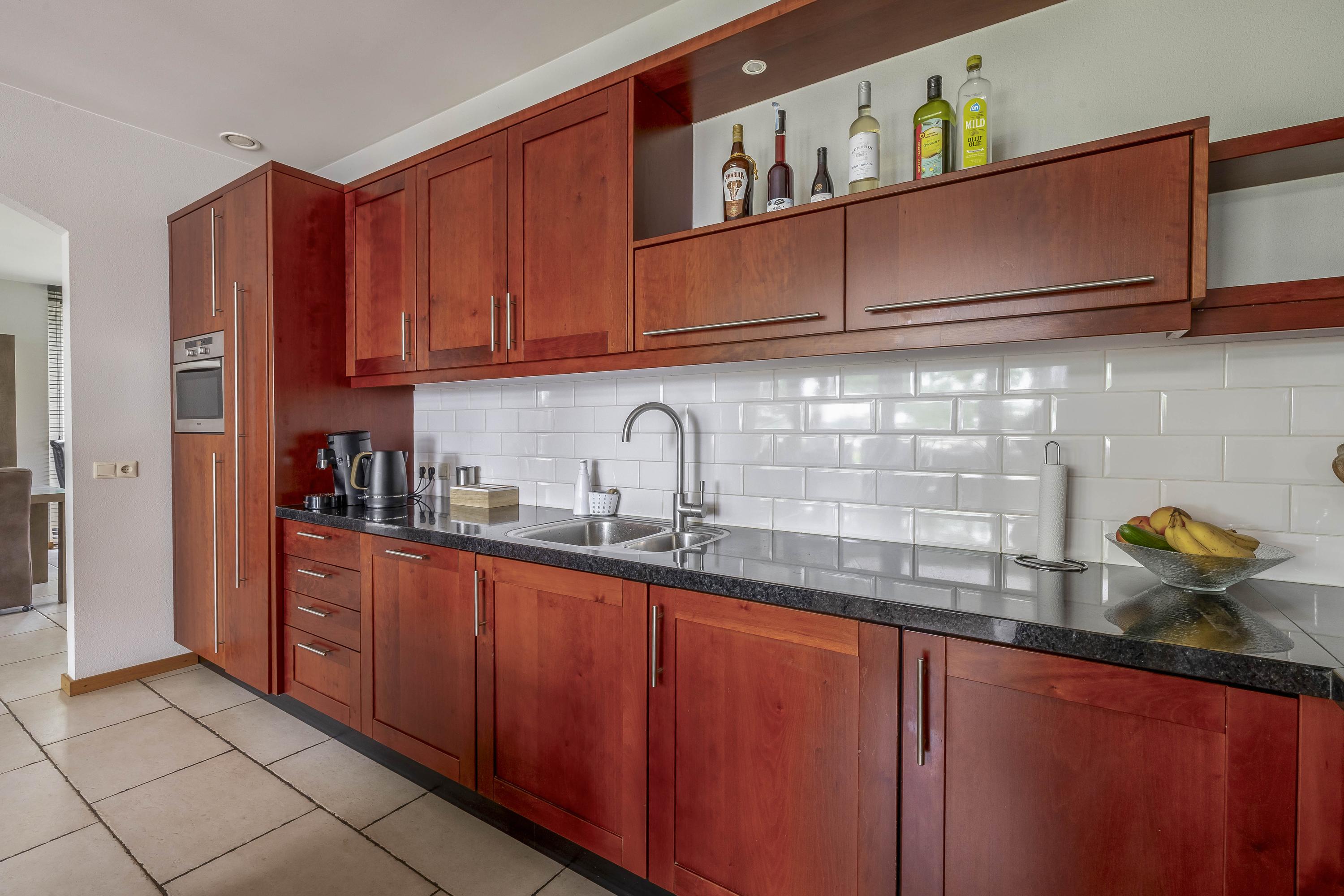 The living room has a tiled floor, sleek stucco walls and a stucco ceiling with recessed lighting. Large windows extending to the floor provide plenty of light and a spacious feeling. The gas fireplace adds extra warmth and atmosphere to the room. In addition, French doors provide direct access to the covered terrace, allowing the indoors and outdoors to flow into each other. The living room provides access to the kitchen. The kitchen also has a tiled floor, stucco walls and a stucco ceiling. The kitchen is corner-shaped and equipped with various built-in appliances, such as a combination microwave, dishwasher, sink, induction hob and refrigerator. Various cupboards provide ample storage space. There is a laundry chute in the cupboard. Here too, French doors provide access to the covered terrace. The practical utility room has a tiled floor and a stucco ceiling. The room is fully tiled. The utility room is equipped with a kitchen unit with cupboards and a sink. The connections for the washing machine are located here. The toilet is also fully tiled and equipped with a floating toilet and a washbasin. The house has a bedroom with en-suite bathroom on the ground floor, making the house suitable for lifetime living. The bedroom has laminate flooring, spachtelputz walls and a stucco ceiling. Two practical built-in cupboards provide storage space. Windows provide natural light and ventilation. The spacious en-suite bathroom is fully tiled and equipped with a bath, shower, washbasin with vanity unit and a floating toilet.