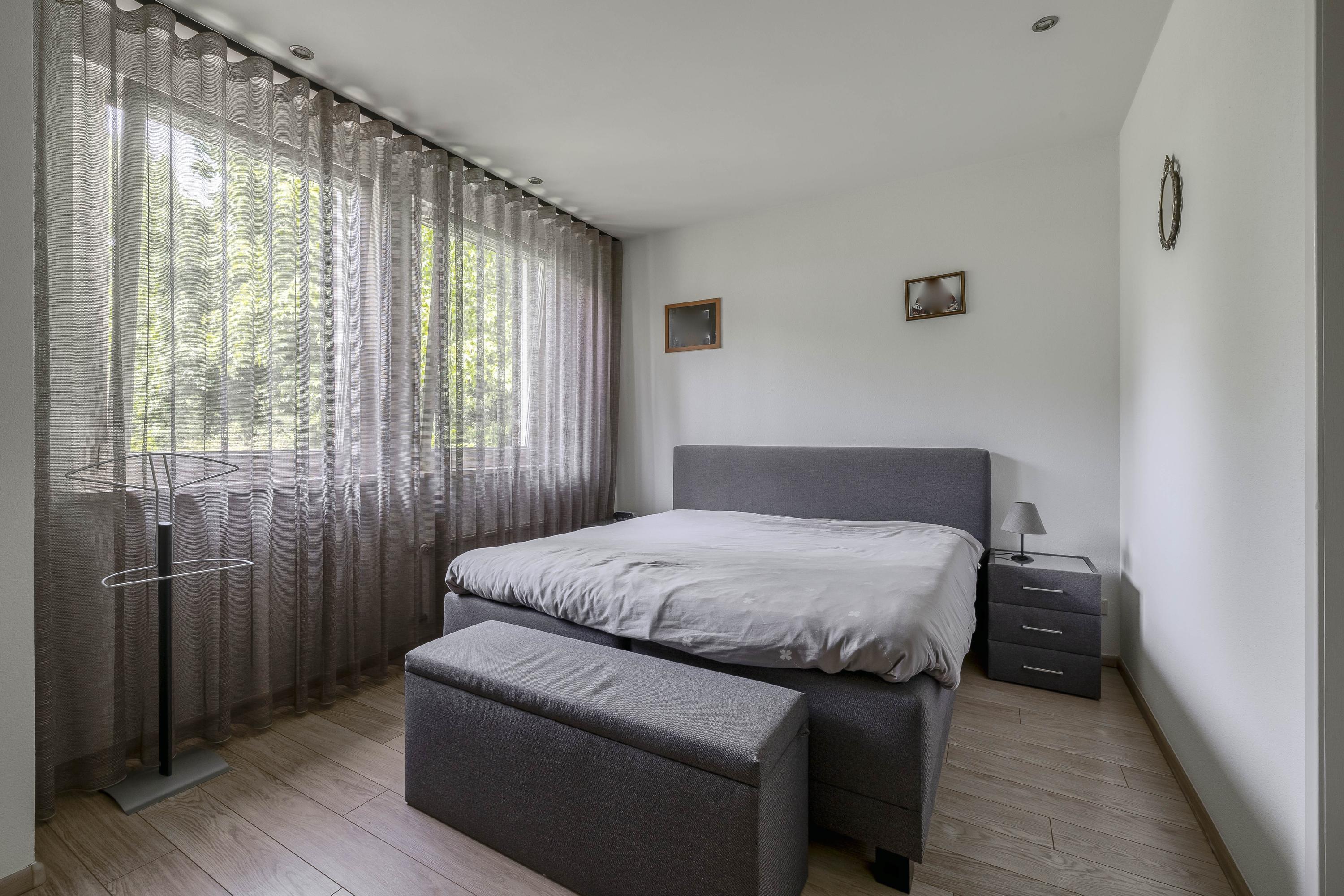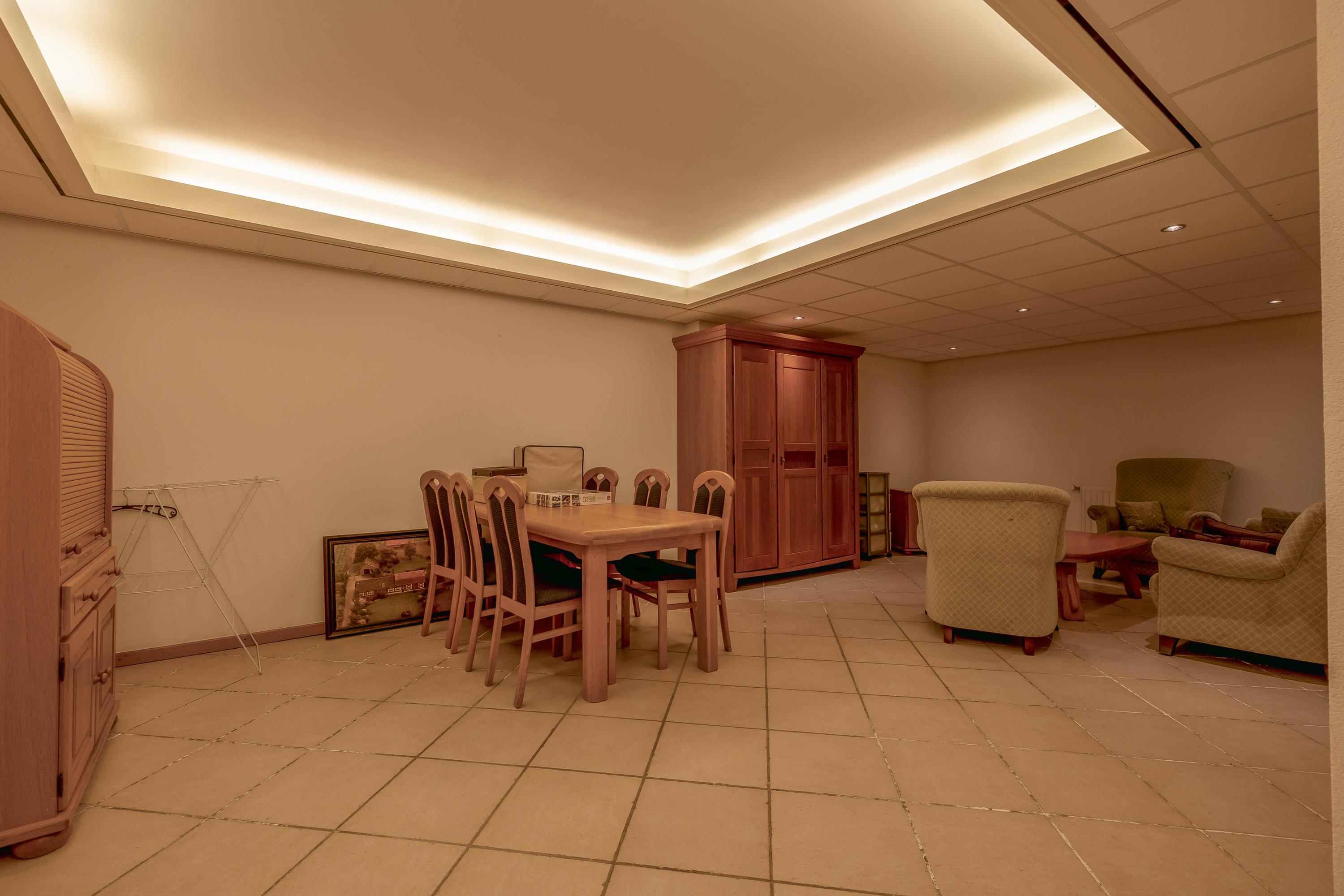 A fixed staircase provides access to the basement under the house. This basement consists of several rooms, including a “man cave/café”, a playroom/chill-out room and a practical storage room. The versatility of these rooms offers countless possibilities and also provides a lot of extra living and storage space in the house. The man cave/café is finished with a tiled floor with underfloor heating, stucco walls and a ceiling that is partly fitted with a suspended ceiling and partly with stucco. The room is equipped with air conditioning, which adds to the comfort. This space is perfect for organising parties or cosy get-togethers. The playroom/chill-out room has a tiled floor with underfloor heating, spachtelputz walls and a stucco ceiling. This versatile space offers plenty of possibilities and can easily be converted for various other purposes, such as a hobby room, home office or gym. This room also houses the heat pump, fibre optic connection, meter cupboard with water softener and the unit for the underfloor heating. The spacious storage cellar has a tiled floor, brick walls and a stucco ceiling. Practical shelves provide storage space. The toilet is fully tiled and equipped with a toilet (Sanibroyeur) and a washbasin.