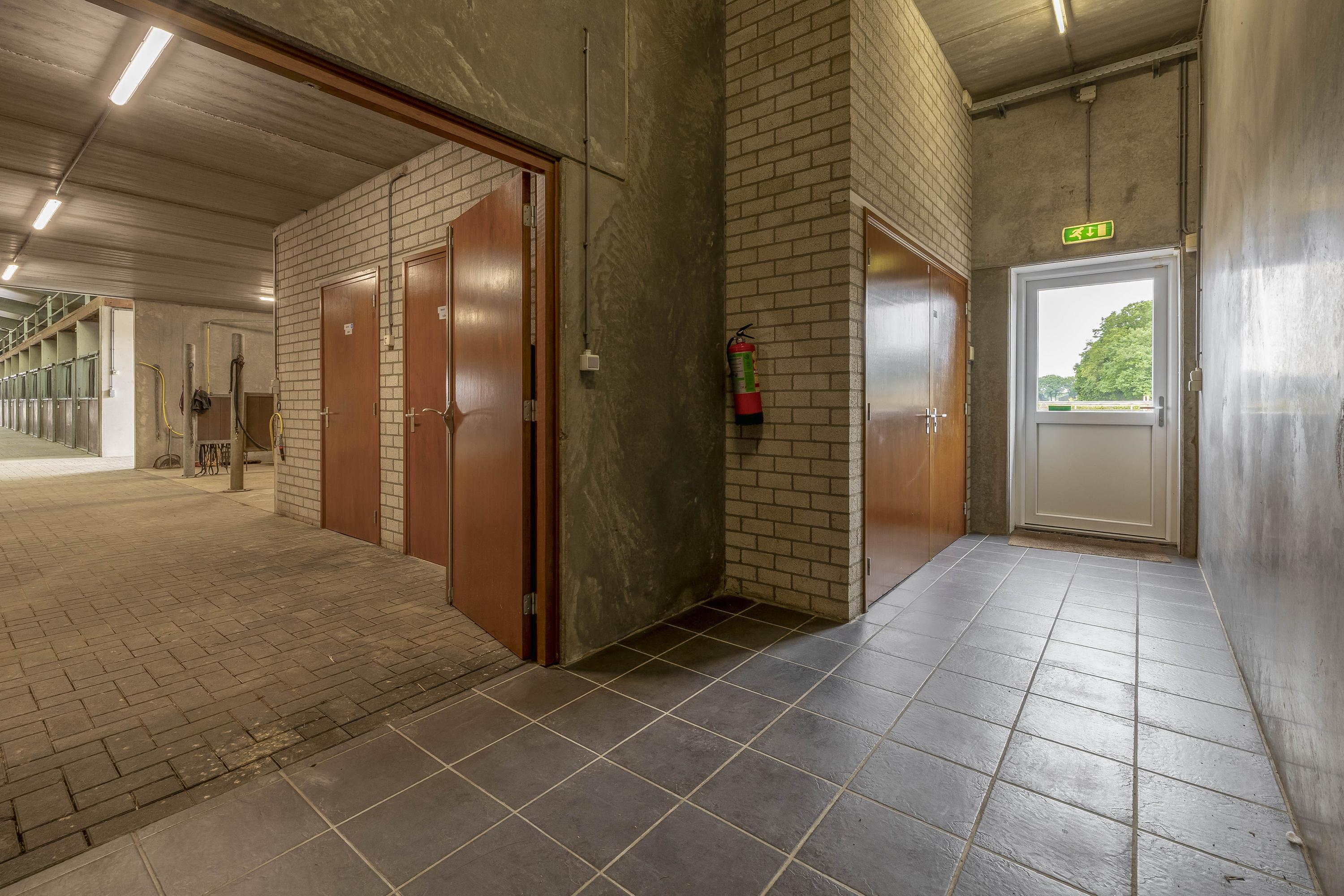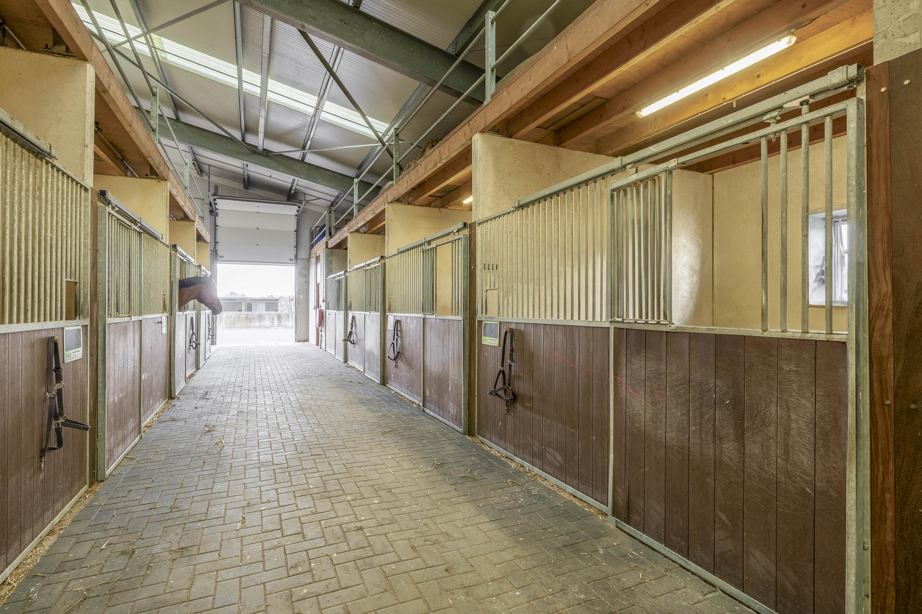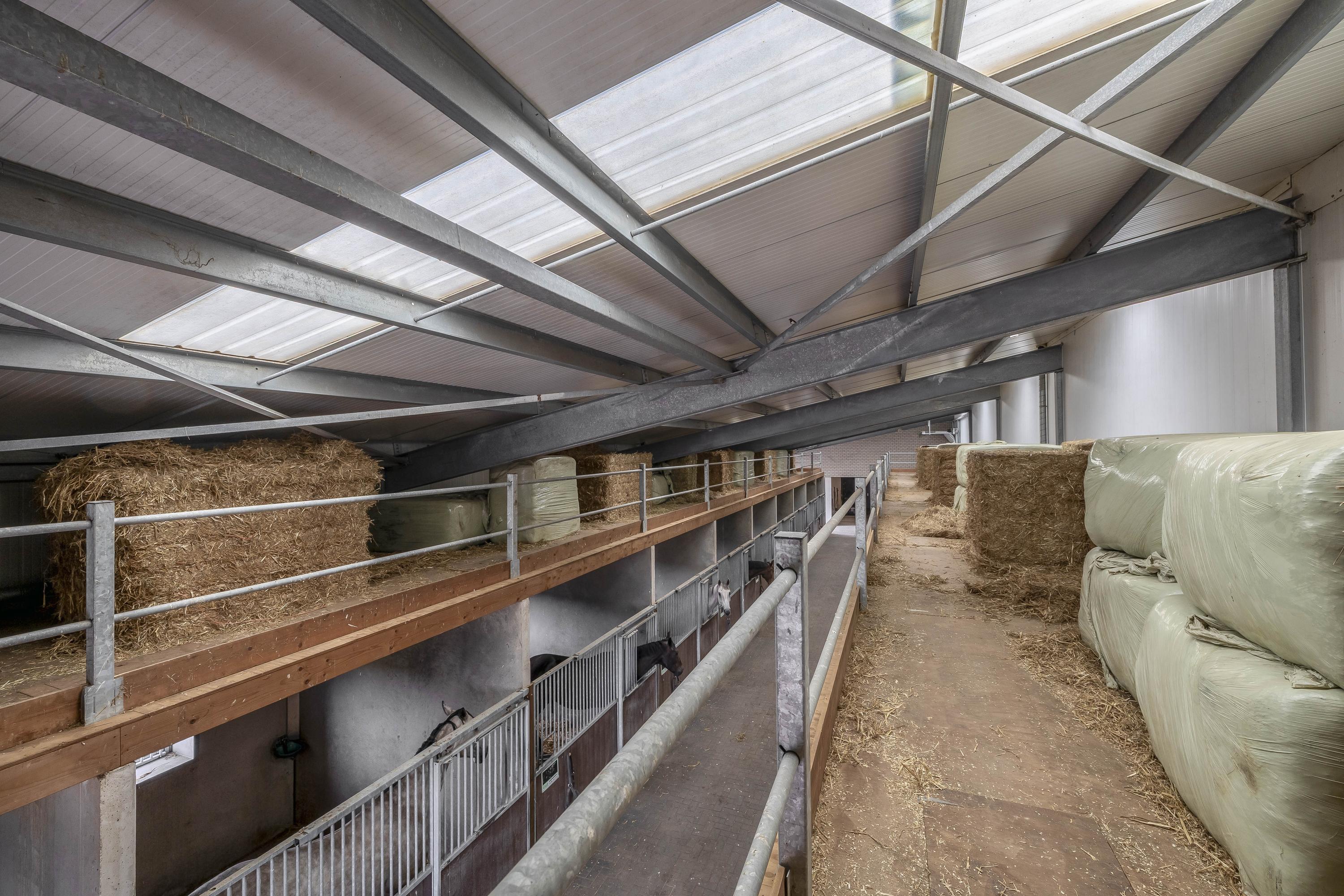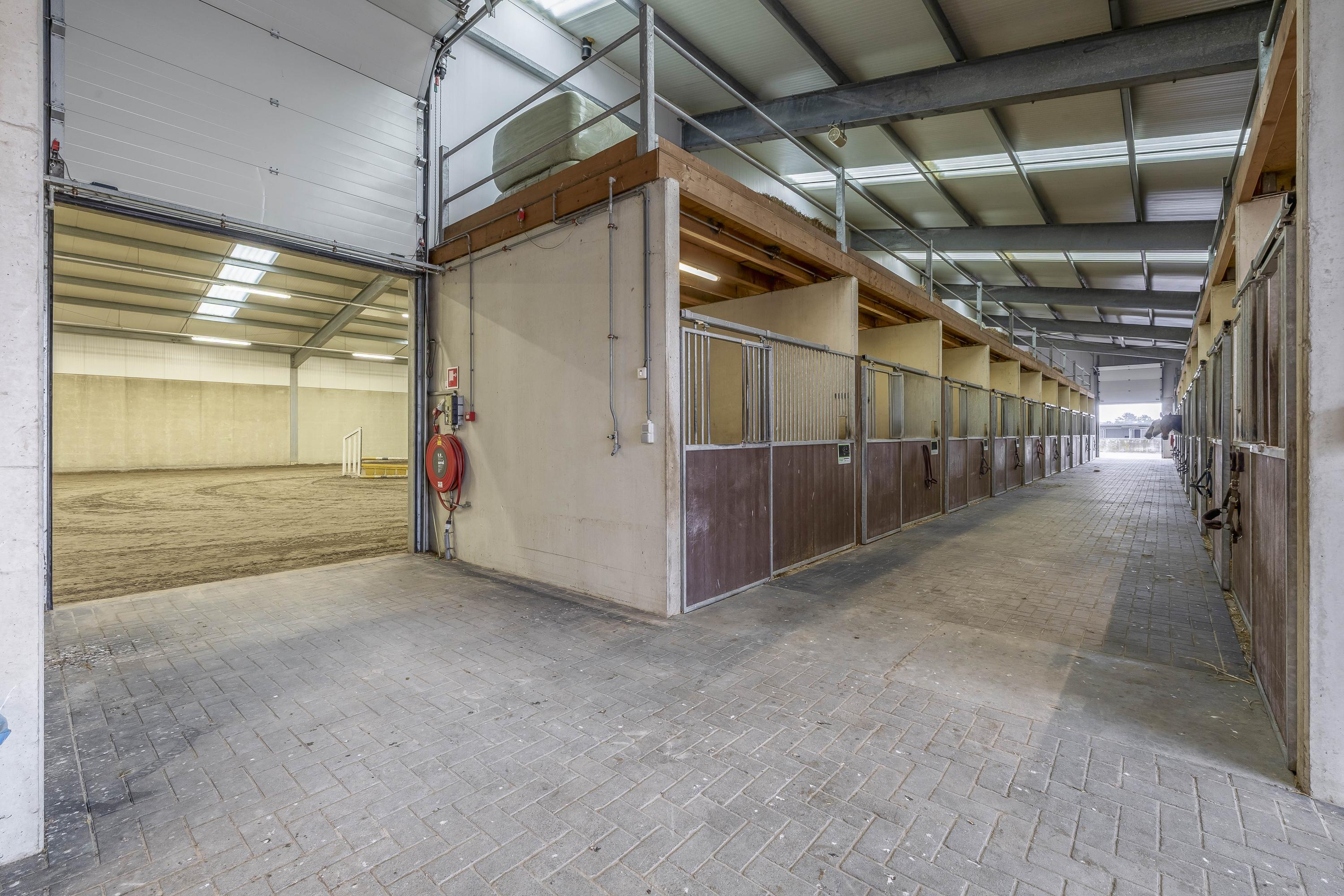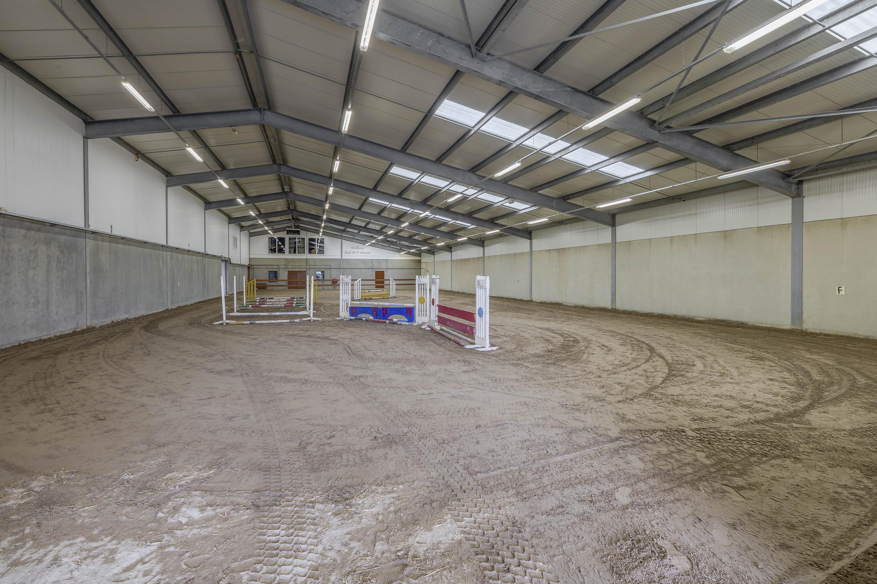 The yard is further equipped with an outdoor arena, six outdoor stables, a horse walker, a lunging circle, pasture and a manure pit. The riding hall is constructed of masonry facades, steel trusses and an insulated roof. The facades are partially clapboard on the outside. Light-transmitting panels provide natural light. On the inside, the facades are fitted with concrete elements. The indoor arena measures approx. 20 m x 40 m and is equipped with an ebb and flow floor. There is a heather. The arena is equipped with lighting. The walls are made of concrete. A roller door in the rear facade and a pedestrian door in the side facade provide access. The stable area is equipped with no fewer than 20 horse stalls, the front walls of which are partly made of plastic and partly of galvanised steel. The stalls have concrete partition walls and rear walls and are equipped with sliding doors. At the front of the hall is the shed/workshop, which has a concrete floor and walls and a concrete slab ceiling. On the right-hand side is the staircase to the reception area and the apartment on the first floor. The spacious reception area has a PVC floor and partly brickwork/partly stucco facades. There is a kitchen unit equipped with a sink, a refrigerator and storage space. The bedroom has the same finish as the reception area. The bathroom has a shower and a washbasin. There is also a floating toilet. From the reception area, there is a beautiful view of the indoor arena. The storage room contains the connections for the washing machine, the underfloor heating unit, the central heating boiler (Nefit Topline) and the inverter for the solar panels. The straw storage at the rear of the riding hall has a concrete floor. The feed silo is located here. A roller door at the rear and a pedestrian door provide access to the yard. The roof is insulated.