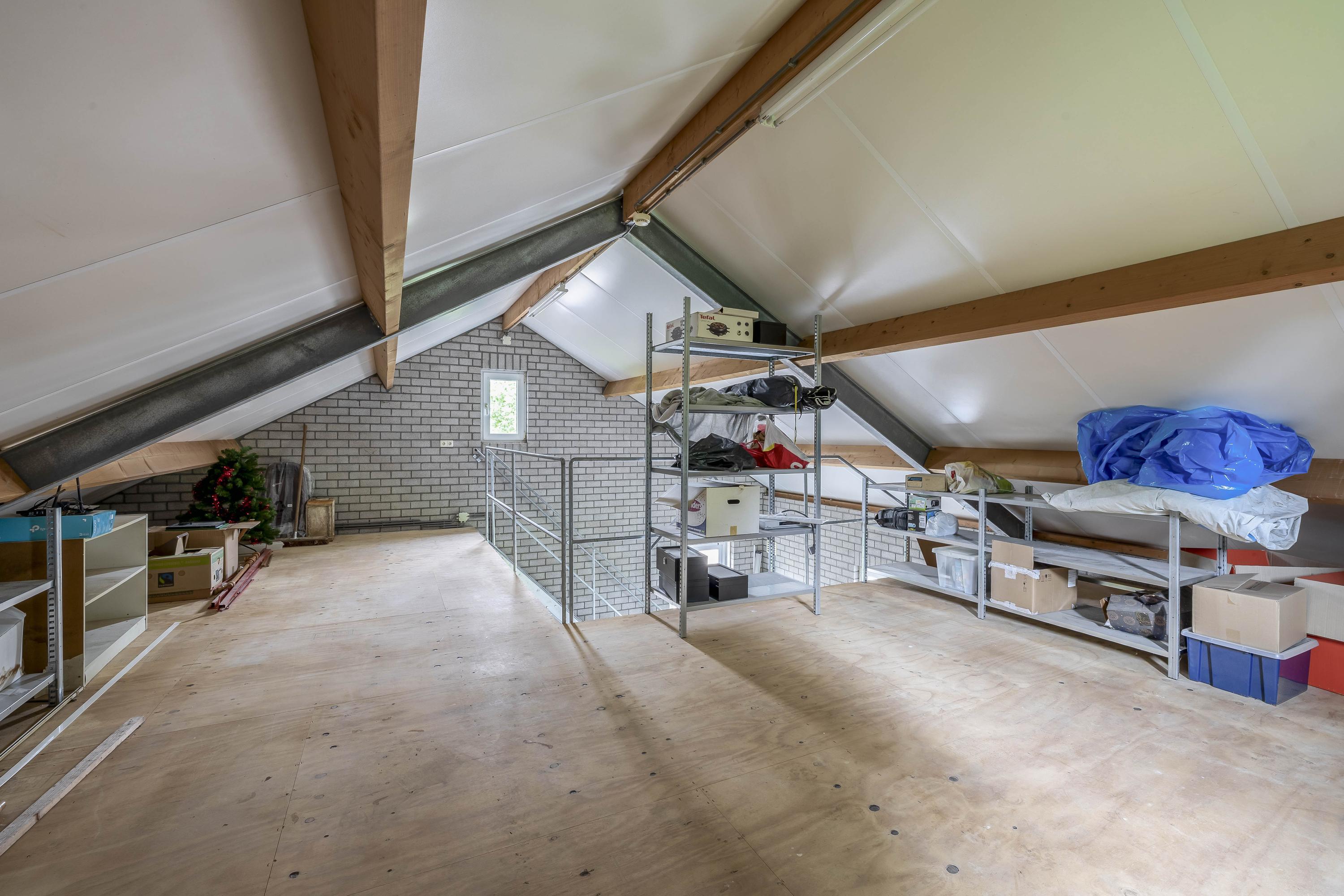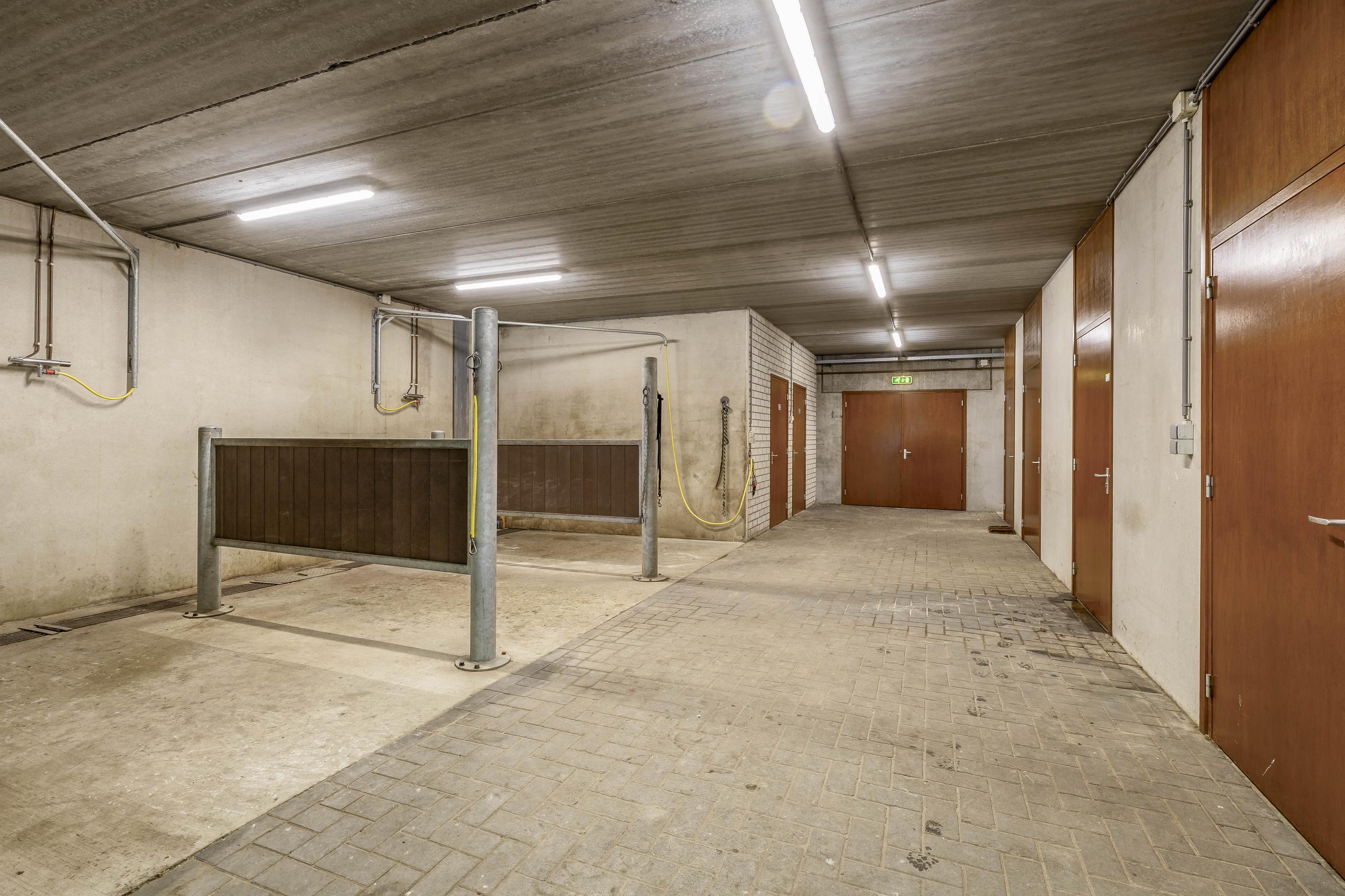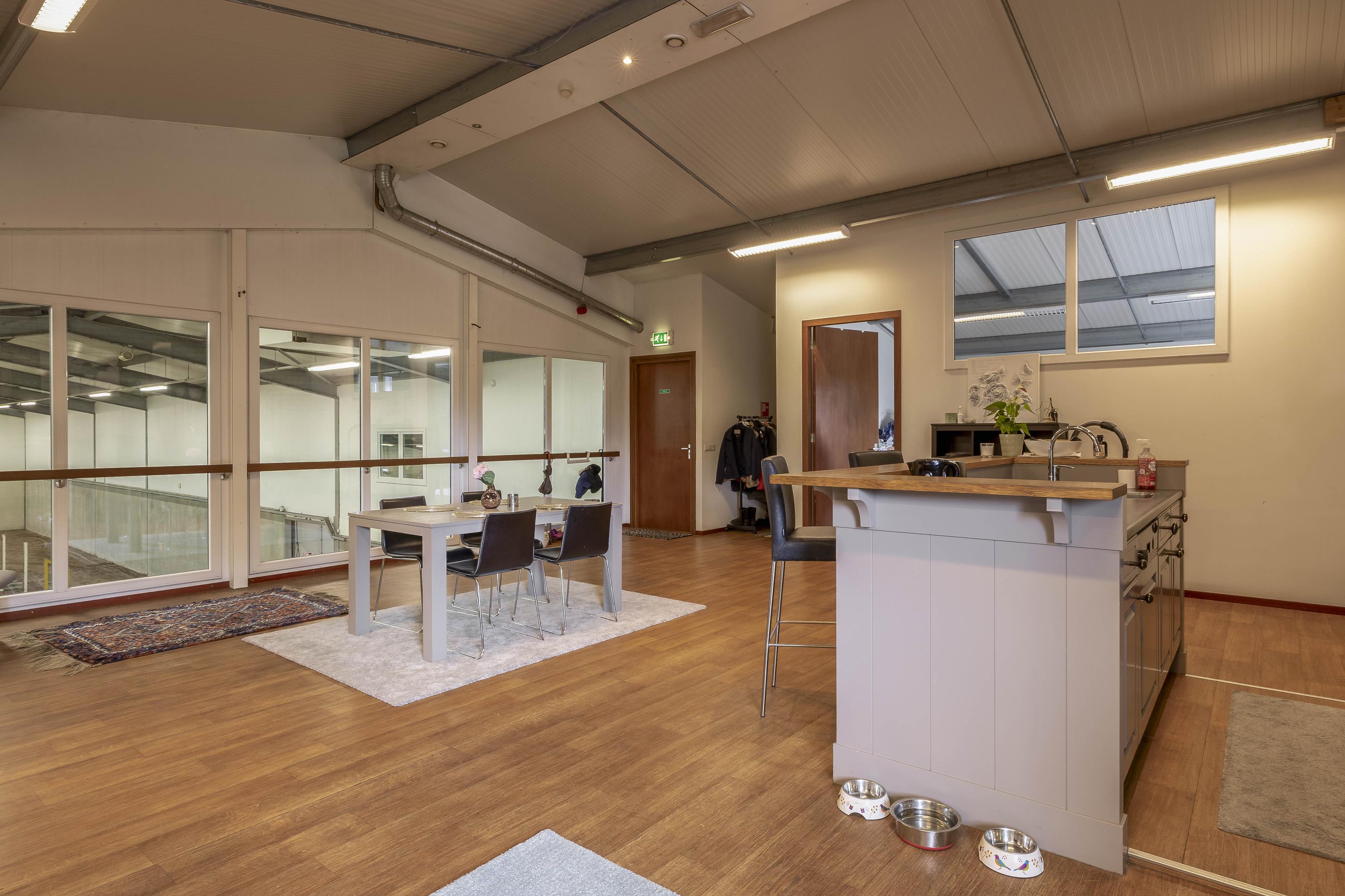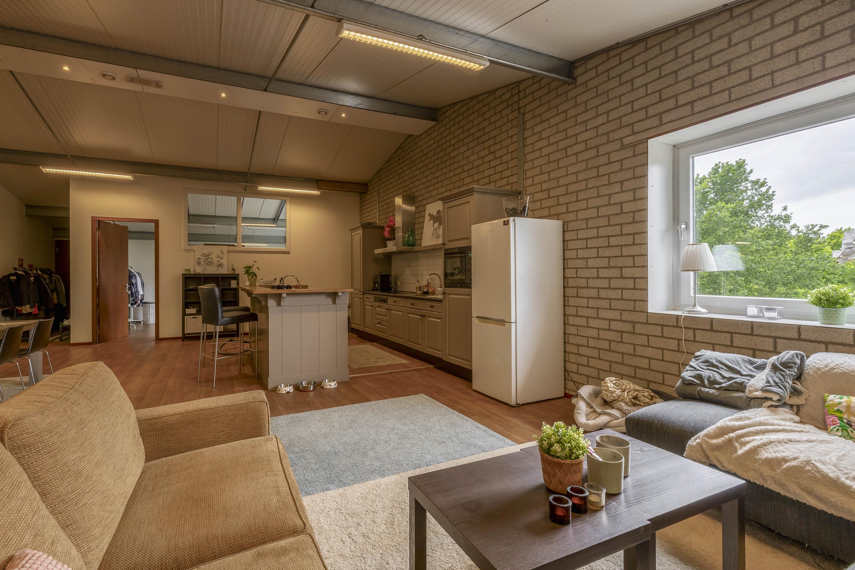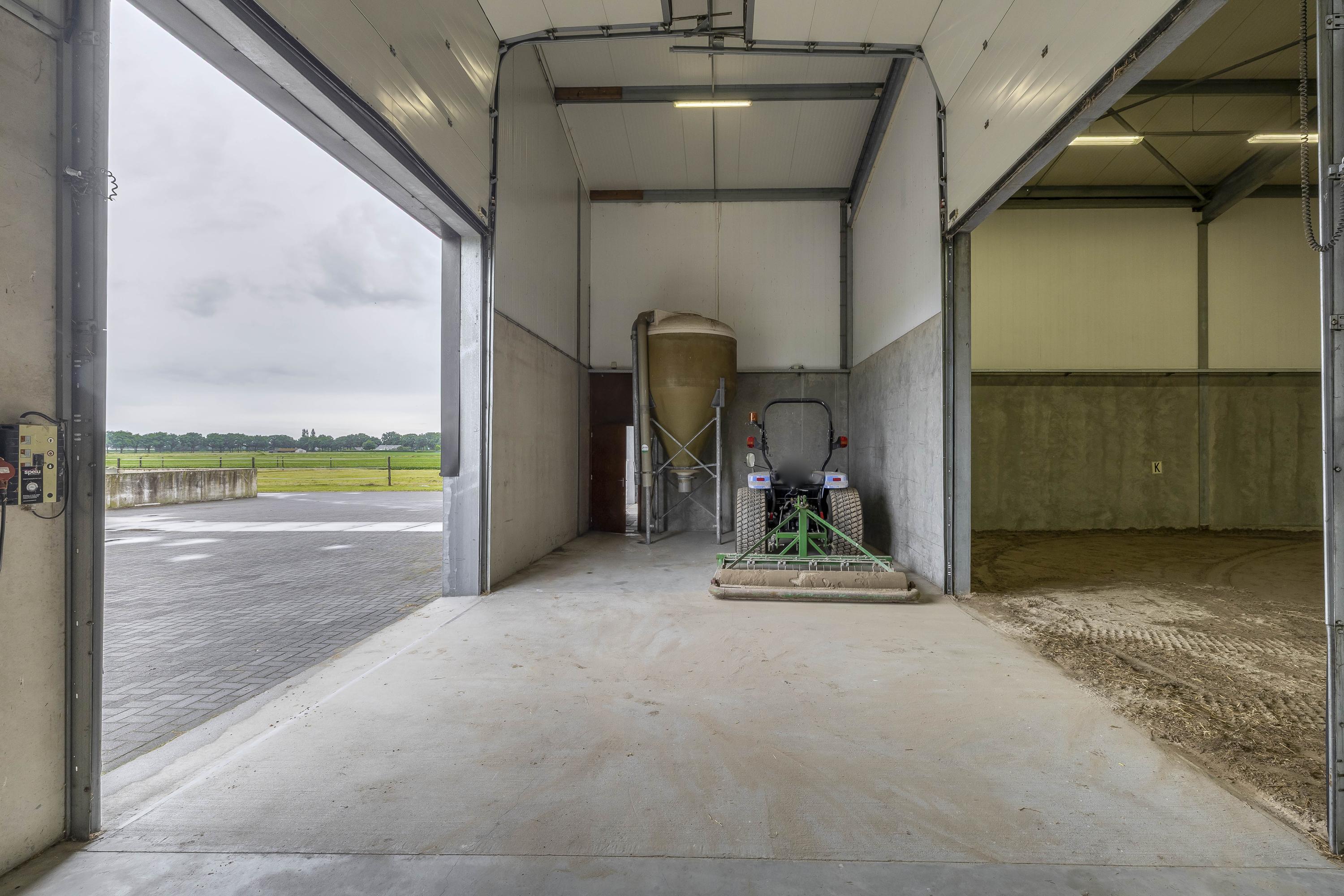 The yard is further equipped with an outdoor arena, six outdoor stables, a horse walker, a lunging circle, pasture and a manure pit. The riding hall is constructed of masonry facades, steel trusses and an insulated roof. The facades are partially clapboard on the outside. Light-transmitting panels provide natural light. On the inside, the facades are fitted with concrete elements. The indoor arena measures approx. 20 m x 40 m and is equipped with an ebb and flow floor. There is a heather. The arena is equipped with lighting. The walls are made of concrete. A roller door in the rear facade and a pedestrian door in the side facade provide access. The stable area is equipped with no fewer than 20 horse stalls, the front walls of which are partly made of plastic and partly of galvanised steel. The stalls have concrete partition walls and rear walls and are equipped with sliding doors. At the front of the hall is the shed/workshop, which has a concrete floor and walls and a concrete slab ceiling. On the right-hand side is the staircase to the reception area and the apartment on the first floor. The spacious reception area has a PVC floor and partly brickwork/partly stucco facades. There is a kitchen unit equipped with a sink, a refrigerator and storage space. The bedroom has the same finish as the reception area. The bathroom has a shower and a washbasin. There is also a floating toilet. From the reception area, there is a beautiful view of the indoor arena. The storage room contains the connections for the washing machine, the underfloor heating unit, the central heating boiler (Nefit Topline) and the inverter for the solar panels. The straw storage at the rear of the riding hall has a concrete floor. The feed silo is located here. A roller door at the rear and a pedestrian door provide access to the yard. The roof is insulated.