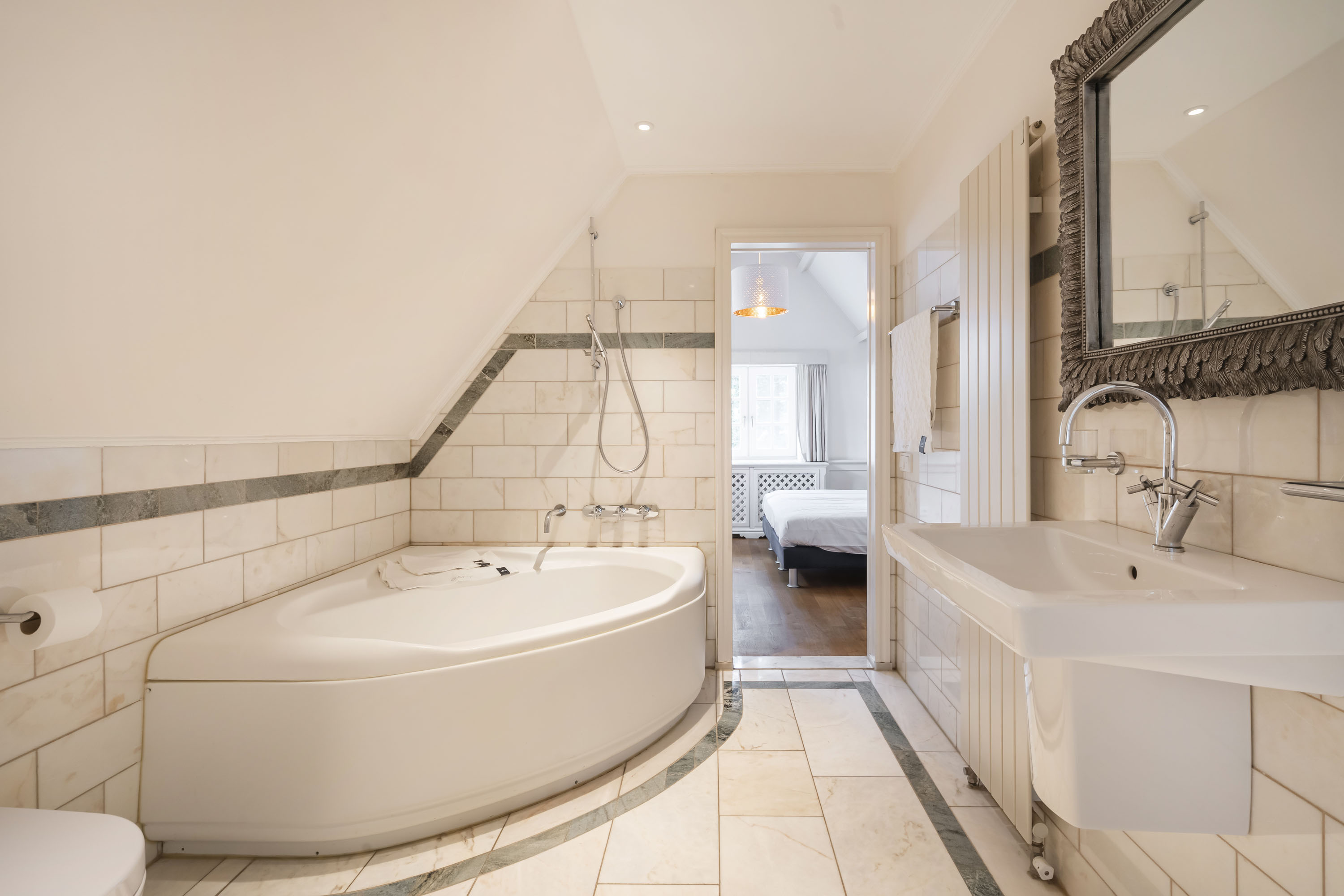 - slaapkamer eveneens voorzien van badkamer, uitgevoerd met hoekbad en douche, toilet, bidet en wastafel.