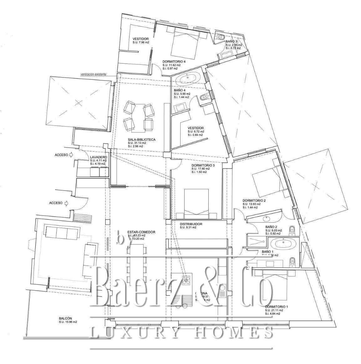 Four bedrooms offer privacy and each boasts a dedicated en-suite bathroom. Parquet floors run throughout, enhancing the interplay of warm character and sleek Scandinavian design. A private terrace of 16 m² extends the living space outdoors, inviting glimpses of Palma’s gentle Mediterranean light. For urban convenience, a parking space is included in the neighboring building.