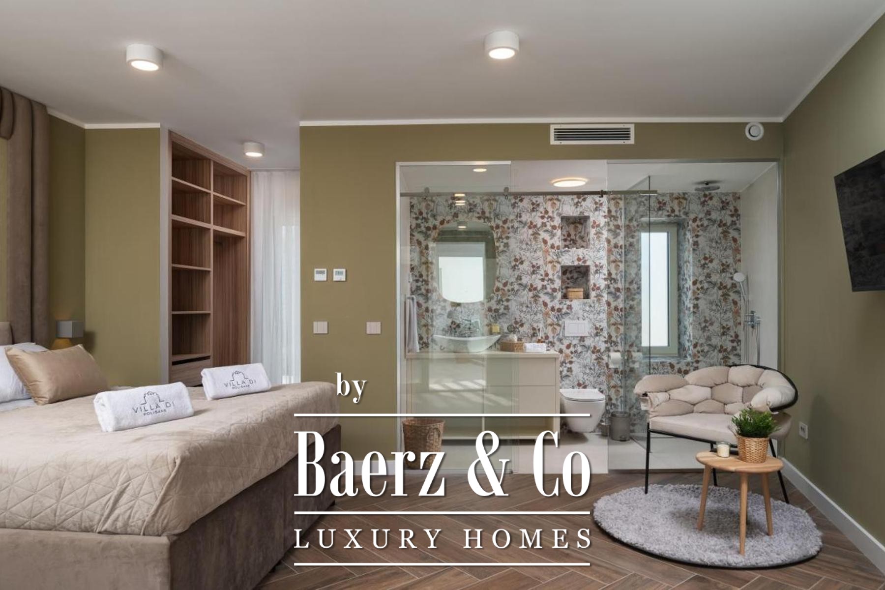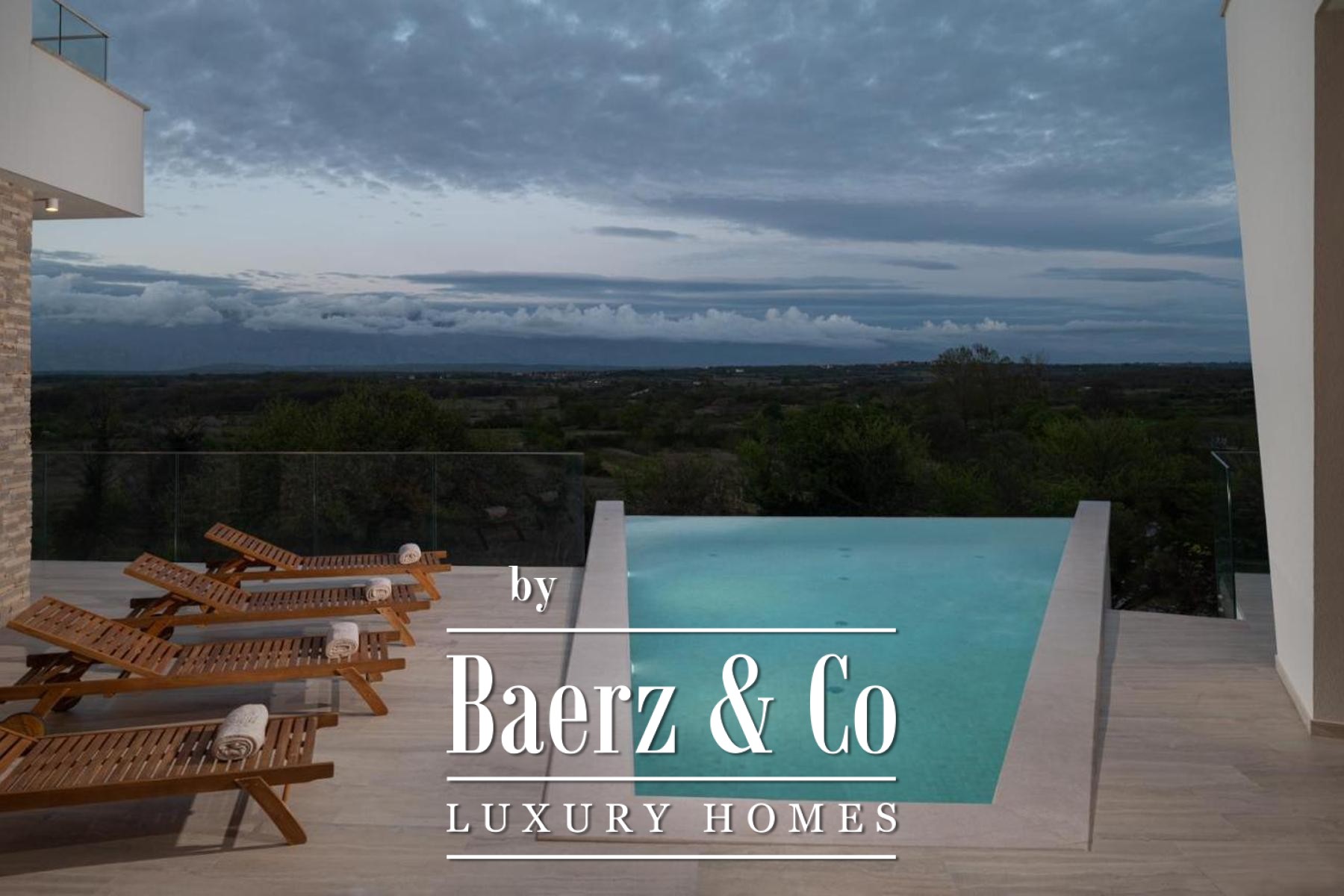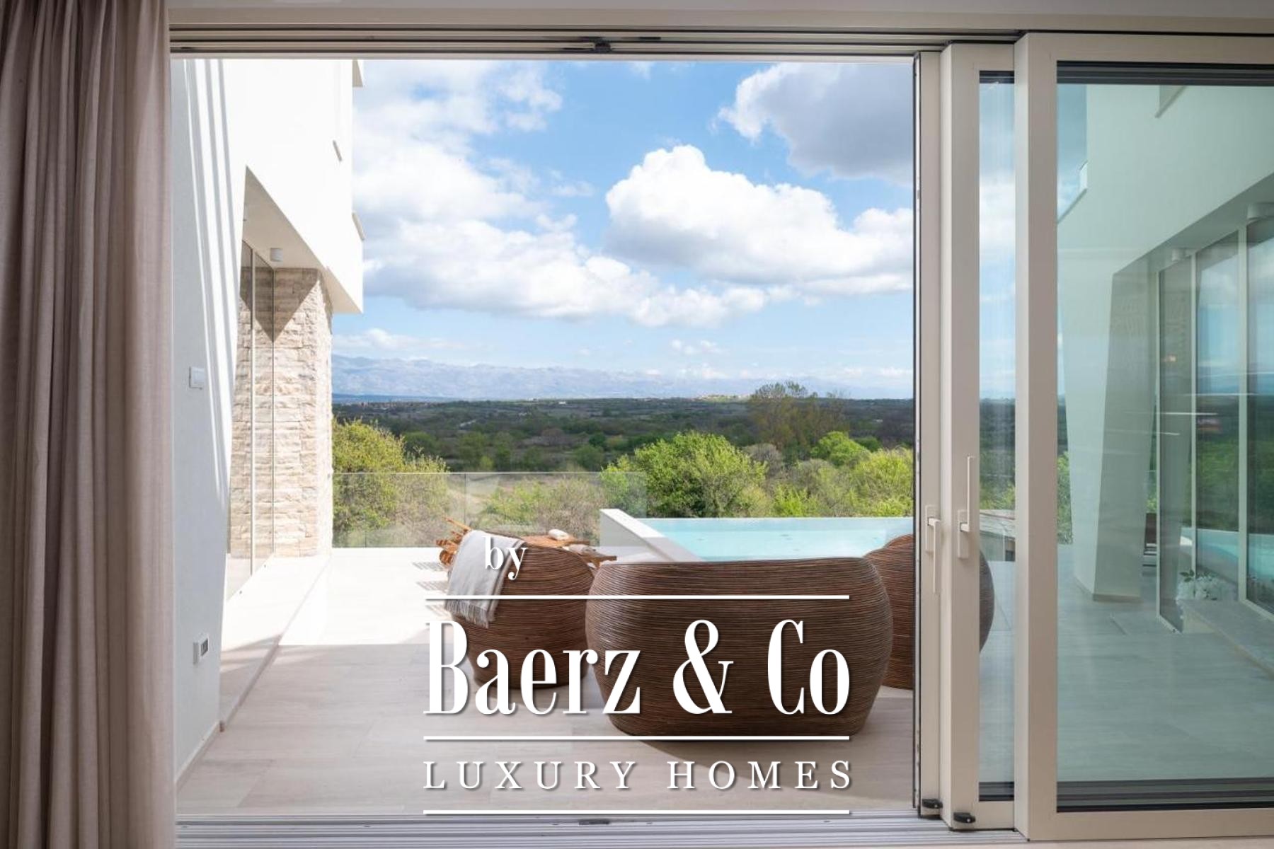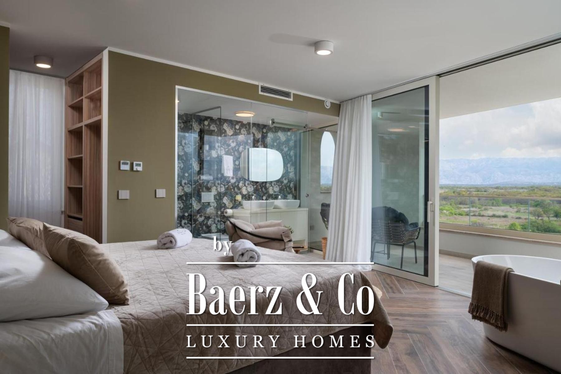 On the lower level, a game room adapts effortlessly to leisure or cinema needs. The upper floor houses four bedrooms, each with an en-suite bathroom and walk-in closet. Two principal suites command views of the Velebit mountain range, while the remaining bedrooms share a spacious terrace with similar panoramas. Offering privacy, light, and a constant dialogue between interior and landscape, this luxury villa for sale in Poličnik is a retreat attuned to both solitude and gathering.