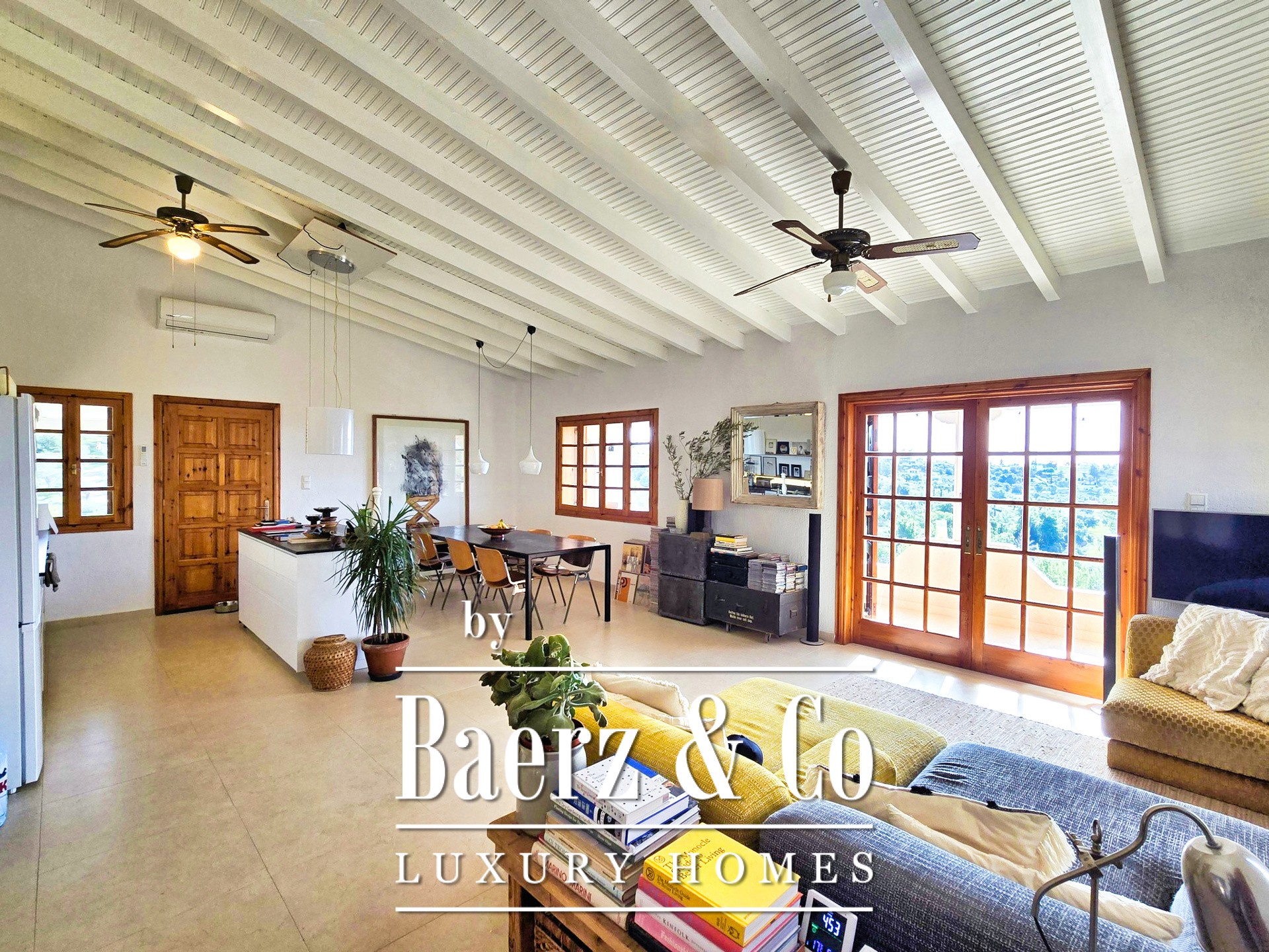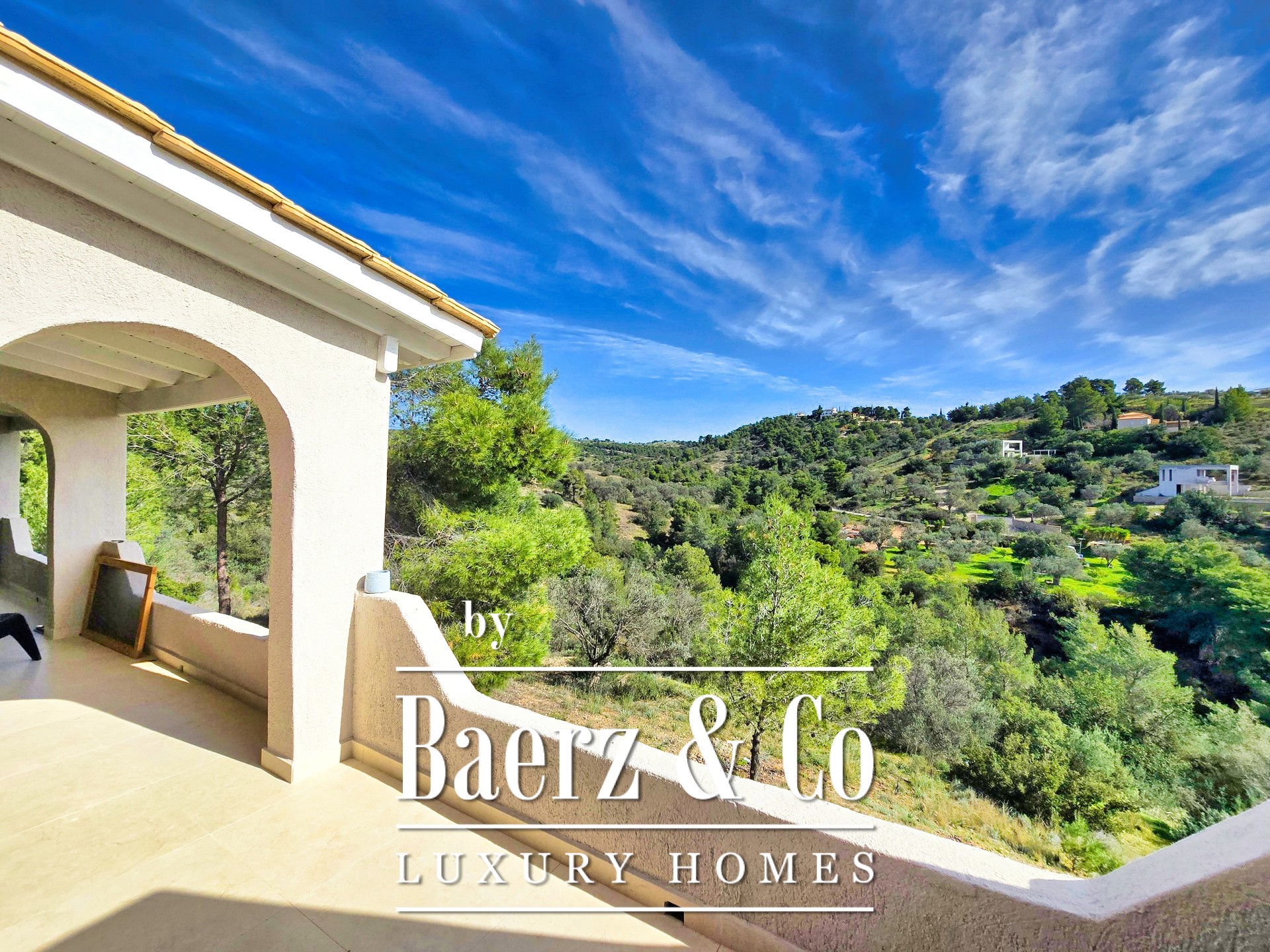 Detached house Portocheli presents a rare opportunity to experience refined living amidst natural beauty. This independent residence, with a total living area of 126 m², is set within a 2,100 m² fenced and partially landscaped plot. The house stands elevated on a quiet hillside, surrounded by elegant country homes and enriched by panoramic views of the natural landscape and the sea.