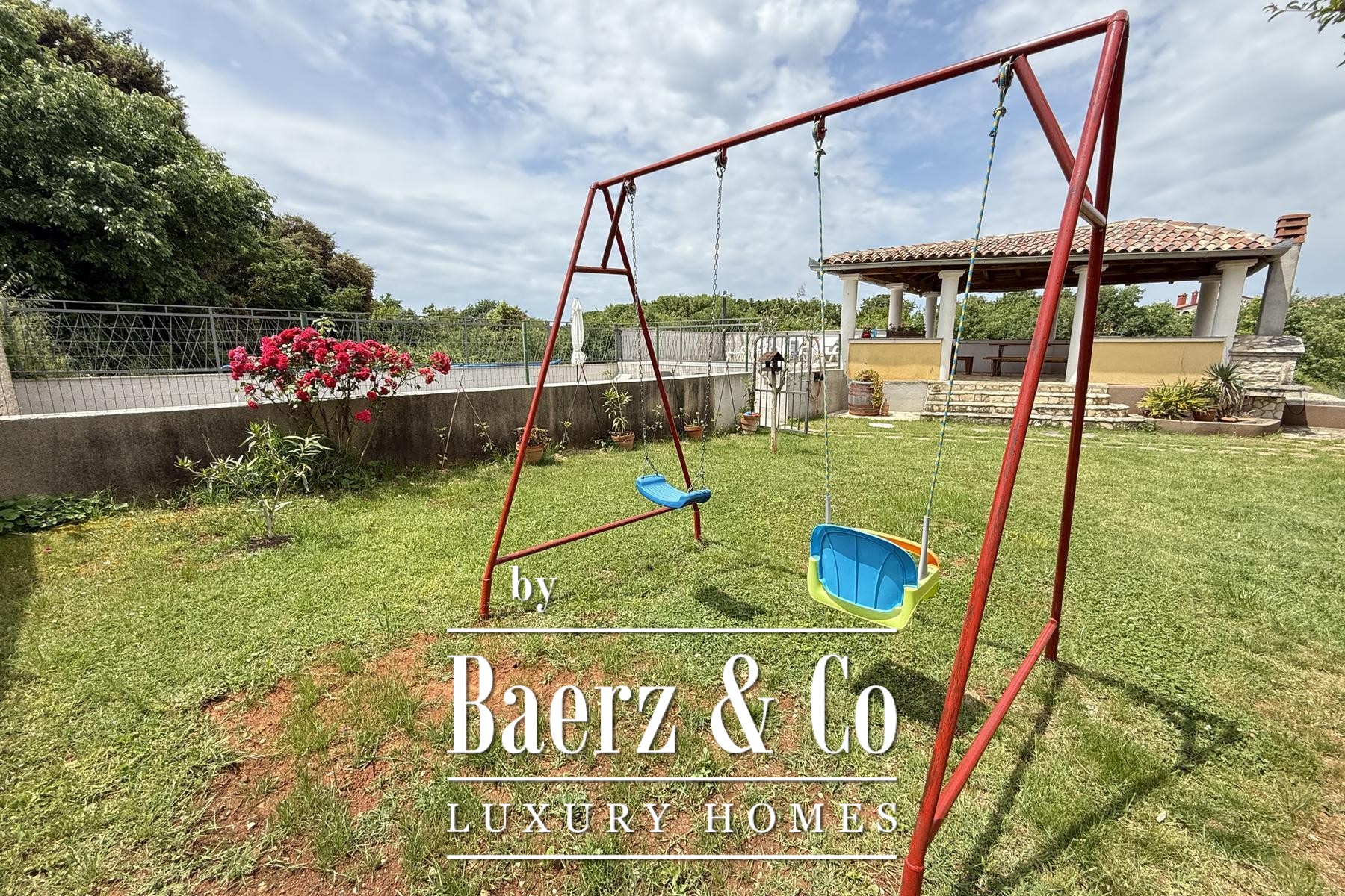 A 22 m² fenced swimming pool sits quietly within landscaped grounds, complemented by a sunbathing area and a covered space for gathering. Ample parking and a garage enhance convenience. Seven air conditioning units, gas heating, and PVC windows with mosquito nets provide everyday comfort. With separate electricity meters for each unit, this property supports both private enjoyment and tourism-oriented rental. The sea is just a short drive away, blending accessibility with retreat.