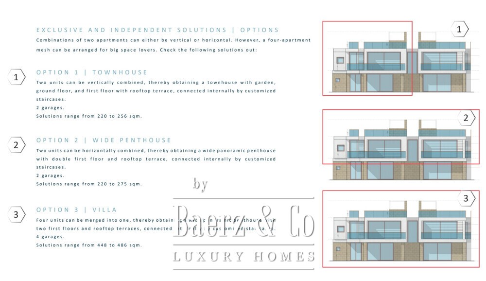 Layout reflects a commitment to quality and elegance. Living areas measure between 104 and 200 m², complemented by expansive panoramic terraces and private gardens. The finishes are meticulously crafted to individual preferences, ensuring each home stands as a testament to timeless design and exclusivity.