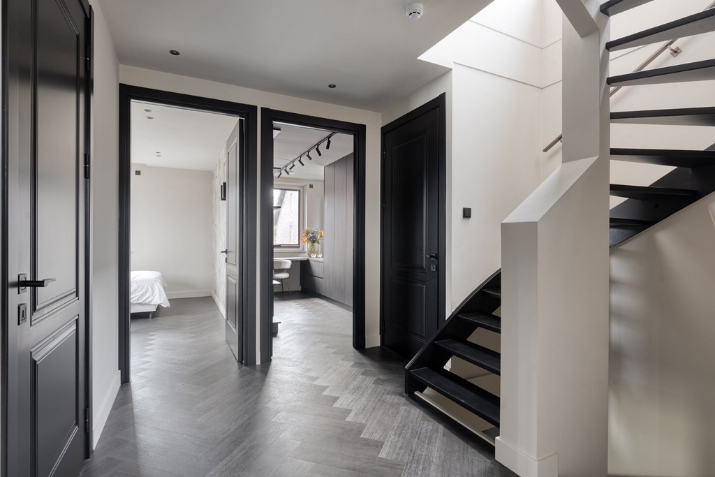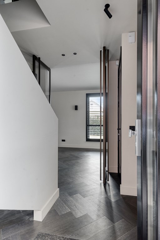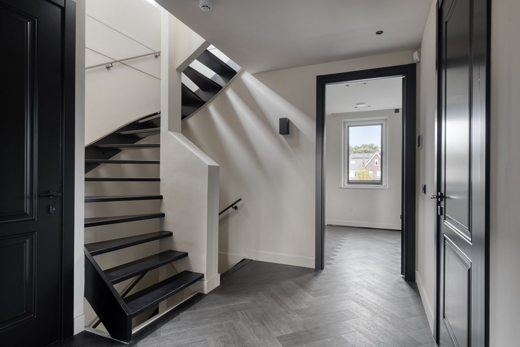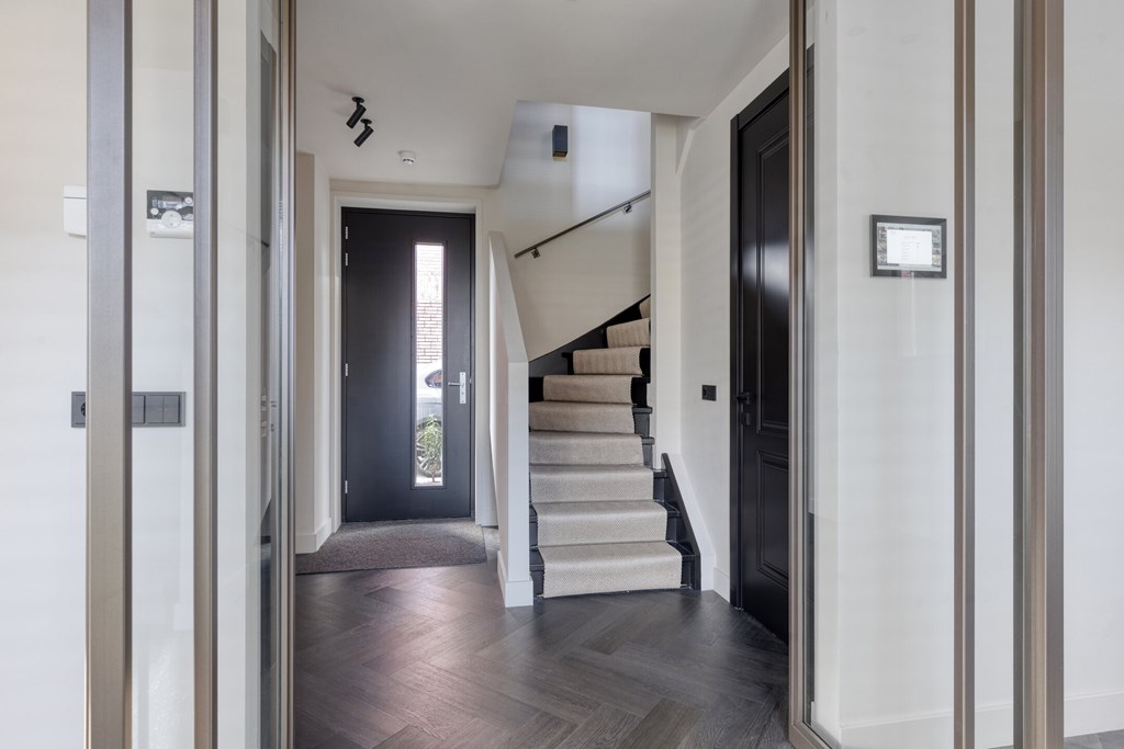 Via de voortuin en de eigen oprit met parkeergelegenheid voor twee auto’s en een laadpaal, betreedt u de woning. Ook in de directe omgeving is parkeerruimte aanwezig. In de ruime ontvangsthal springt de stijlvolle trap direct in het oog waar het daglicht fraai invalt – doordat deze open doorloopt naar de tweede verdieping een echte eyecatcher. De hoogwaardige afwerking is bij binnenkomst al voelbaar. Vanuit de hal heeft u toegang tot de toiletruimte, de woonkamer en de trap naar de eerste verdieping.