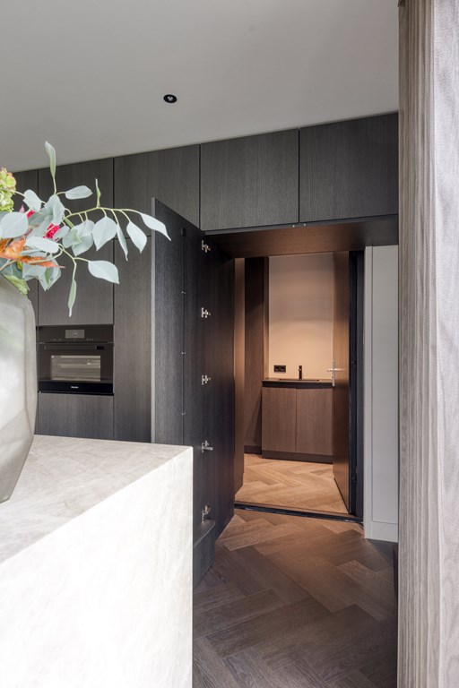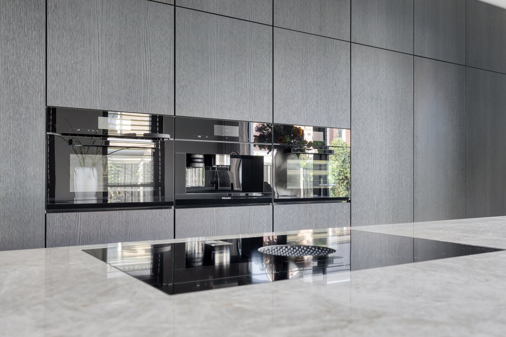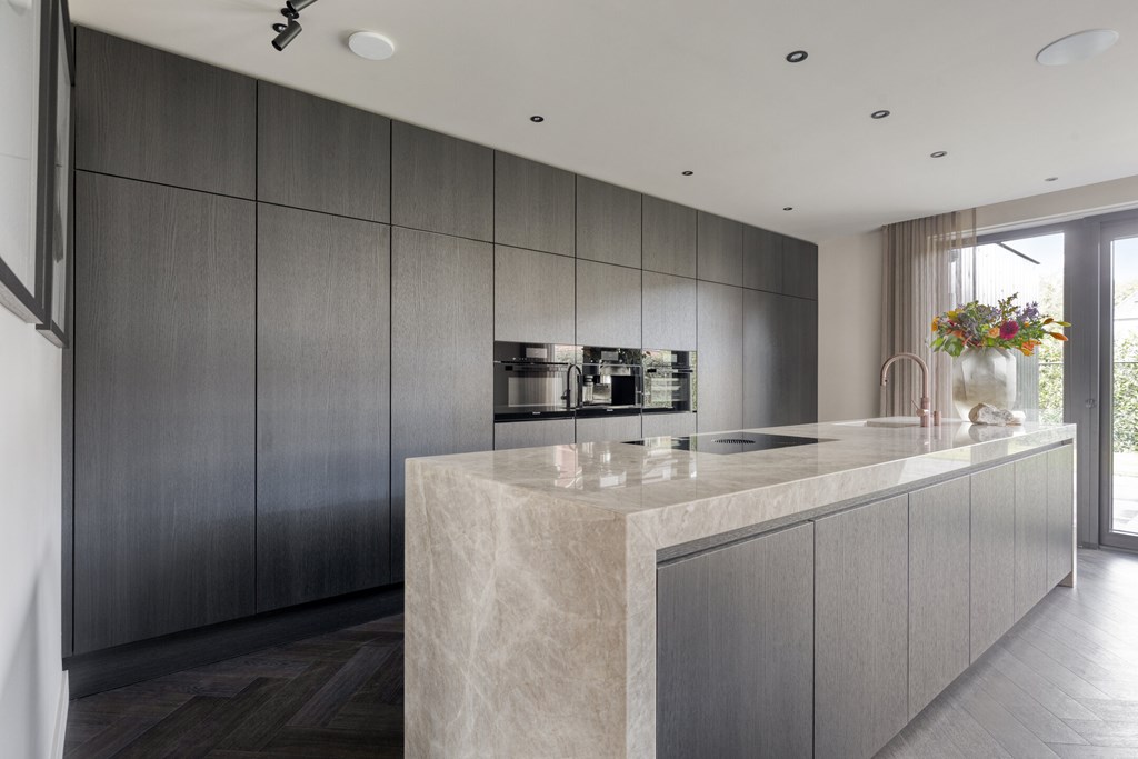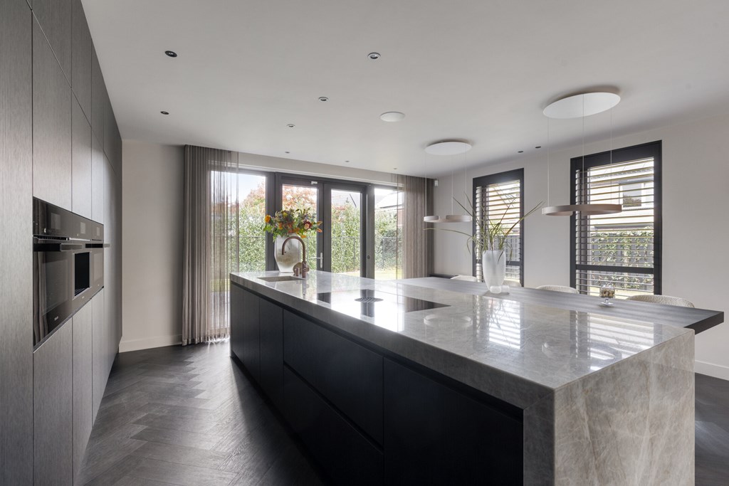 De moderne leefkeuken vormt het hart van het huis en is uitgerust met hoogwaardige apparatuur. Het keukenblad is uitgevoerd in Pure Kwartsiet, een stijlvol en duurzaam natuursteen. U kookt op een Bora inductiekookplaat met geïntegreerde afzuiging, terwijl de Miele-ovens en inbouw koffiemachine en de grote koelkast, vriezer en vaatwasser van Siemens zorgen voor optimaal kookcomfort. De keuken biedt voldoende ruimte voor een royale eettafel en heeft openslaande deuren naar het terras, waardoor u direct buiten kunt dineren of ontspannen.