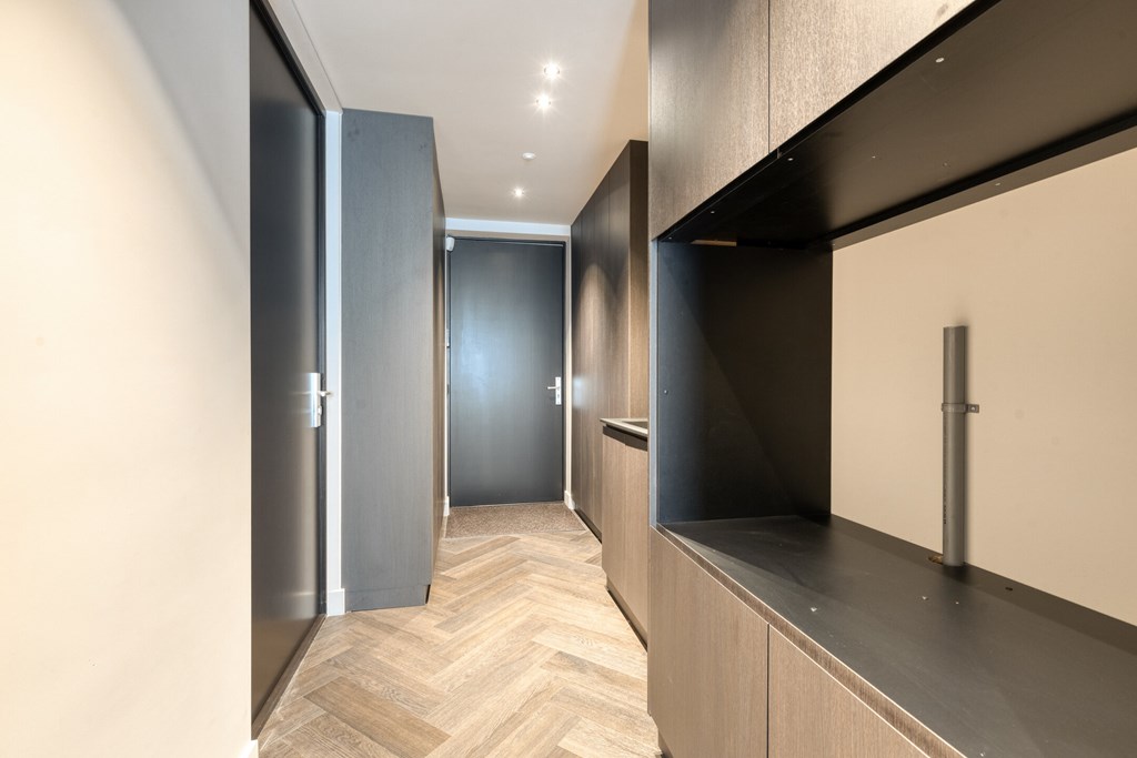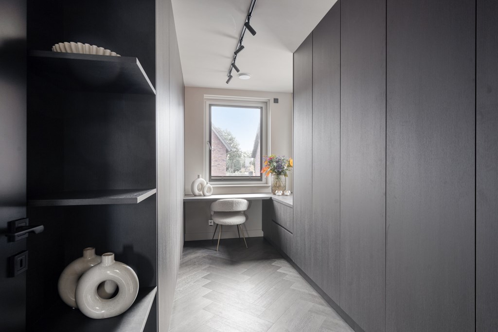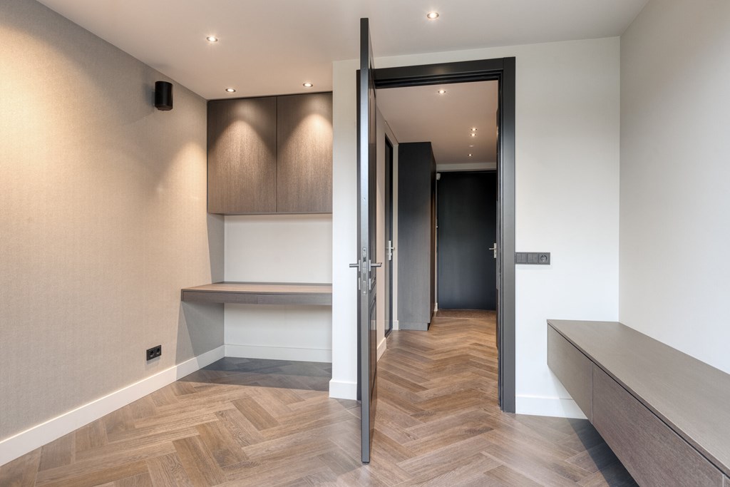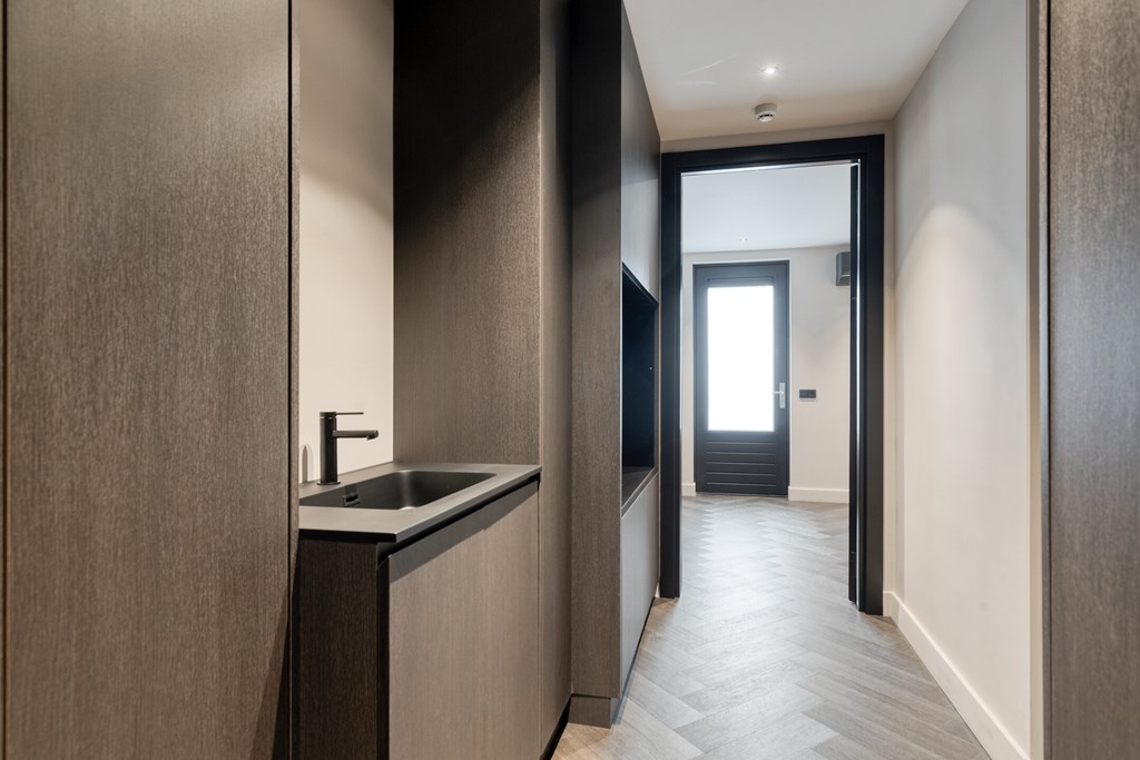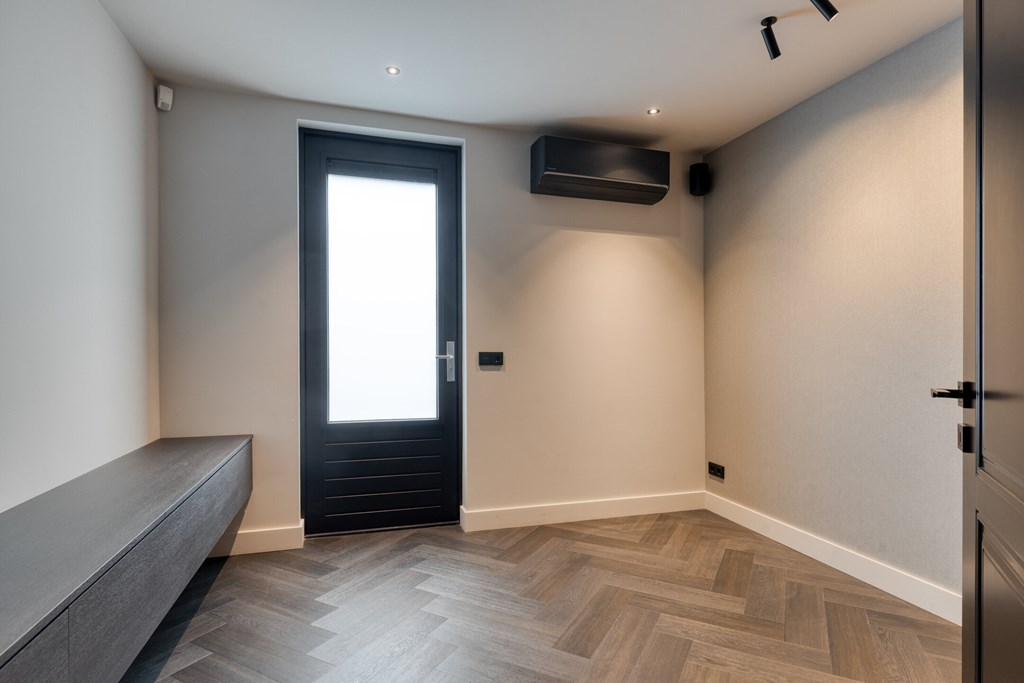 Achter een onopvallende deur bevindt zich de praktische bijkeuken, met ruimte voor opslag en huishoudelijke apparatuur. Deze ruimte grenst bovendien aan een extra kamer die zich uitstekend leent als werk-, hobby- of speelruimte.