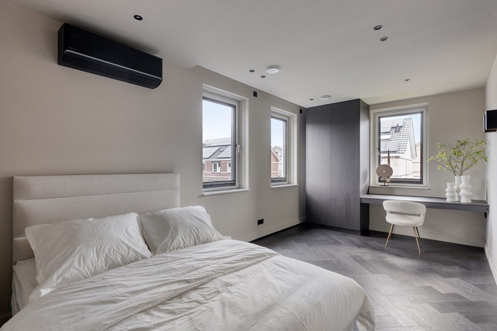 De trap in de hal leidt naar de eerste verdieping, waar u drie ruime slaapkamers en een hoogwaardig ingerichte badkamer aantreft. De gehele verdieping beschikt over vloerverwarming en vloerkoeling. Twee slaapkamers zijn voorzien van airconditioning en maatwerk kasten en bureaus. De derde slaapkamer is ingericht als kastenkamer. Bovendien zijn er screens geplaatst voor optimaal comfort in elk seizoen.