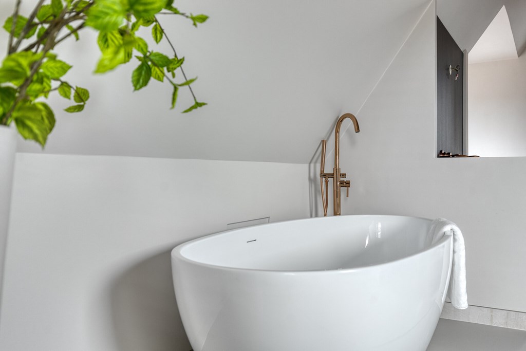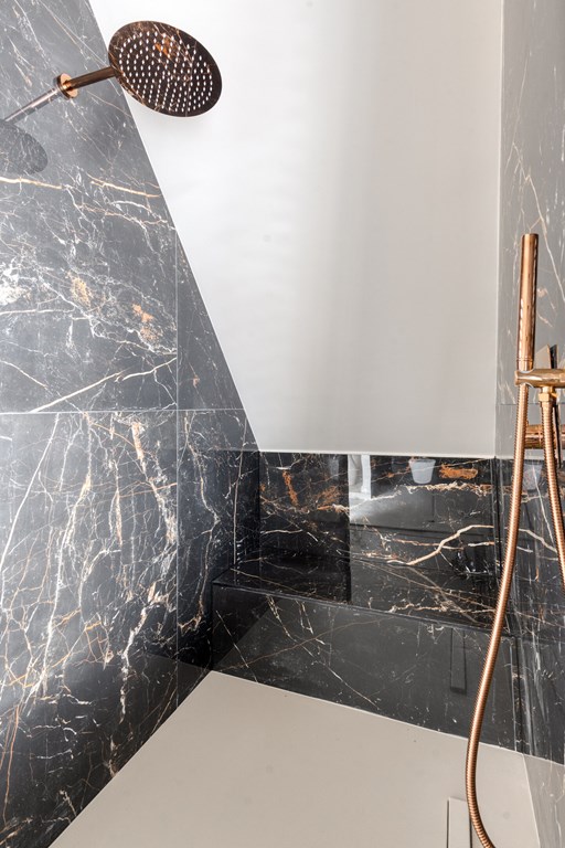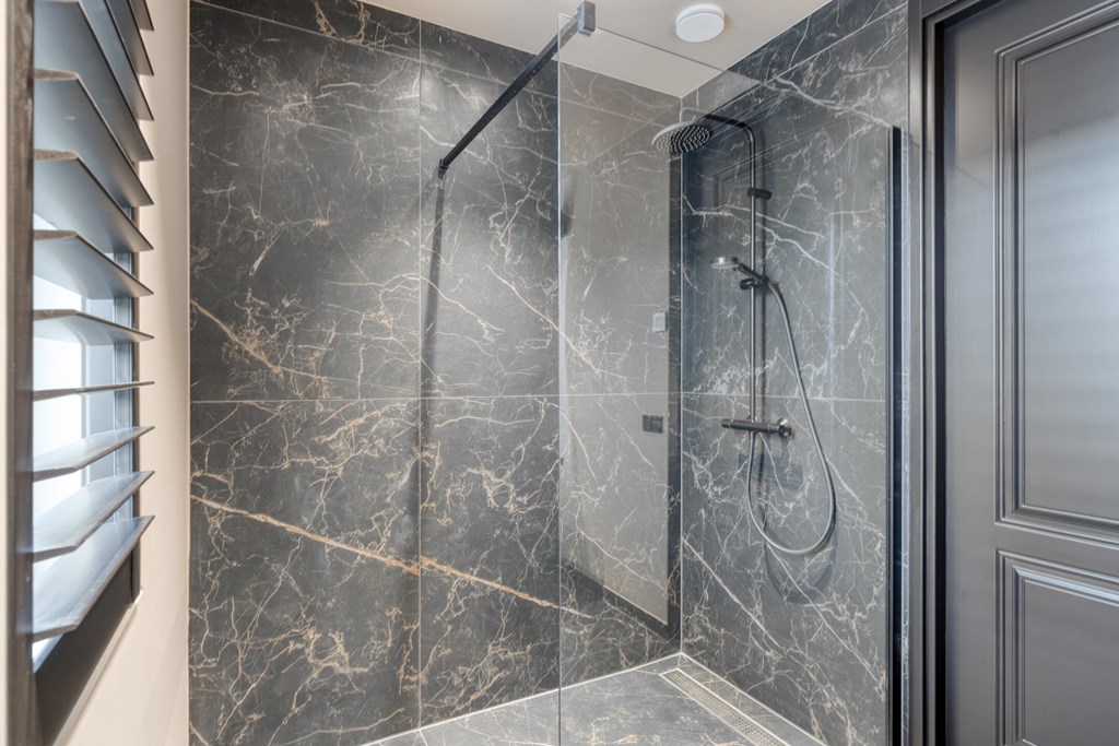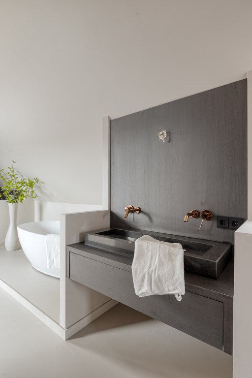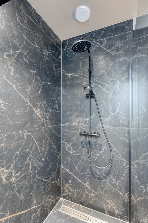 De moderne badkamer is volledig betegeld en voorzien van een inloopdouche met glazen wand, een dubbele wastafel met spiegel en Sonos-speaker. Op de overloop bevindt zich een separate toiletruimte met zwevend toilet. Alles straalt kwaliteit en comfort uit.