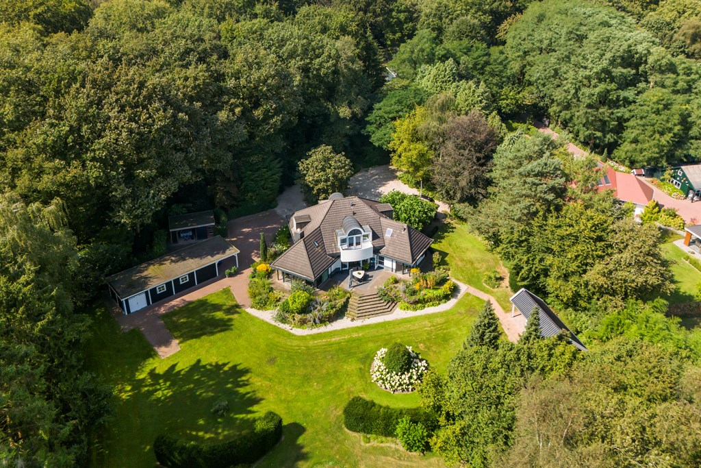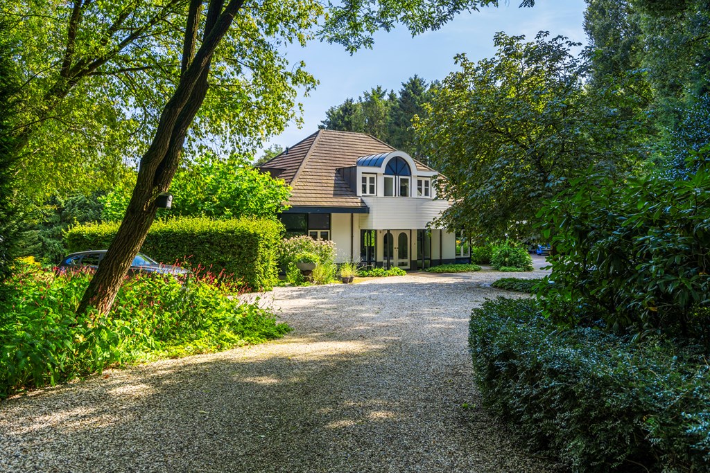 The driveway brings you onto the beautiful plot, bordered by plants and trees. The lush southeast-facing rear garden offers a green, open landscape. With a large lawn, there is ample space for children to play—or simply enjoy the peace, sun, and privacy. A paved terrace at the house provides a wonderful view over the garden. There is also a second, covered terrace where you can relax in the shade on warm days—this forms part of the new (2022) barn-style shelter with storage for garden tools, chairs, etc.