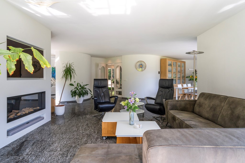 You enter a spacious, bright hallway giving access to the living room, a study, WC, meter cupboard (21 circuits + fiber), and the staircase. The study is ideal—perfectly placed for receiving clients, for example. The generous living room has a distinctive layout, making it easy to create multiple seating areas. Large windows all around provide beautiful garden views and abundant light; a cosy gas fireplace adds warmth. Twin sliding doors open directly onto the sunny rear garden. On the sunny side, external screens provide extra comfort.