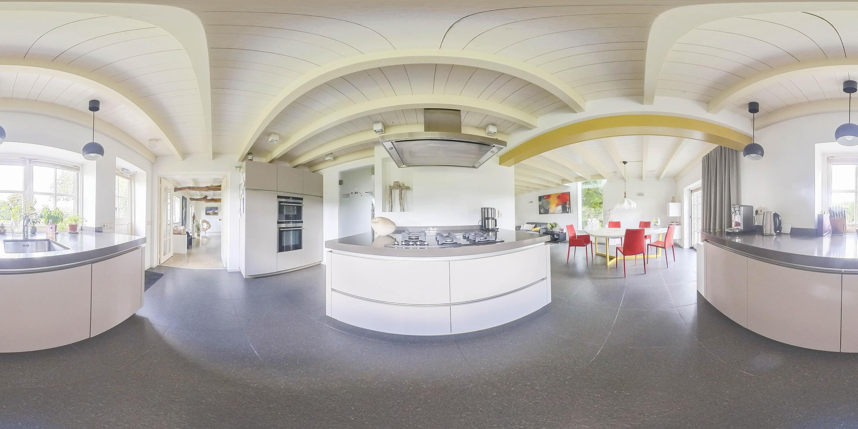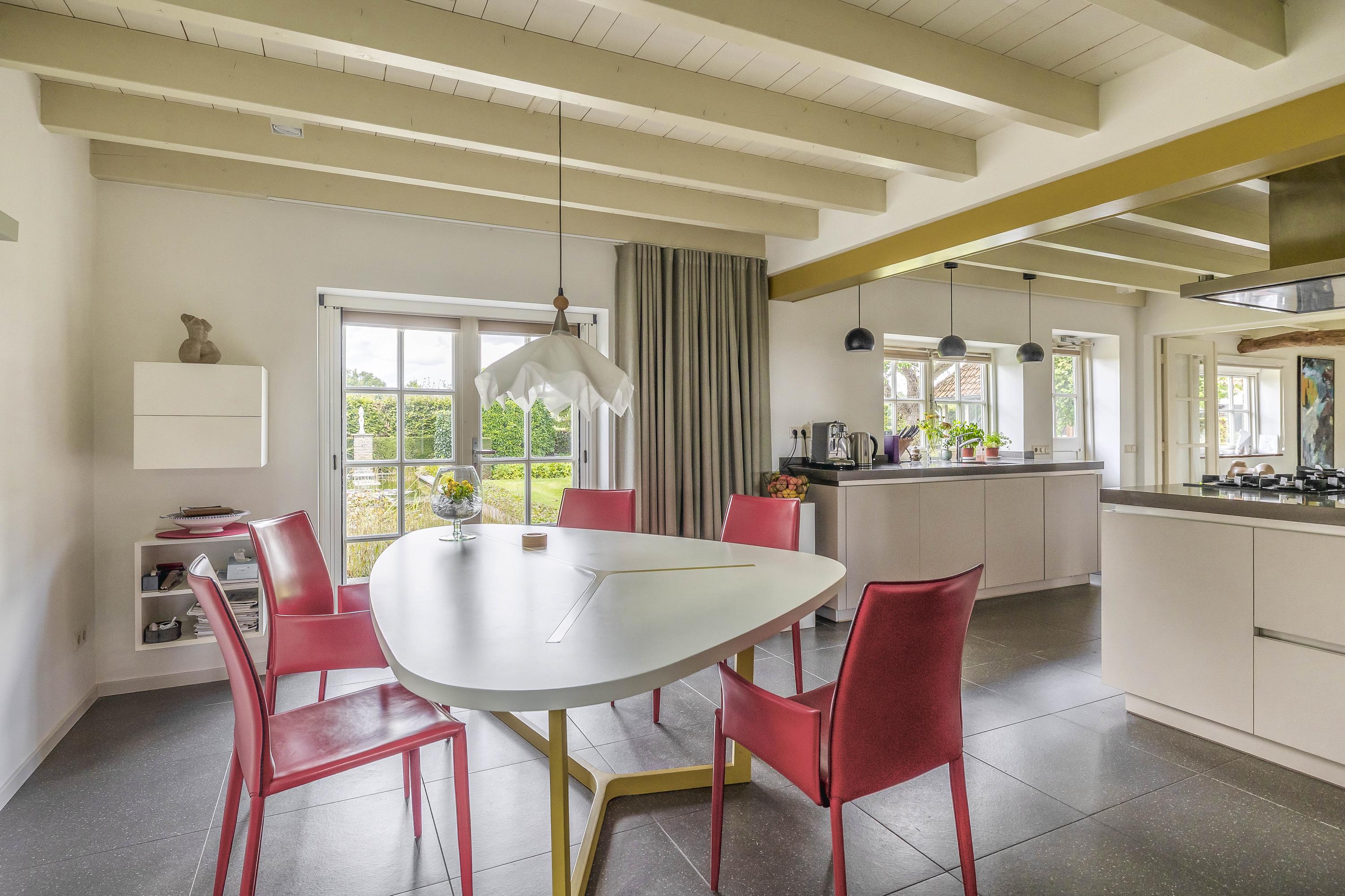 From the hall, you enter the spacious kitchen on the left side of the house. The kitchen also has a tiled floor with underfloor heating, stucco walls, and a beautiful wooden beam ceiling. In 2011, the kitchen was completely renovated. It features a cooking/island with a composite countertop, a 5-burner gas hob including a wok burner, extractor hood, and ample storage space. A wall unit with a composite countertop is equipped with a large sink, dishwasher, and a close-in boiler. Another wall unit contains a freezer, refrigerator, oven, and steam oven. From the kitchen, you have access to the backyard through a door and double French doors. The atmosphere is enhanced by the wood-burning stove and a beautiful high window on the side wall with a view through a glass panel in the bedroom on the first floor. There is also a built-in cupboard with the underfloor heating distributor.