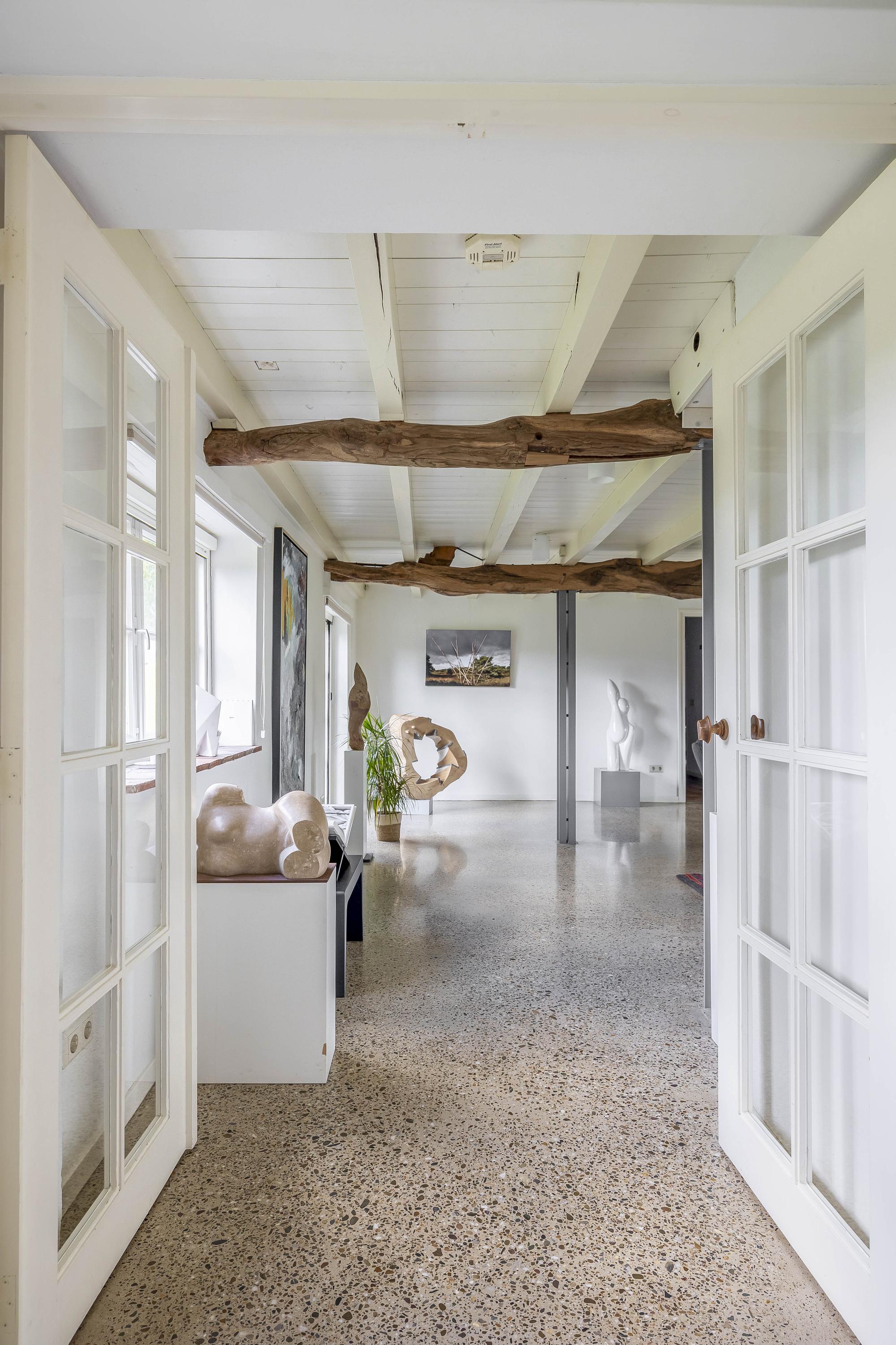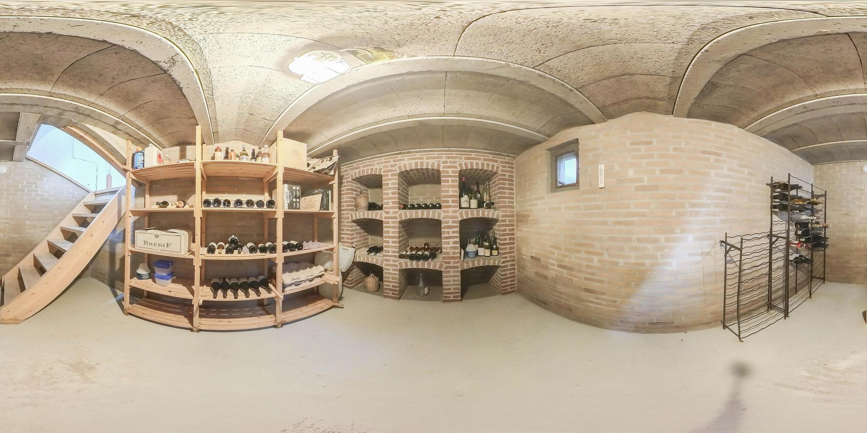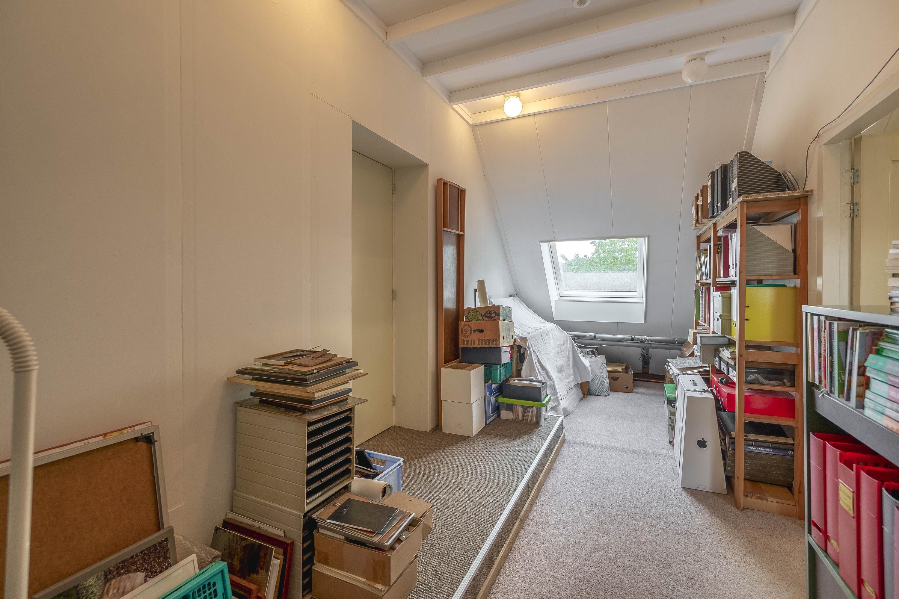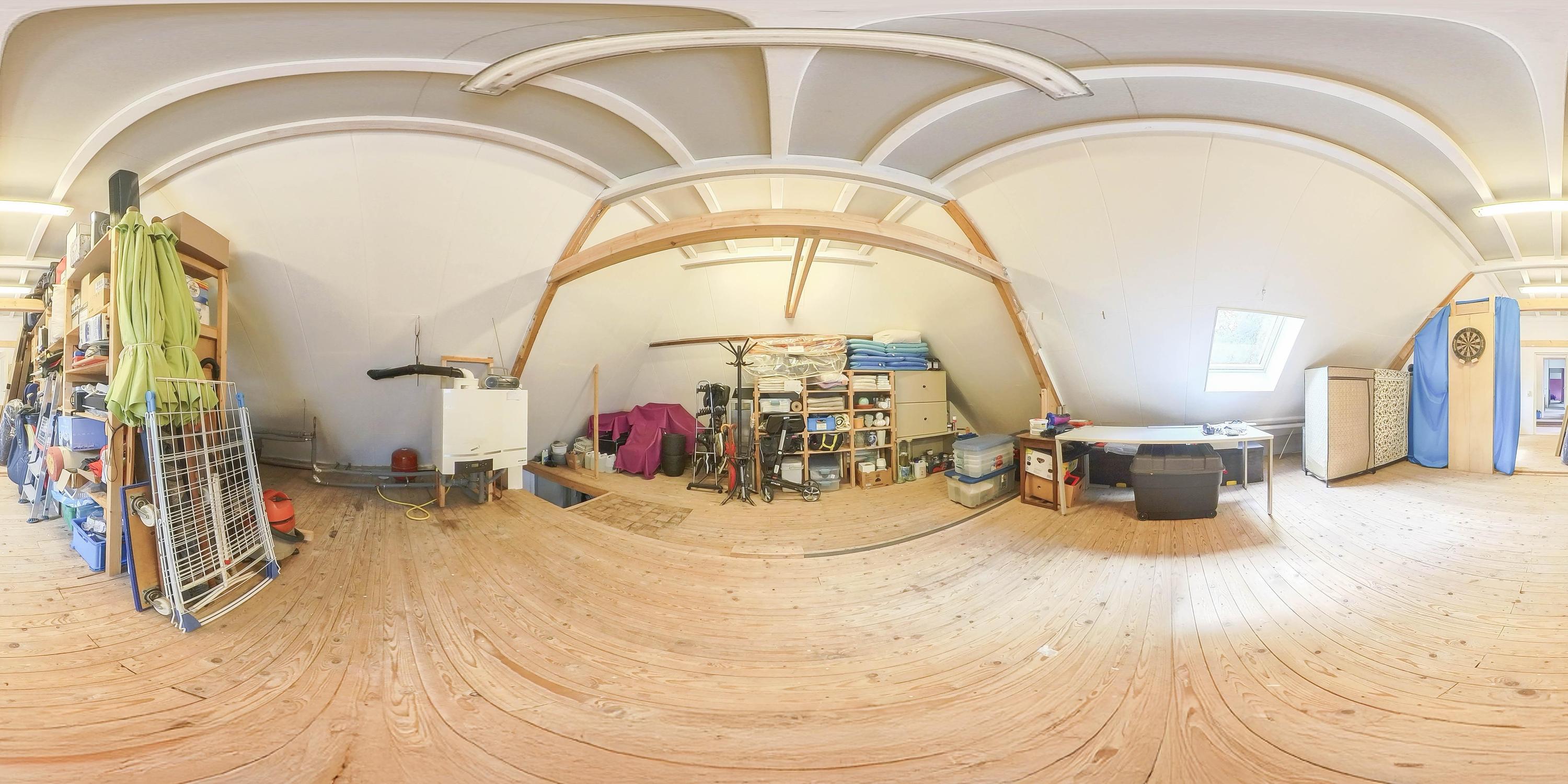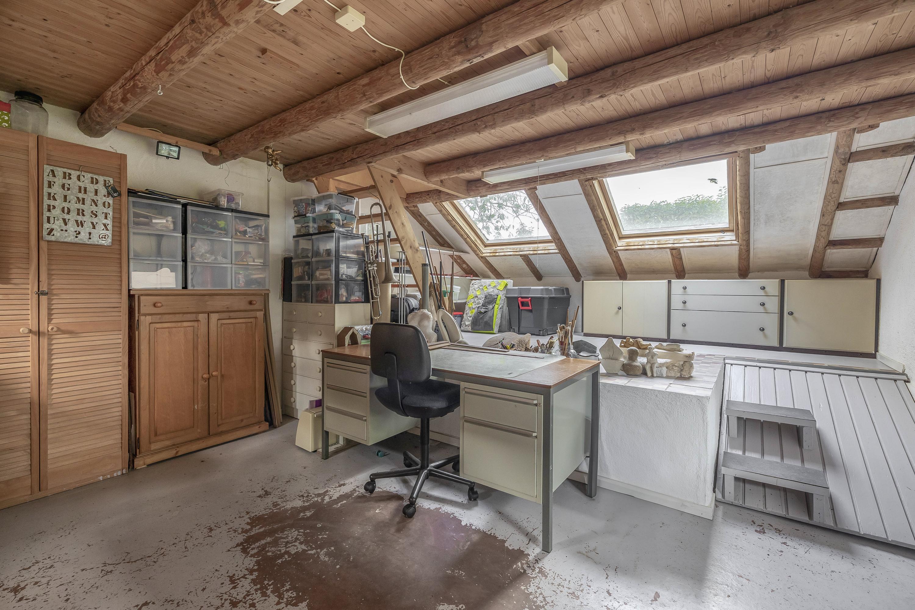 The part of this annex that is used as a studio has a concrete floor, two skylights at the rear, windows on three sides, and a sink with cold water connection. From here, a fixed staircase provides access to an attic space with a large Velux skylight and ample storage space. The studio space also has a man-sized wine cellar, accessible via a hatch with a fixed staircase. The studio space is also equipped with a gas wall heater.