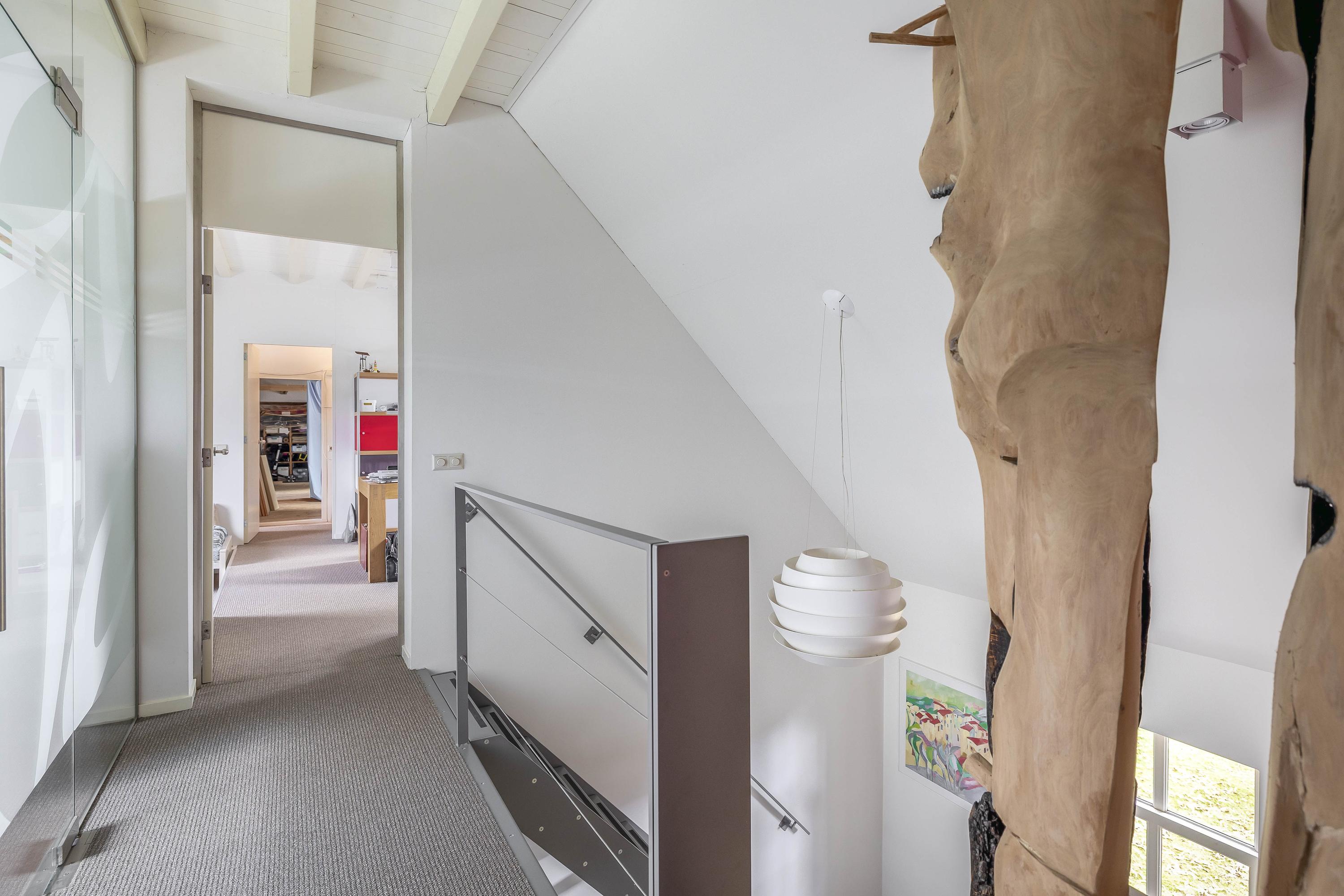From the fixed staircase in the entrance hall, you reach the first floor of the main house. Here you will find a spacious landing with carpeted floors, stucco walls, and a beamed ceiling, with a view into the hall on the ground floor. From here, you have access to two bedrooms and the second bathroom.