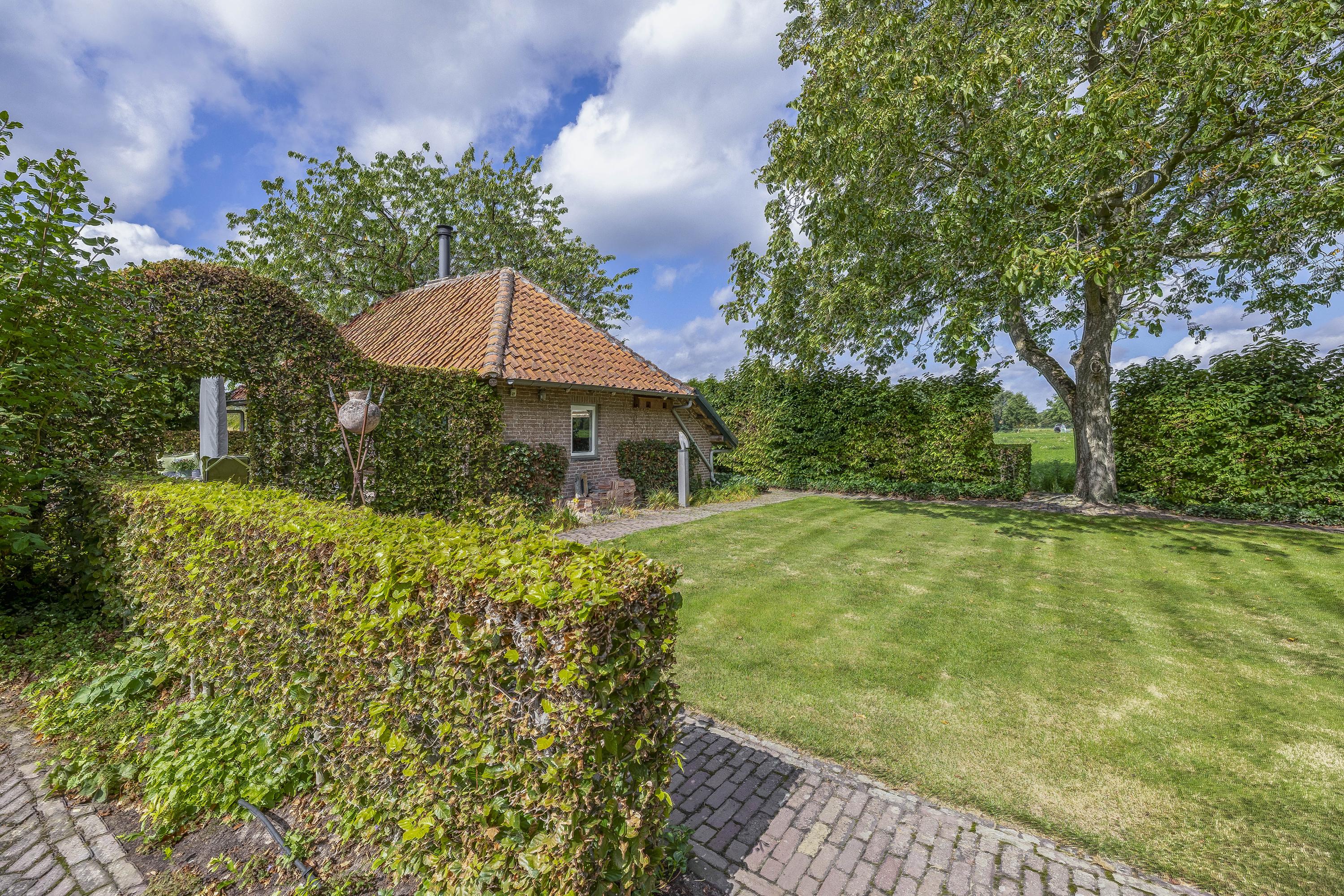 Behind the house and on the sides is a beautifully landscaped garden. On the left side is a nice, spacious area with a lawn, plant borders, old baked clinker paving, and various beech hedges. At the rear, you can enjoy a beautiful view, a large pond (with biological filter), a spacious lawn, plant borders, and mature vegetation. The garden is well laid out and well maintained. There is a double driveway on the right side of the property. The garden even offers the possibility of keeping small animals. There is also a section of the garden with a “lovers' lane.” To the left of the house is a landscaped jeu-de-boules court.