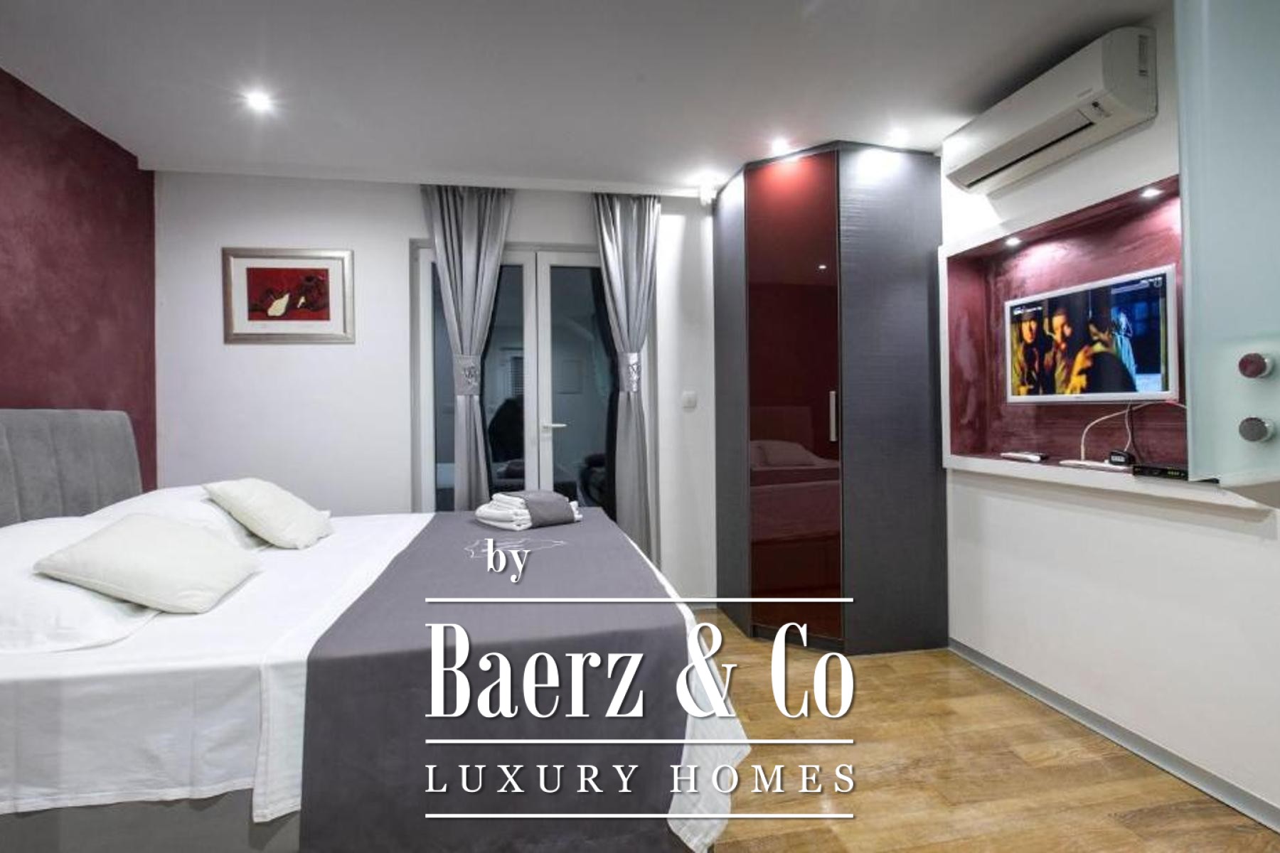 The upper level presents a luminous living space with a kitchen and dining area, two bedrooms, and two bathrooms, with each main room connecting to balconies oriented towards sea and pool views. Flexibility is integral, as the first floor can be separated into independent apartments to suit a range of lifestyles or hospitality needs. Refined finishes and premium furnishings underscore every detail, while thoughtful amenities include a tavern with barbecue, an inviting space for dining and gathering, and a sunlit yard. Three parking spaces complete the picture of relaxation and opportunity in Croatia’s coastal landscape.