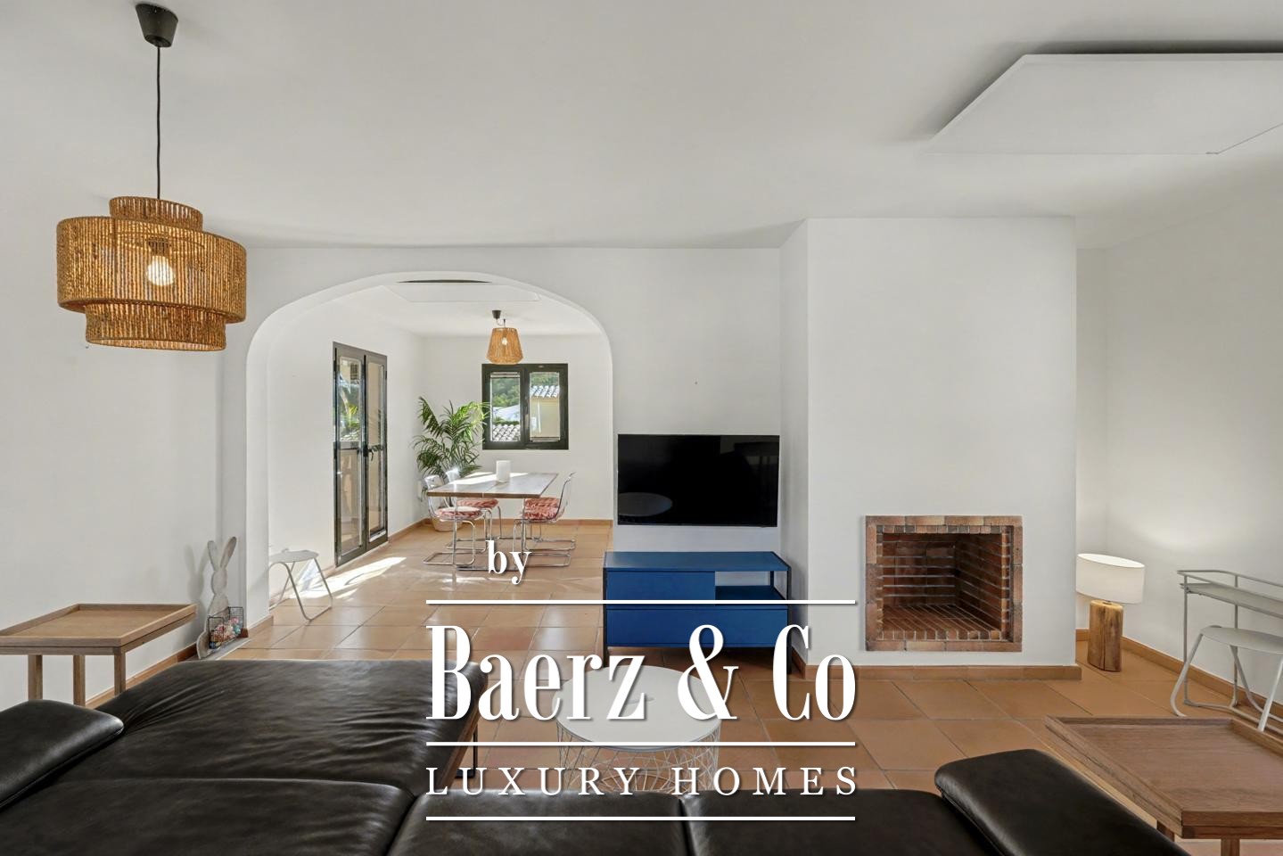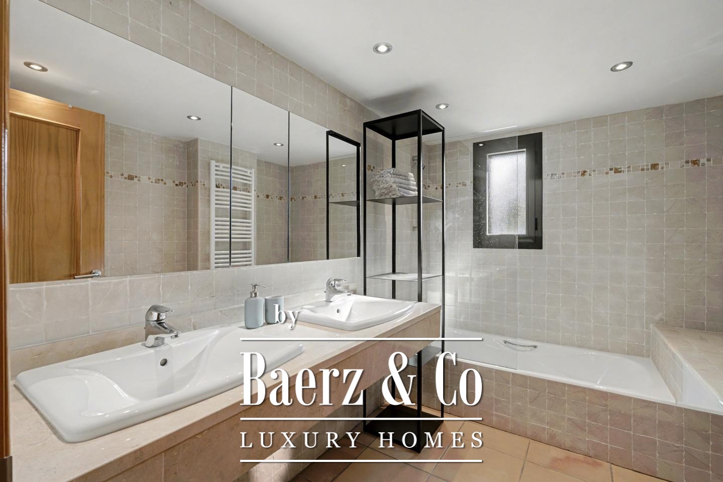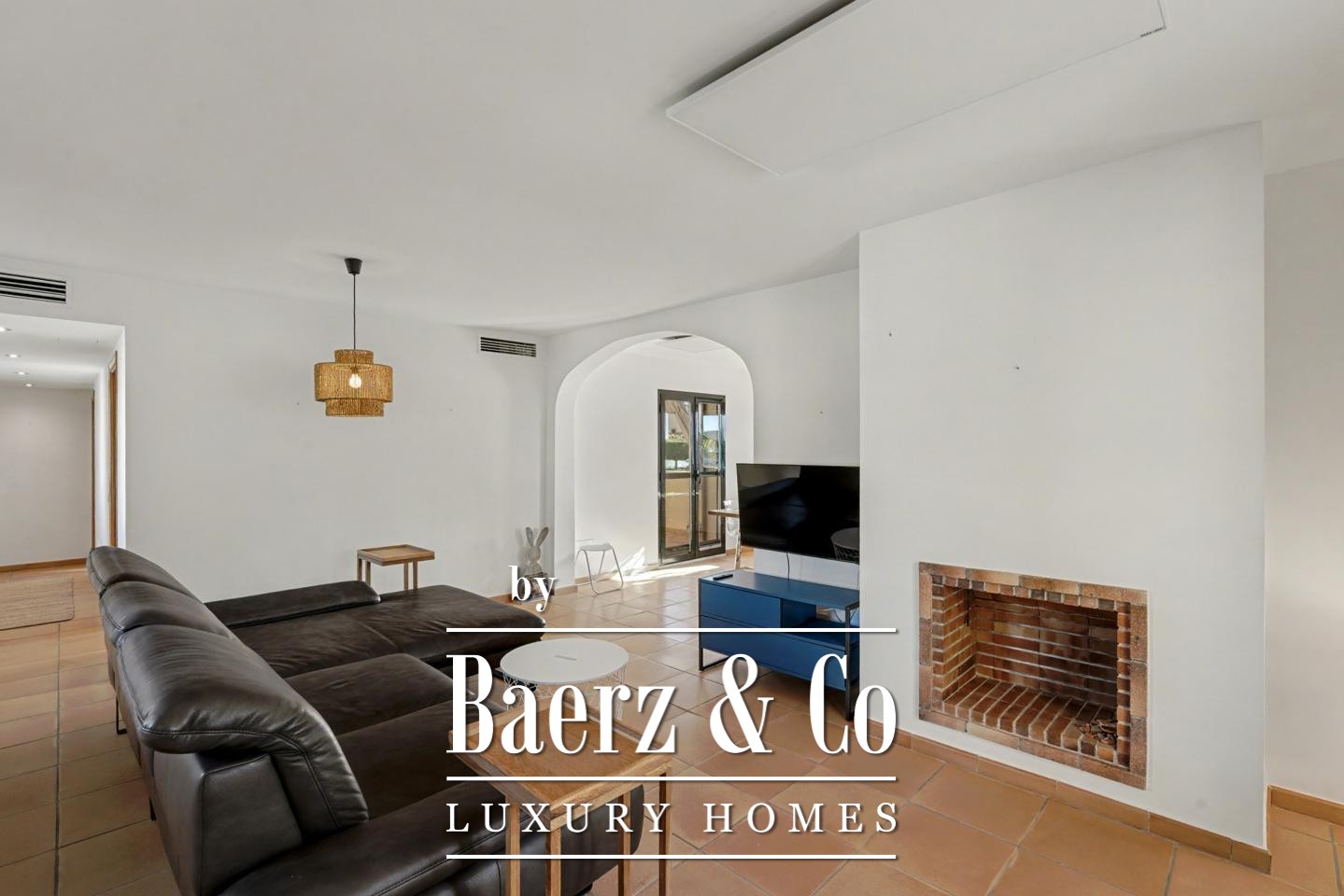 A generous entrance hall invites you into refined, luminous interiors. The living room, complete with fireplace, opens onto a terrace where the sea becomes a constant companion. An open-plan kitchen and dining area transitions to a second terrace for al fresco gatherings, connected by an exterior staircase to communal Mediterranean gardens and a pool.