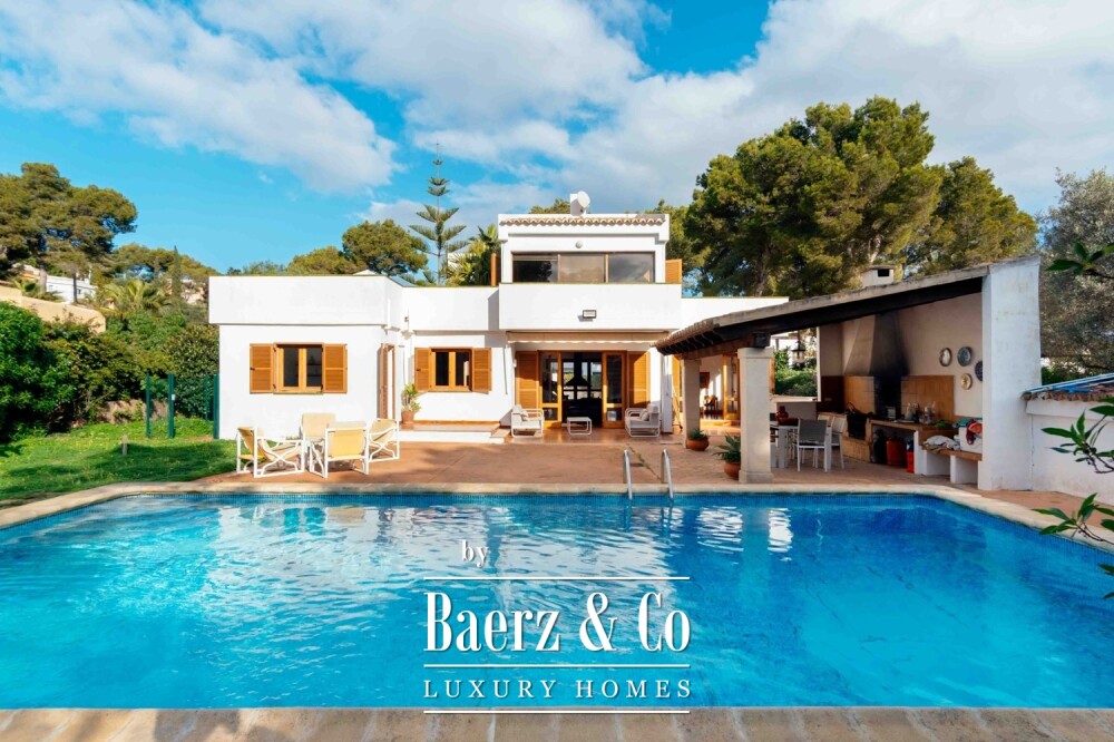Quality materials—parquet floors, air conditioning, gas central heating—create a quietly refined atmosphere. Outside, a large freshwater pool, summer kitchen with barbecue, and thoughtfully tended gardens set the stage for relaxed Mediterranean living. The villa includes a garage and terraces, all within Santa Ponça, a coastal enclave offering a refined promenade, reliable infrastructure, and swift access to Palma in twenty minutes and the airport in thirty. This property articulates location and potential in one of Mallorca’s most desirable addresses.