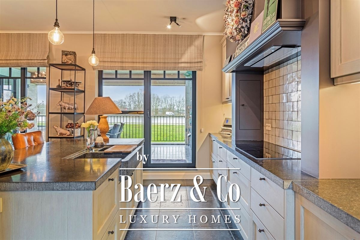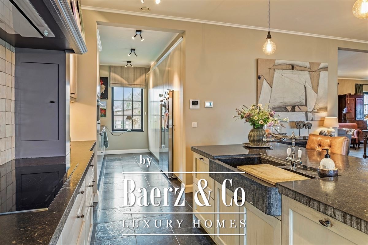 Entry is discreet, with a side door leading from either the garage or carport. A lift and staircase connect all floors, enhancing privacy and comfort throughout the property. The first floor welcomes with an oak-finished vestibule and guest toilet, unfolding into a 36 m² live-in kitchen set on natural stone, equipped with double sinks, induction hob and abundant oak cabinetry. A connected utility room of 10 m² adds further function. From the kitchen, an inviting covered terrace offers captivating canal views, enhanced by a heater for crisp mornings.