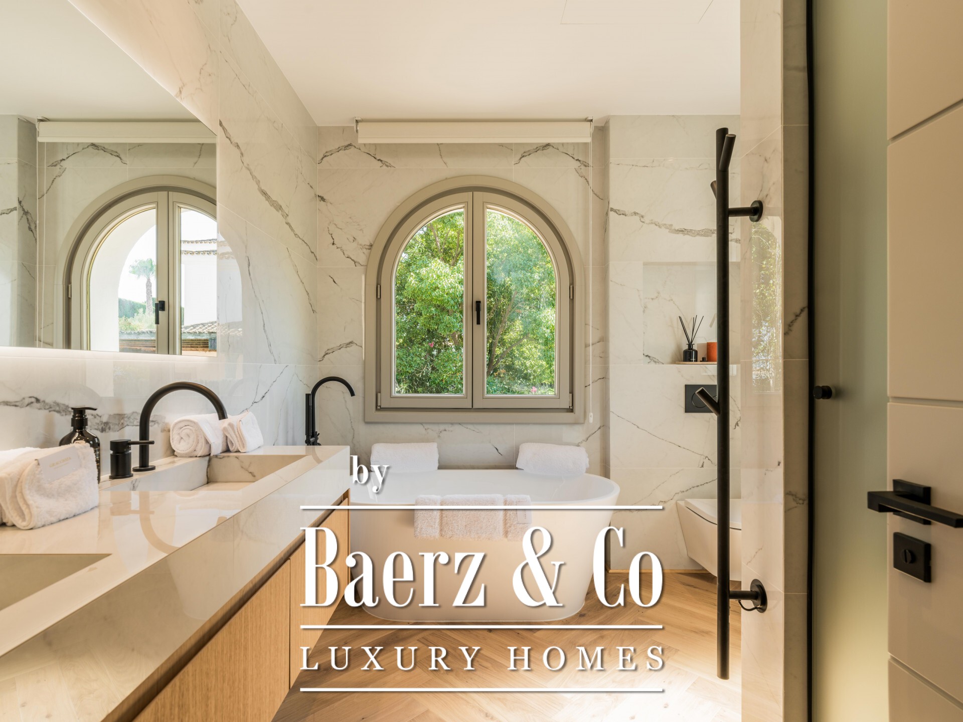 The garden level houses a versatile space for leisure, including a games room, cinema, bar, and four further bedrooms, three with private bathrooms. A two-storey pool house with barbecue encourages relaxed entertaining amid shaded greenery or evening light. Throughout the villa, underfloor heating and air conditioning maintain comfort, while amenities include a sauna, Turkish bath, saltwater pool, wine cellar, and security within a gated community.