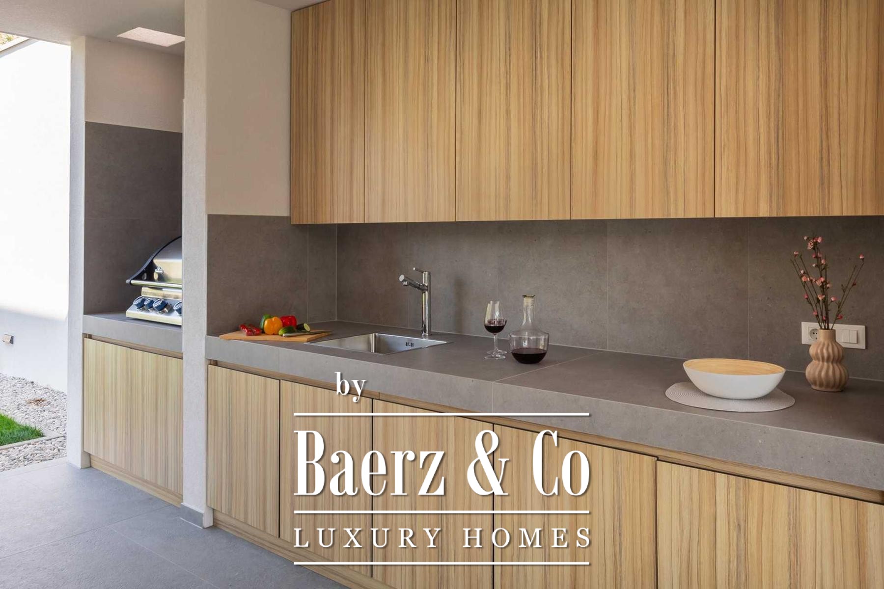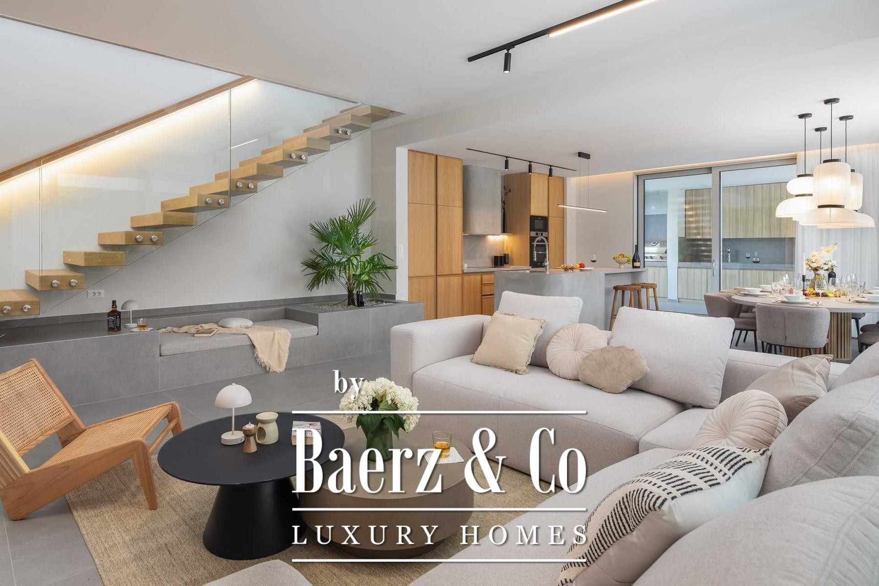 Ascending to the upper floor, four bedrooms each offer en-suite bathrooms, affording personal space and calm. Design details blend seamlessly with high-quality materials, evoking both comfort and clarity. Outdoors, the garden is fully fenced for peace of mind and features a children’s play area, bocce court, and private parking.