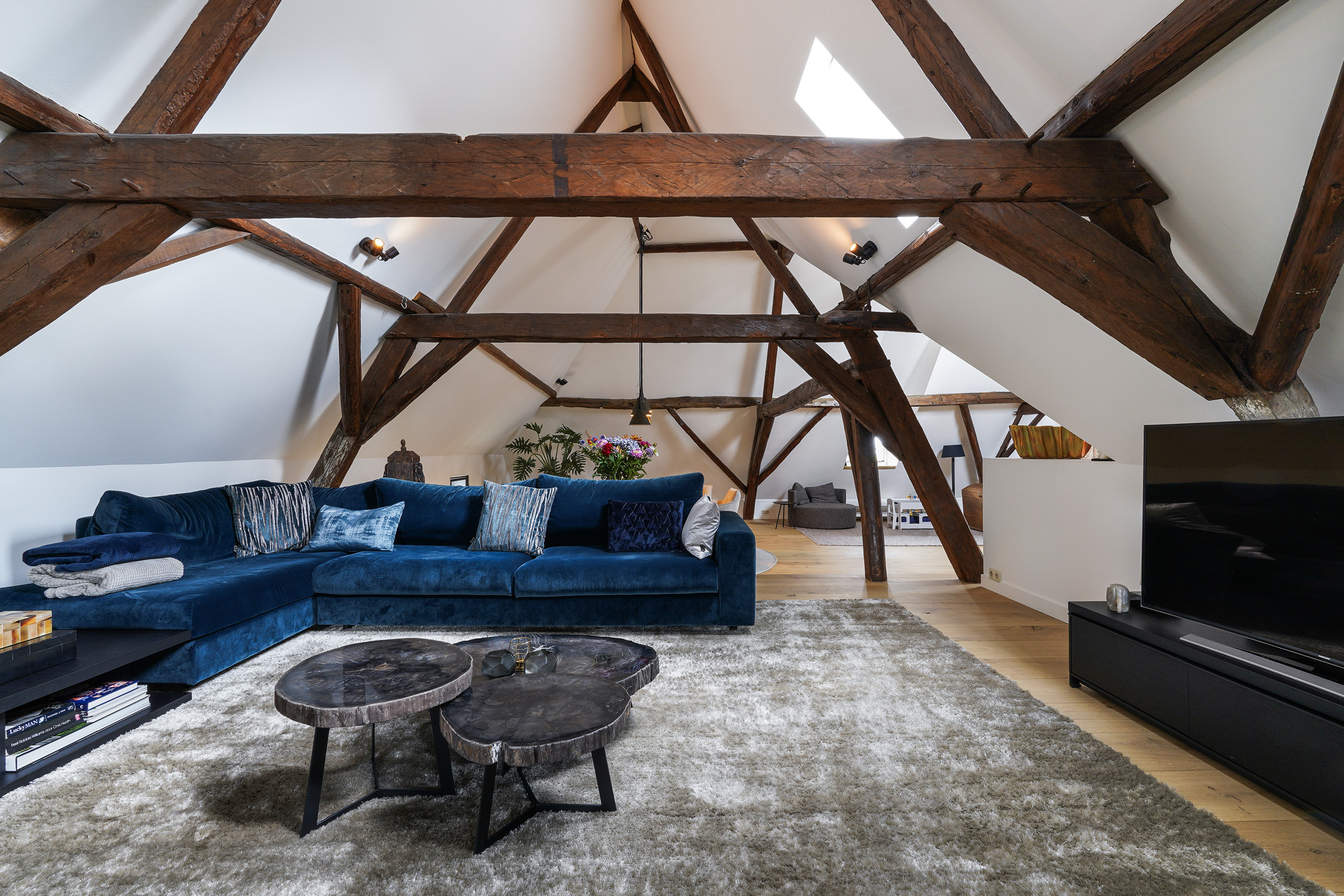 The living room, measuring nearly 90 m², feels even more spacious thanks to the high vaulted ceiling. The roof is insulated and beautifully finished with white plaster between the sturdy wooden beams. Combined with the height differences, the wooden floor and the pellet stove, the result is a living area that feels both grand and inviting.