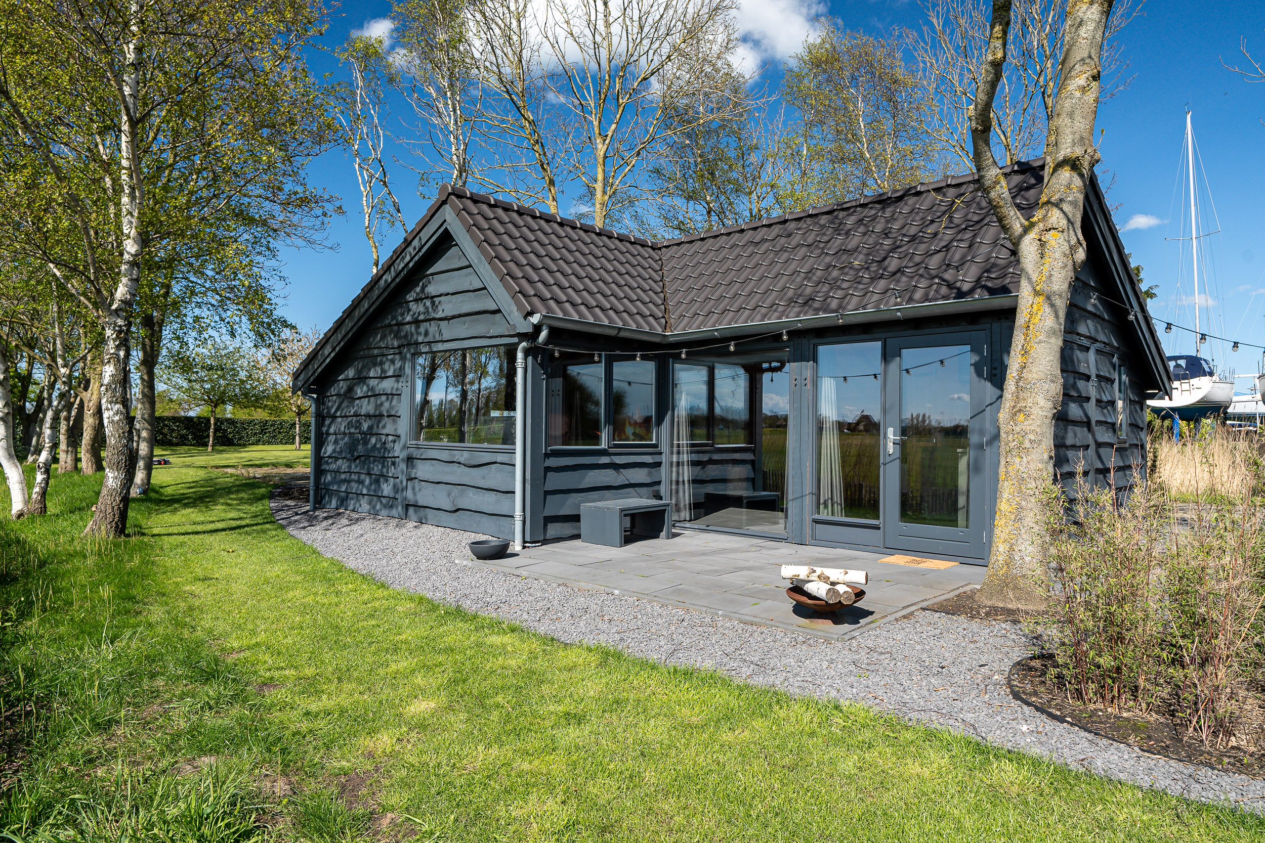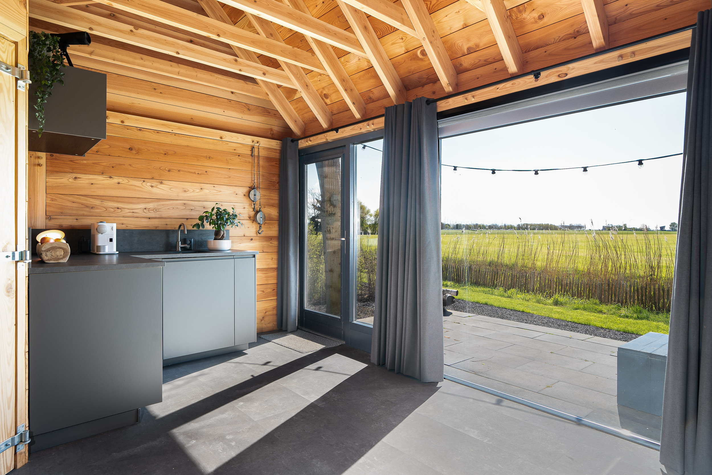 A recently built fully insulated guesthouse, studio, or home office is located in the garden. It includes a kitchenette and bathroom, making it suitable for multiple uses. The large southwest-facing windows offer inspiring panoramic views of nature toward the IJsselmeer, with its ever-changing Frisian skies.