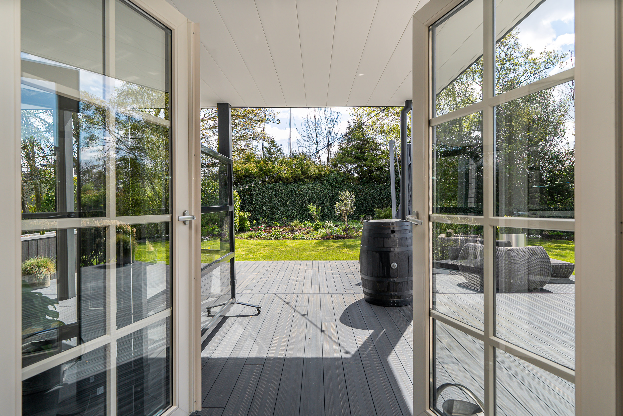 The architecturally designed garden, maintained by a robotic lawn mower, is easy to care for and features various fruit trees, hedges, and reed-lined waterways. The stylishly paved driveway and entrance gate mark the transition to the lush green surroundings.