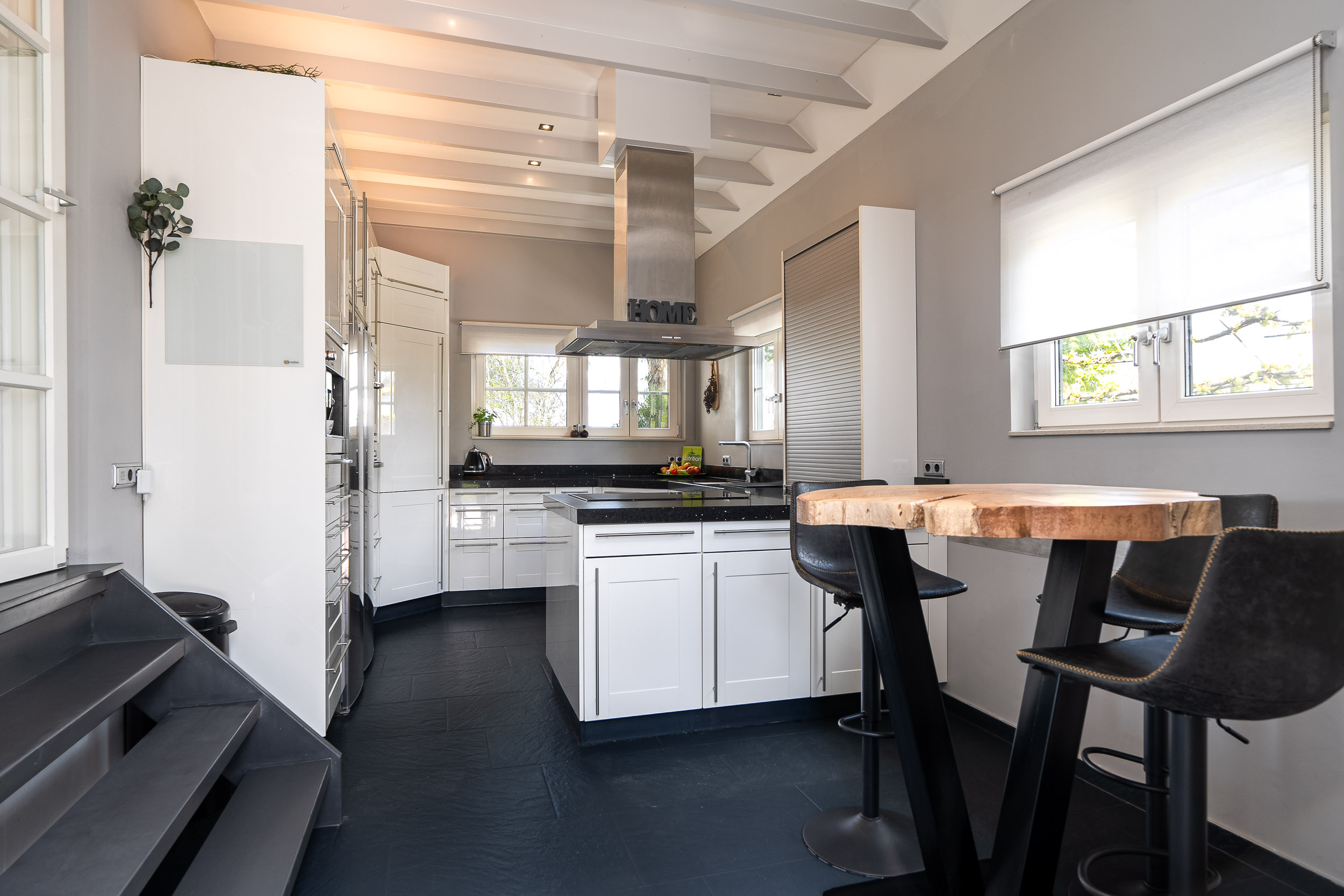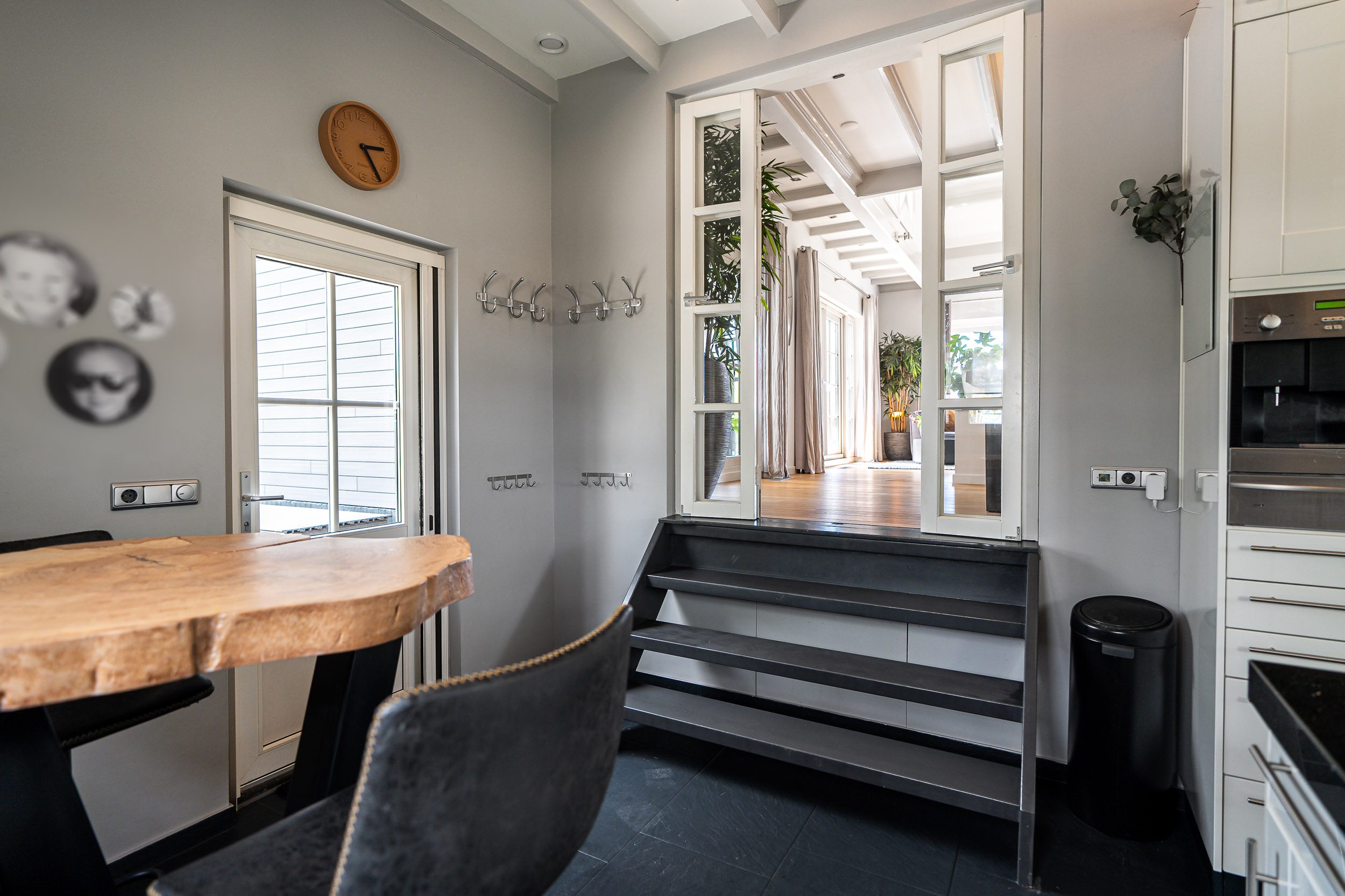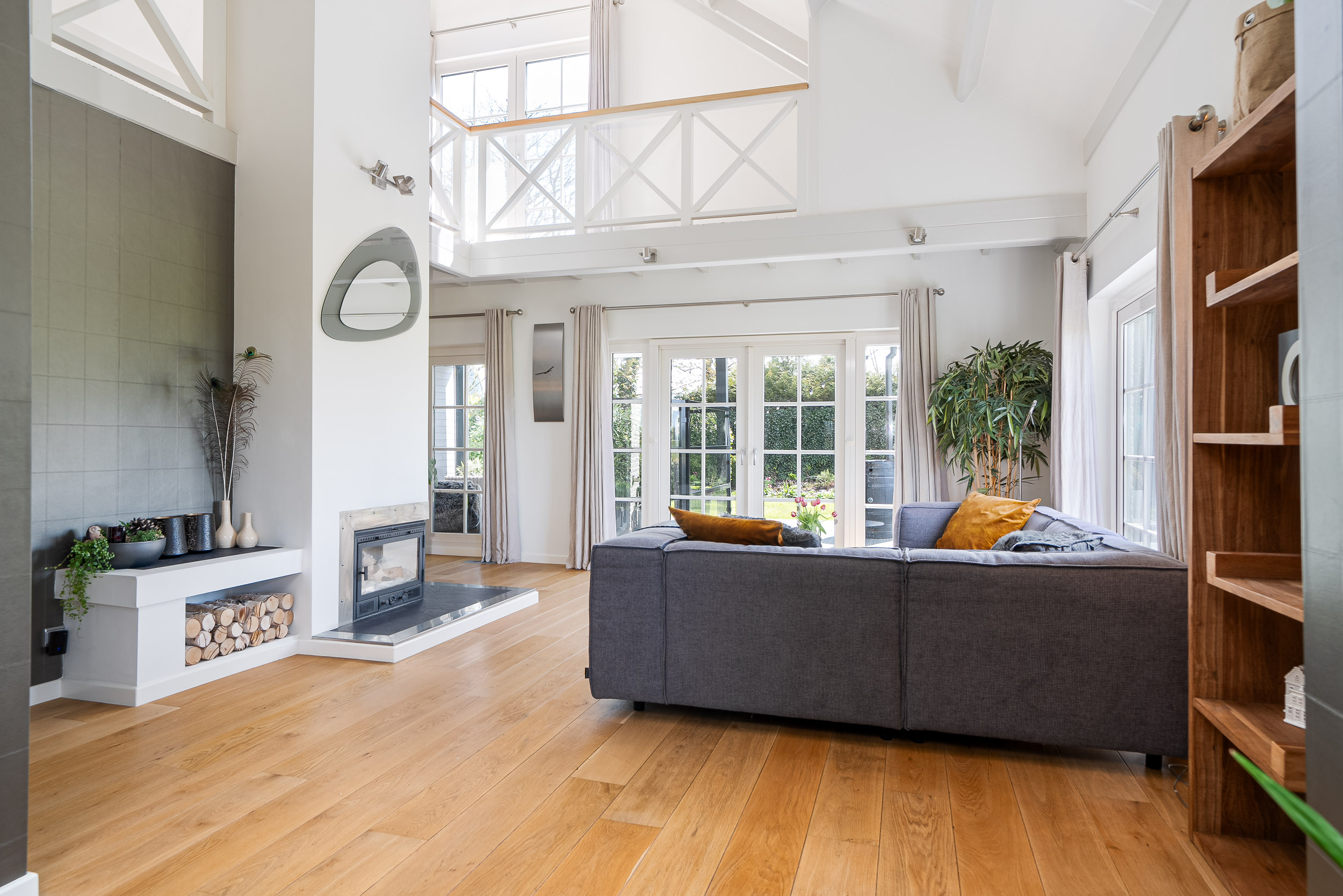 The living room is bathed in natural light due to the large windows and mezzanine, with each window offering views focused on the surrounding nature. The breathtaking panoramas never cease to amaze. The living room has various cozy corners, including a seating area around the wood-burning stove, an entertainment nook, and a dining area. A beautiful warm wooden floor with warm air heating runs throughout, and the French doors open directly onto the inviting veranda and terrace, which ensure complete privacy.